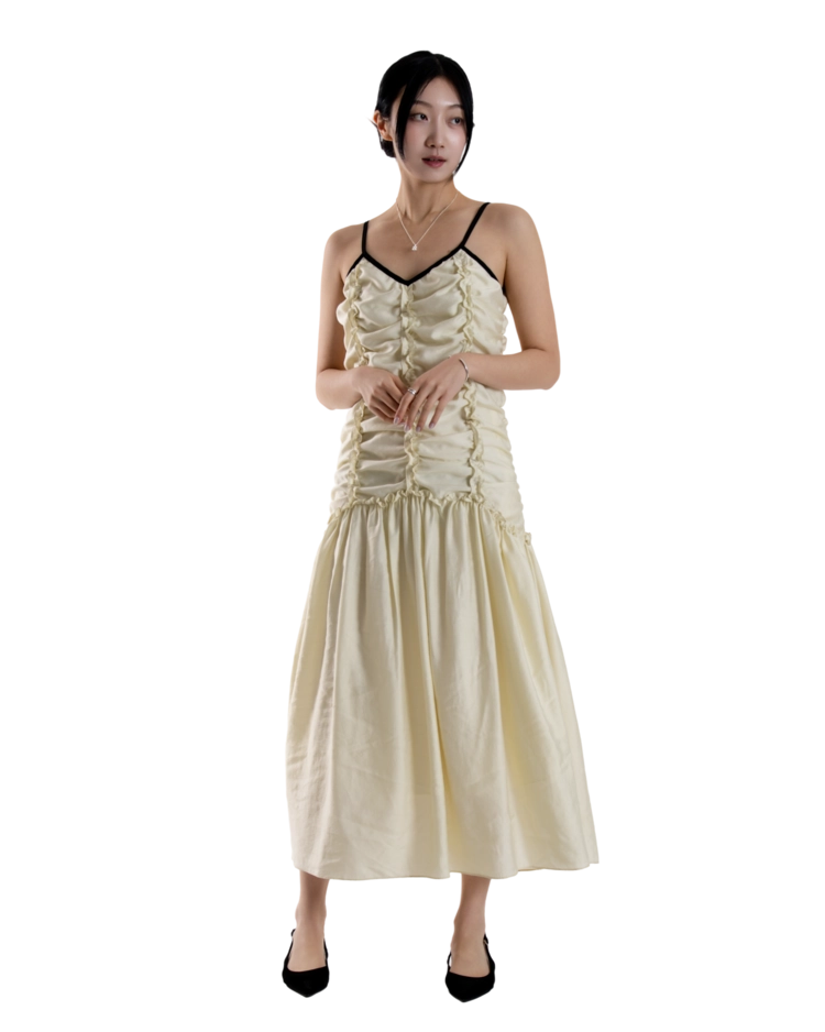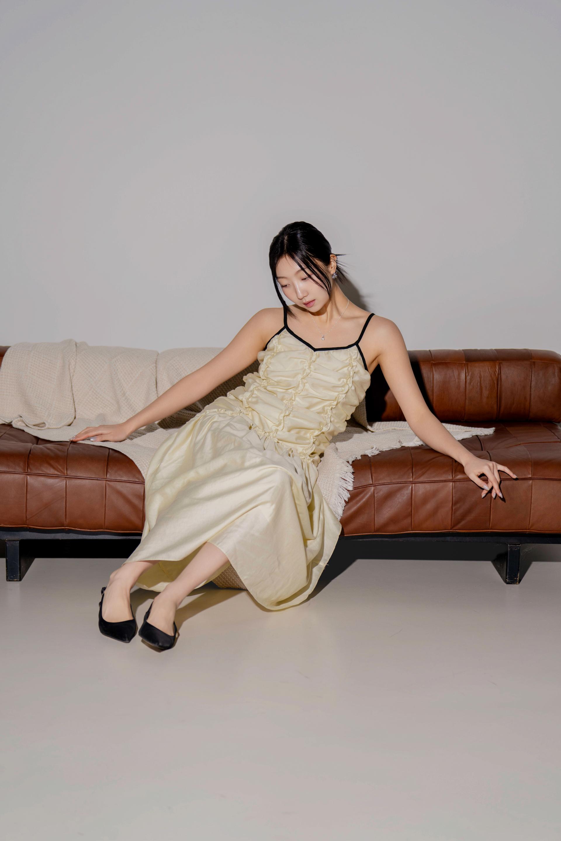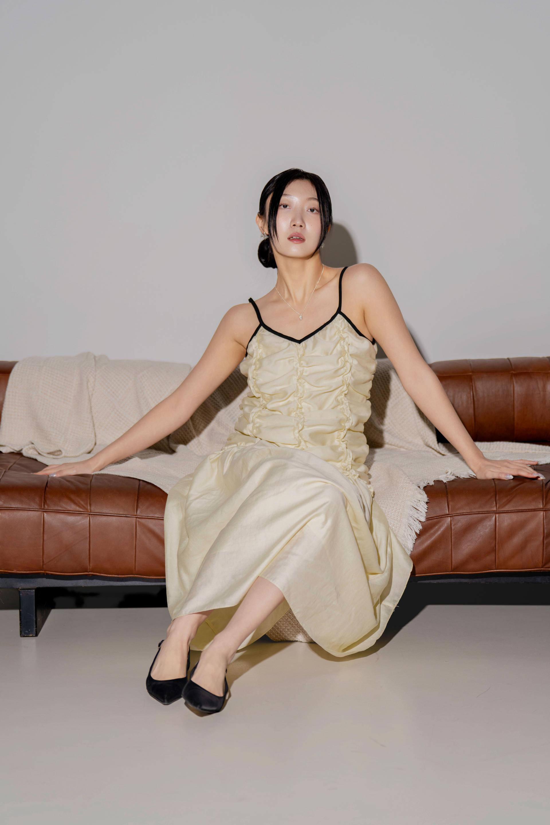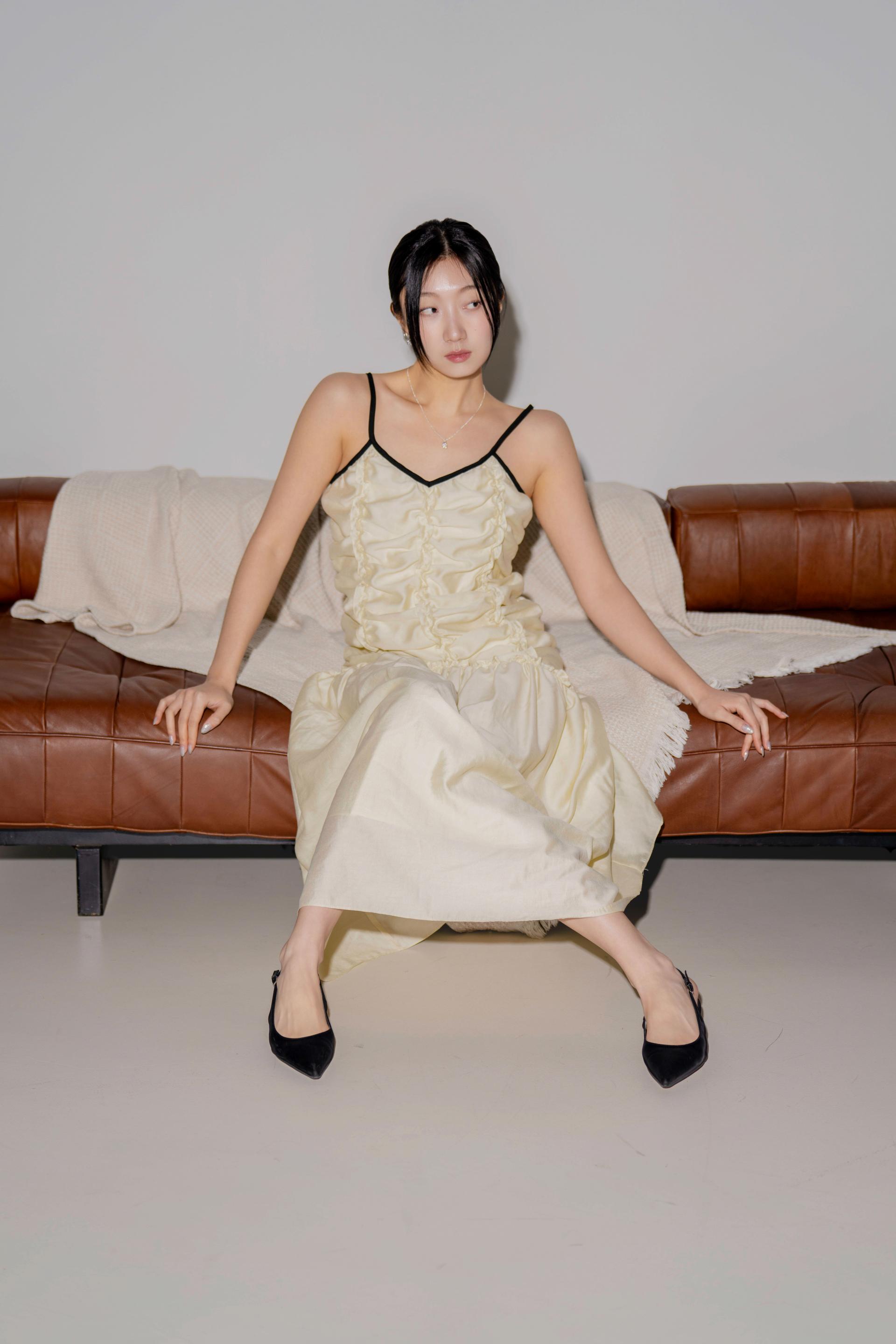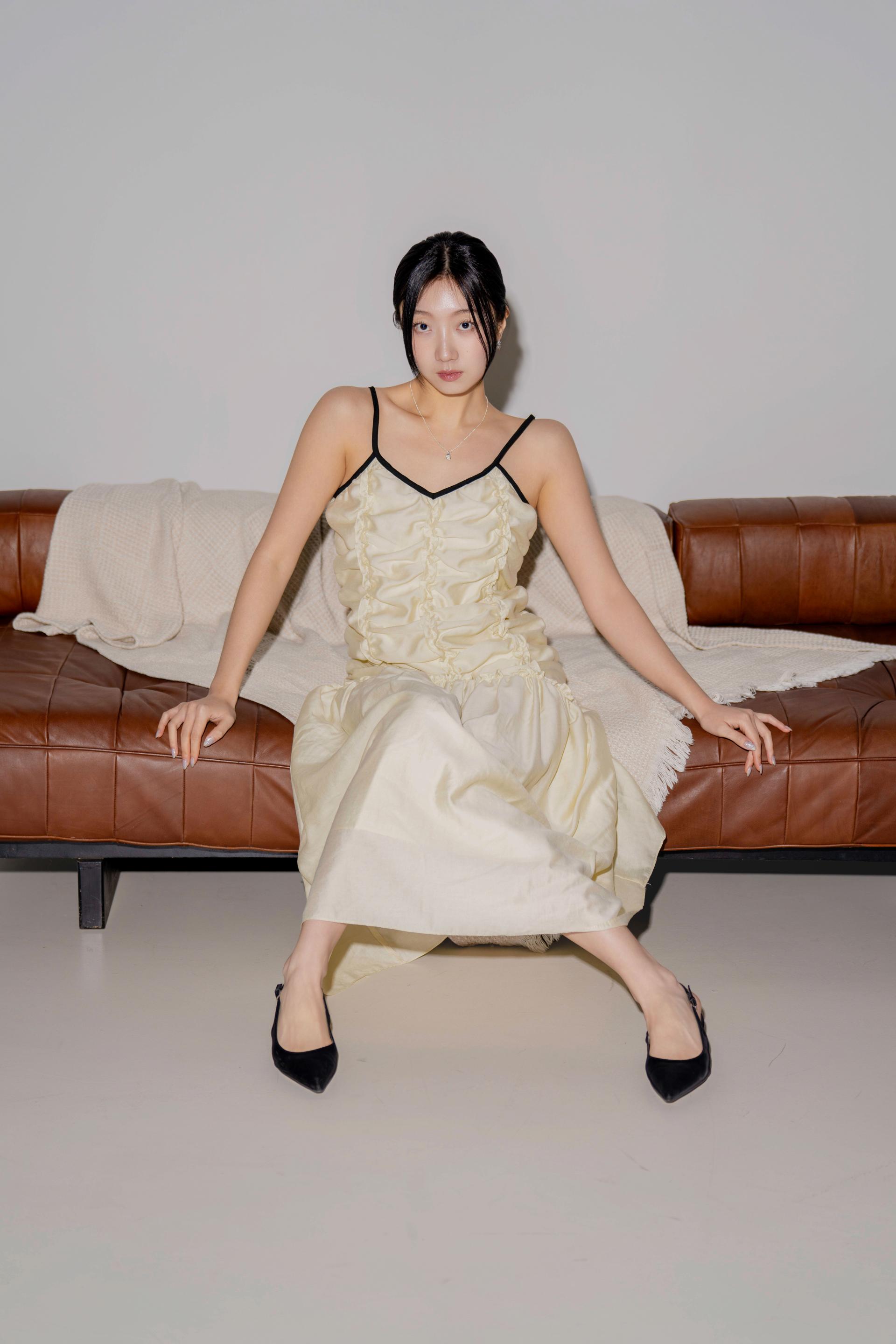 • 끈과 원피스 본체의 배색이 자연스럽게 어우러져 있으며, 전체적인 셔링 디테일이 단품만으로도 강한 아이덴티티를 표현해 줍니다. 특히, 큼지막한 셔링이 굵게 잡혀 있어 풍성하면서도 실루엣이 부해 보이지 않도록 세심하게 디자인되었습니다. 셔링 사이사이에 세로결로 들어간 레이스 디테일 덕분에 더욱 고급스럽고 세련된 인상을 줍니다.