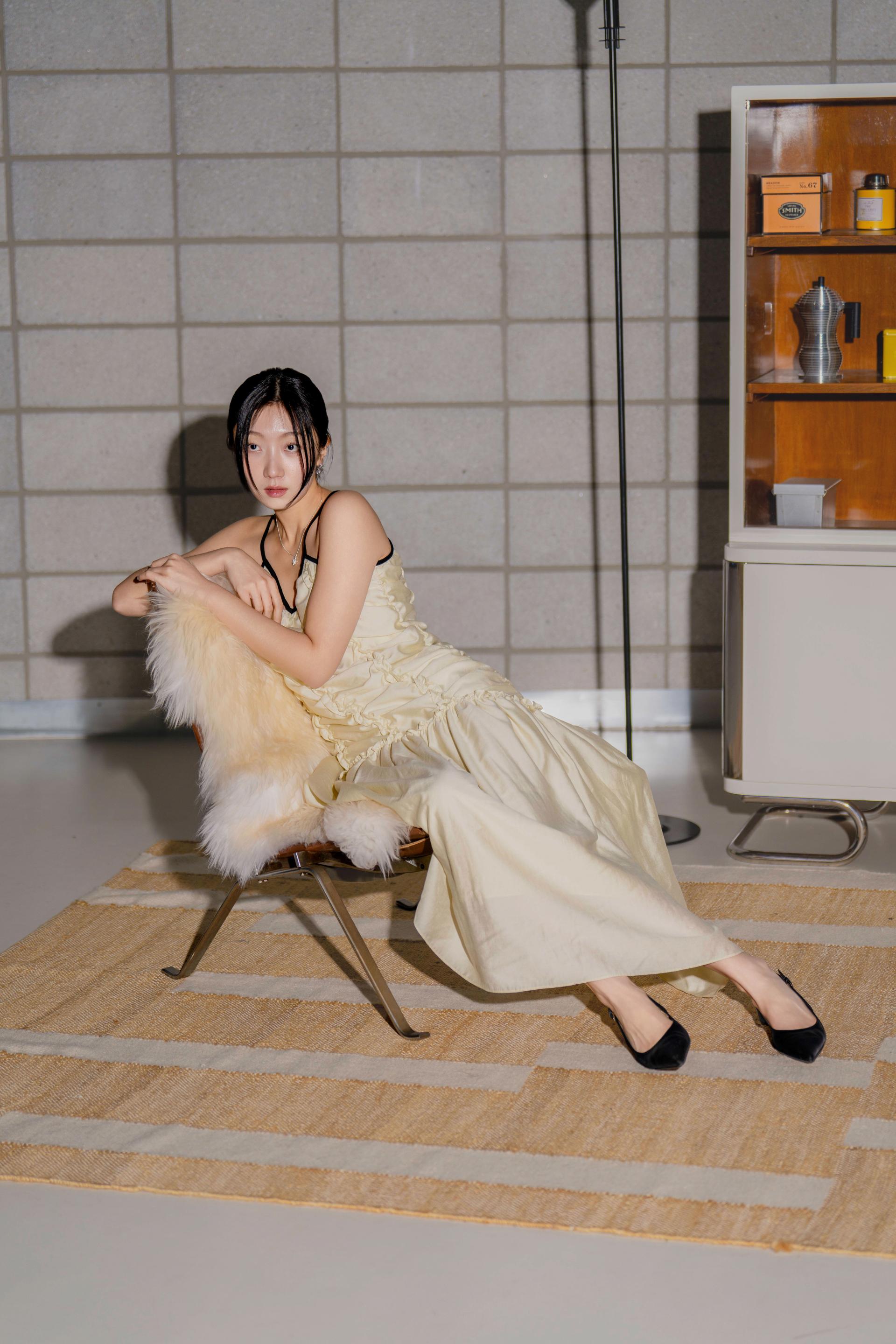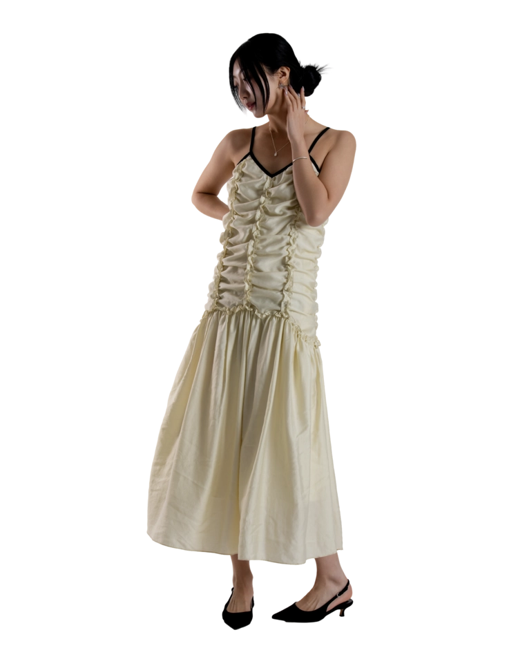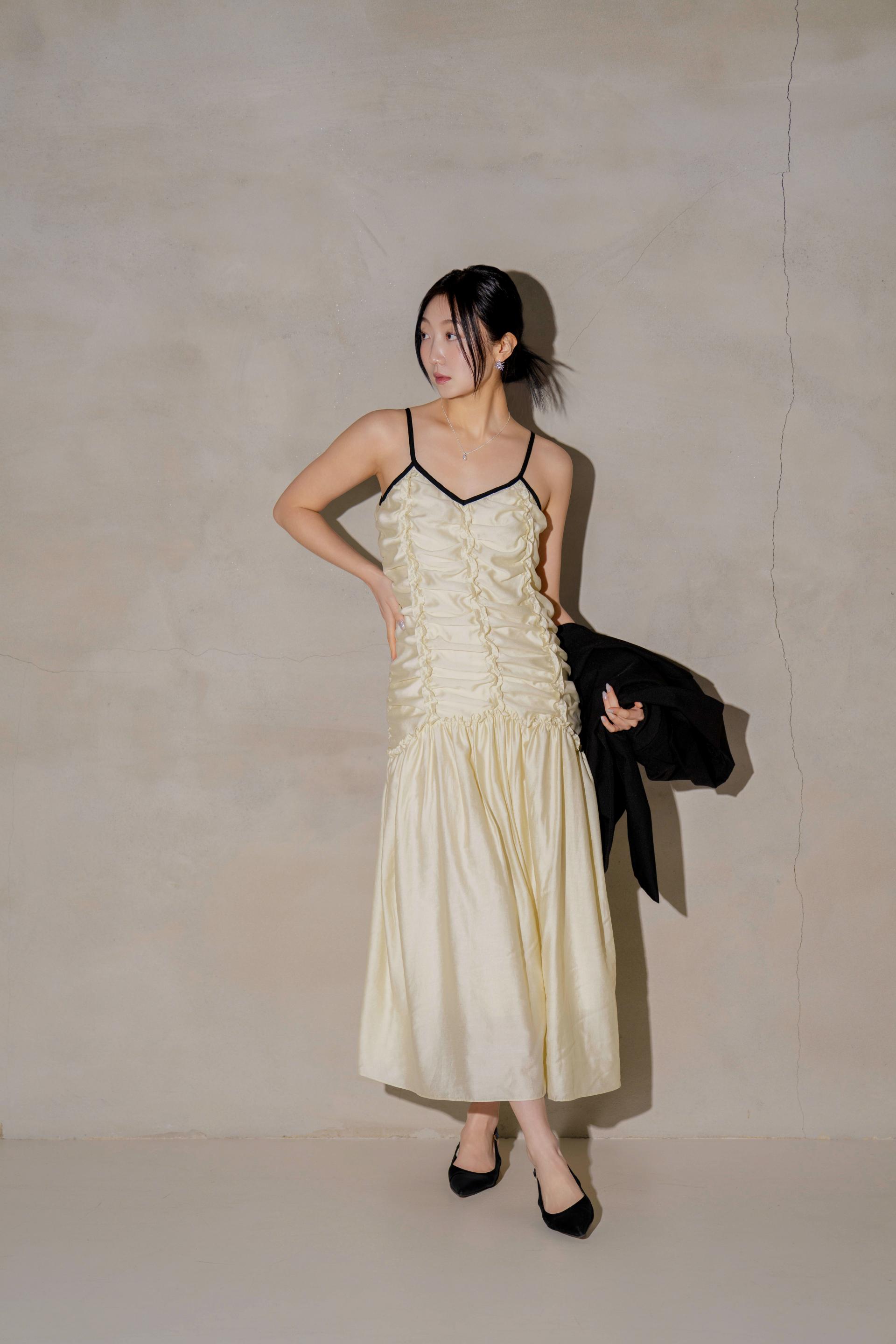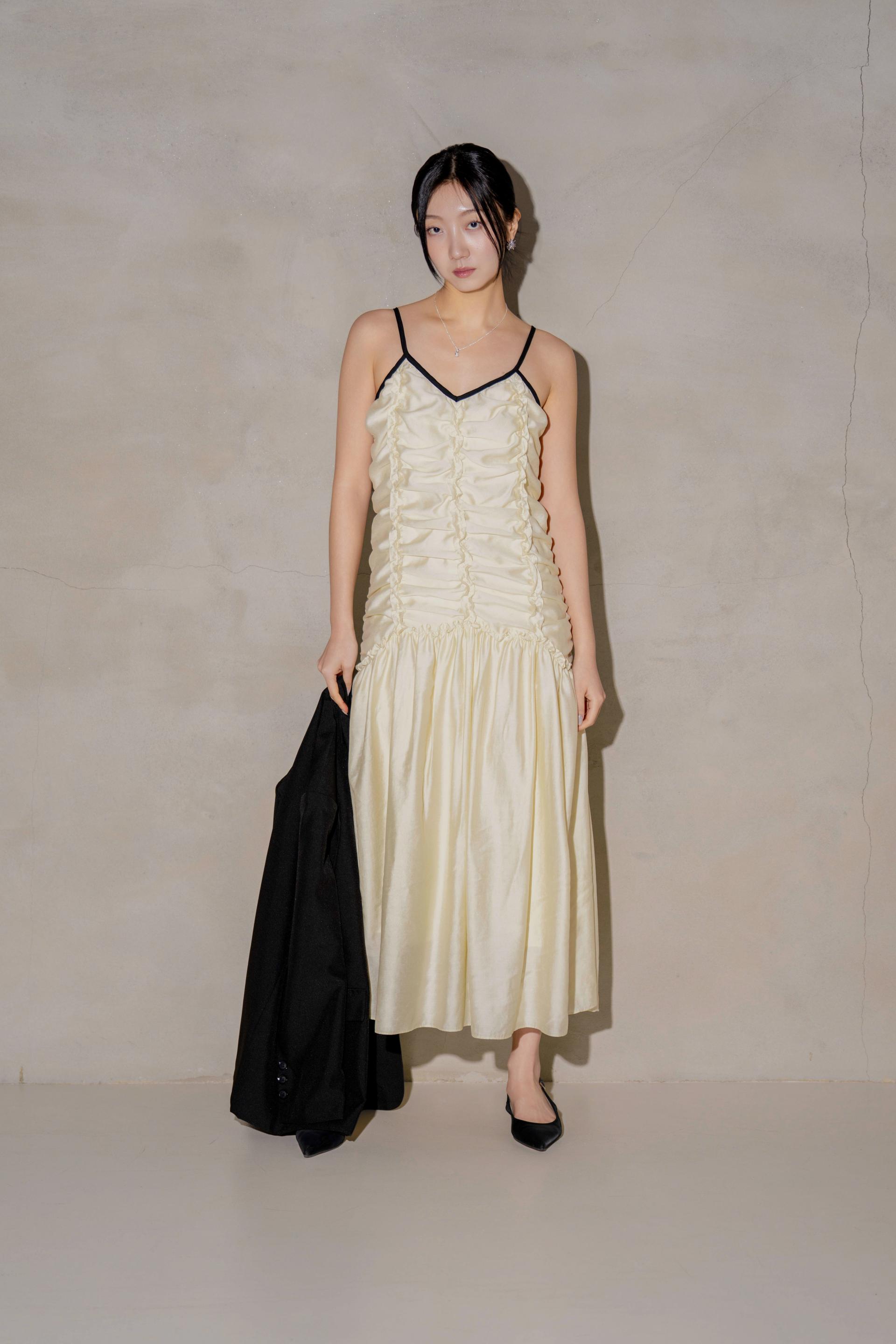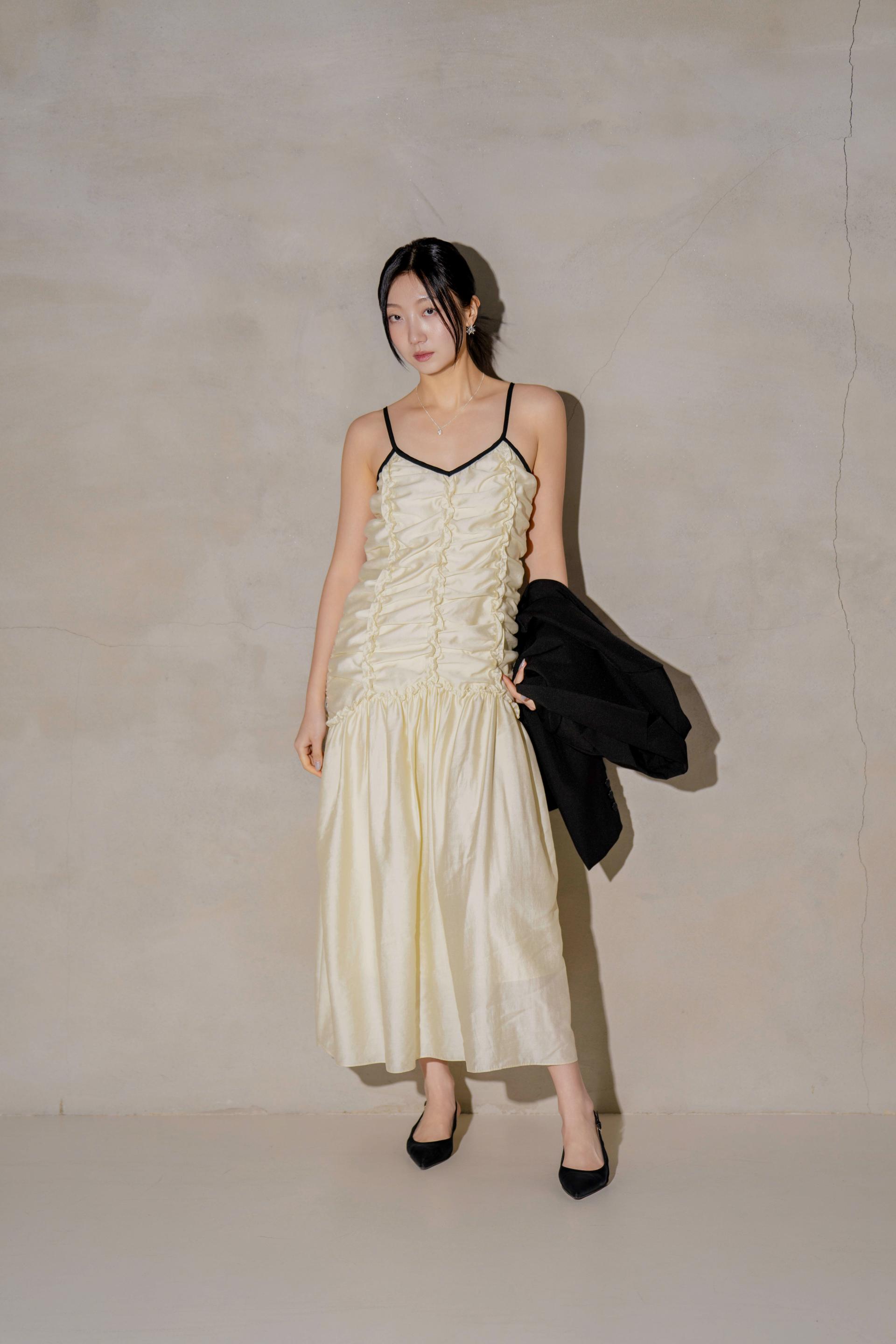 • 끈과 원피스 본체의 배색이 자연스럽게 어우러져 있으며, 전체적인 셔링 디테일이 단품만으로도 강한 아이덴티티를 표현해 줍니다. 특히, 큼지막한 셔링이 굵게 잡혀 있어 풍성하면서도 실루엣이 부해 보이지 않도록 세심하게 디자인되었습니다. 셔링 사이사이에 세로결로 들어간 레이스 디테일 덕분에 더욱 고급스럽고 세련된 인상을 줍니다.