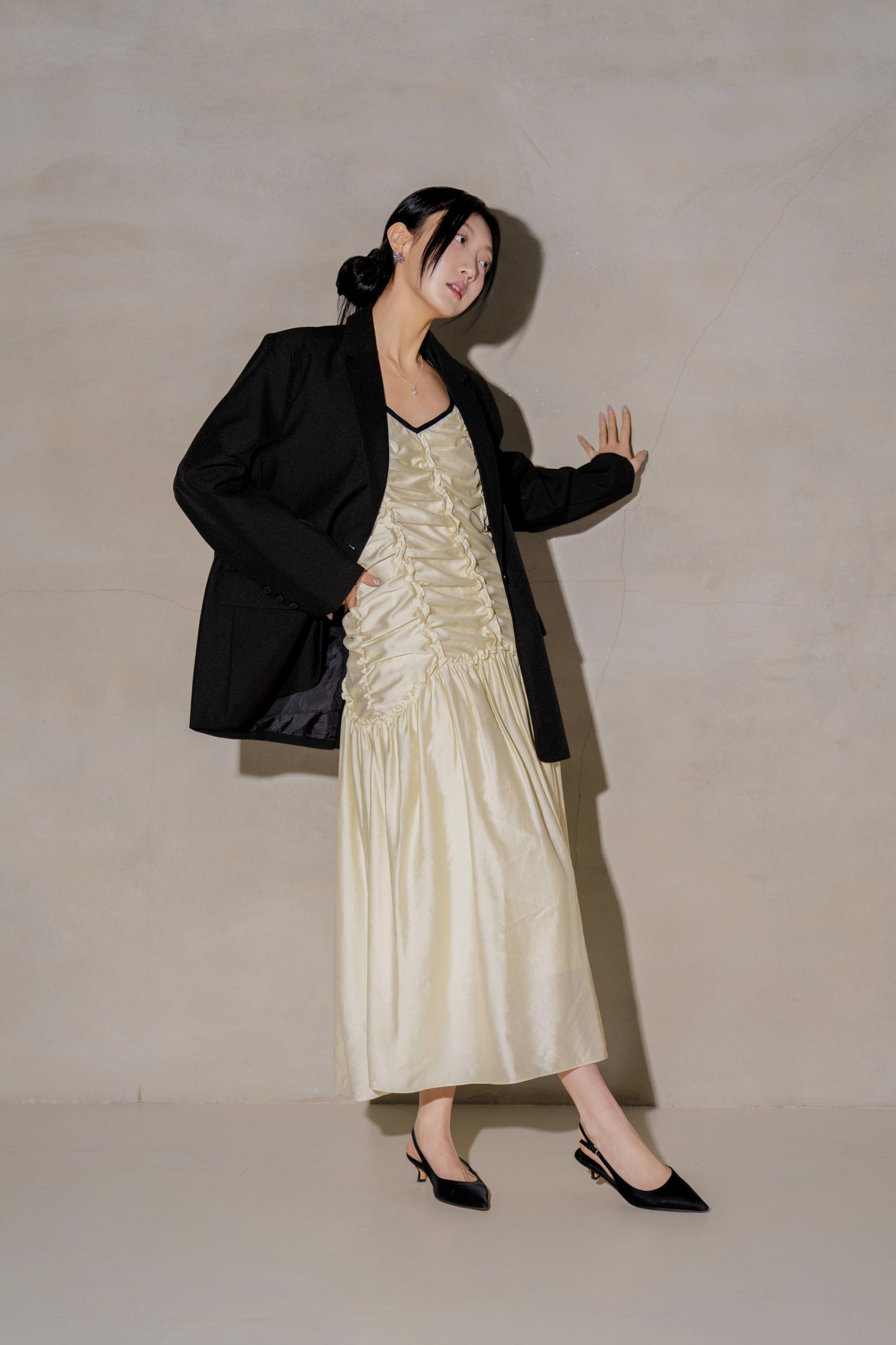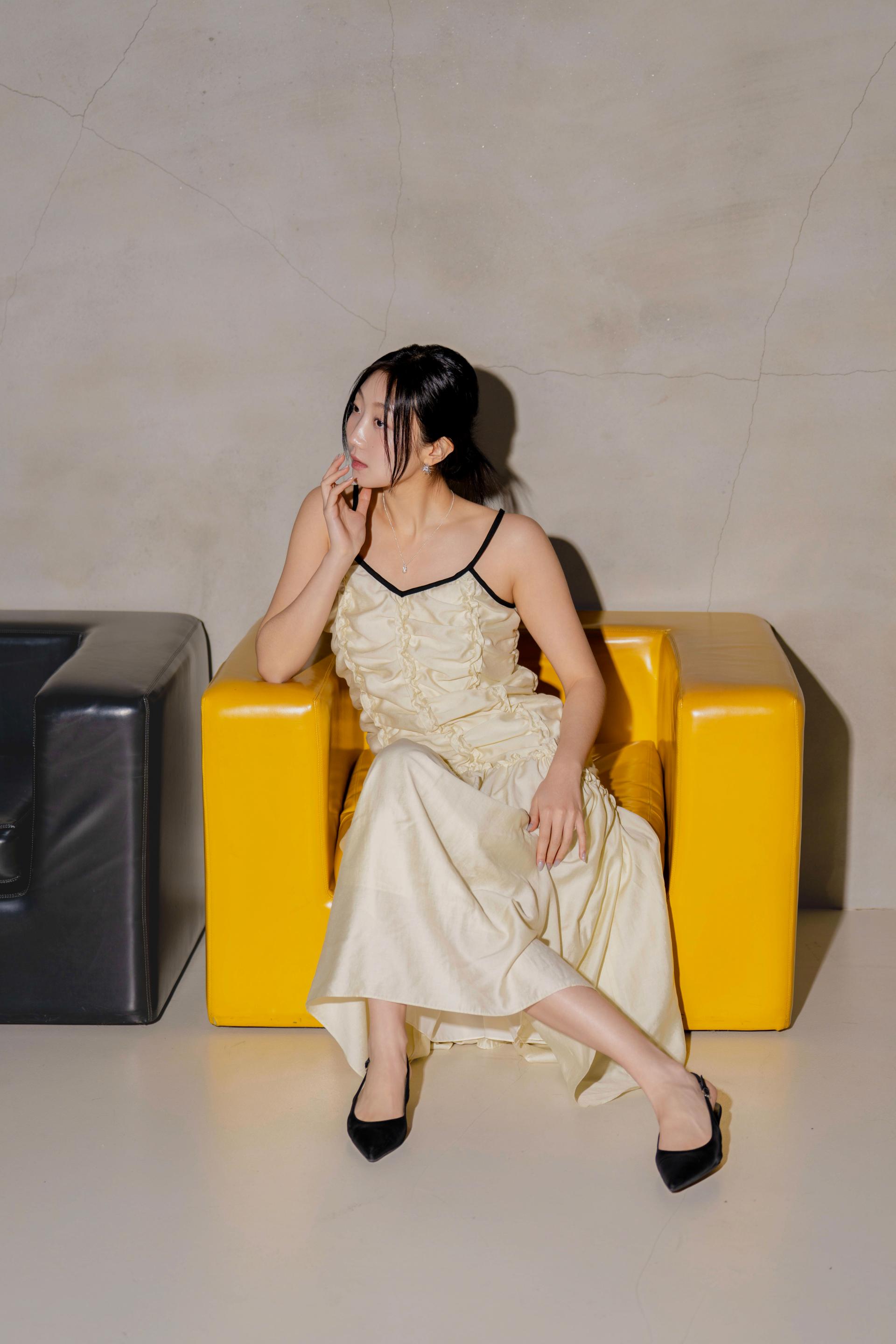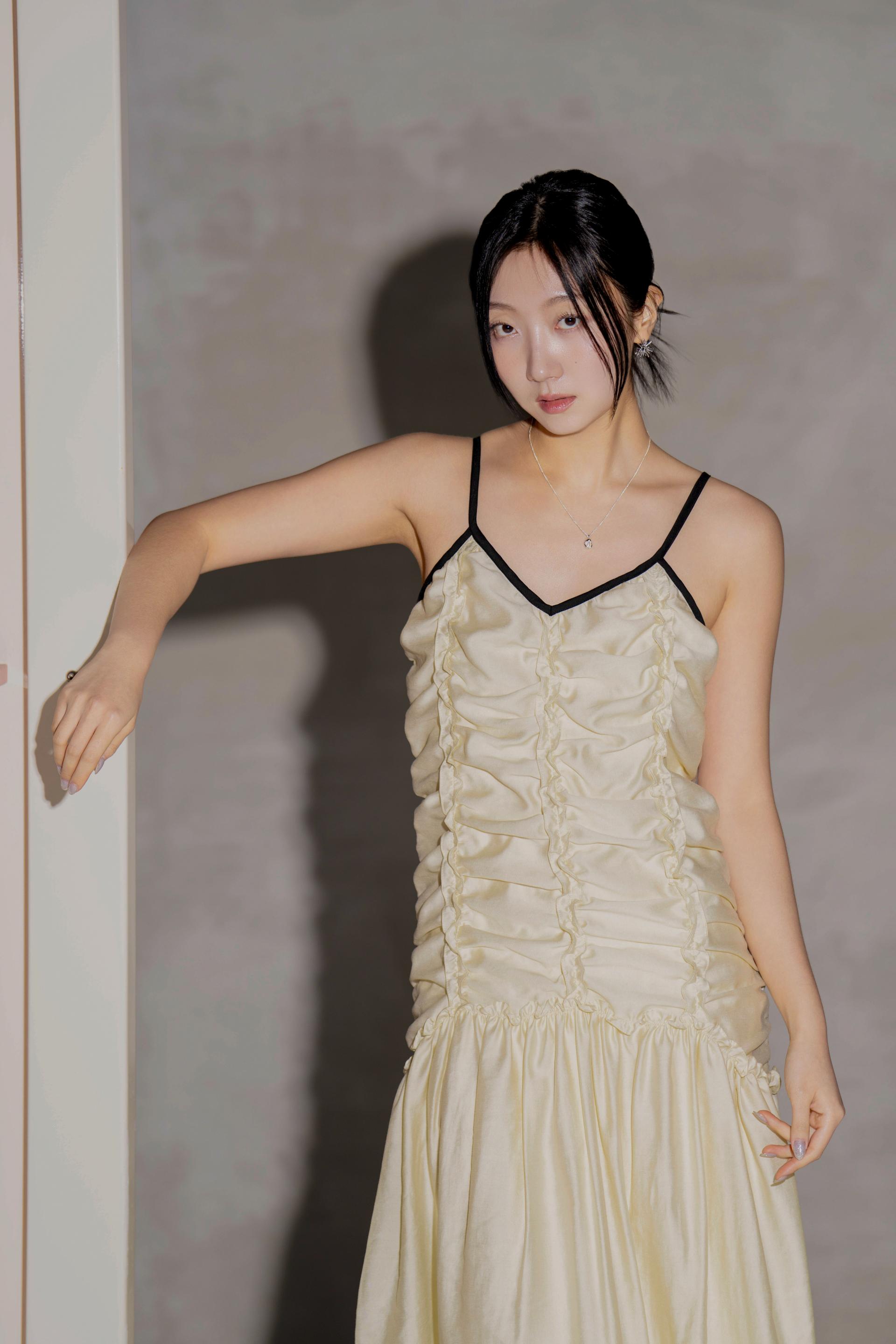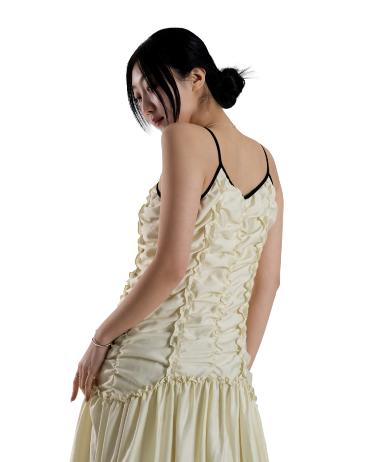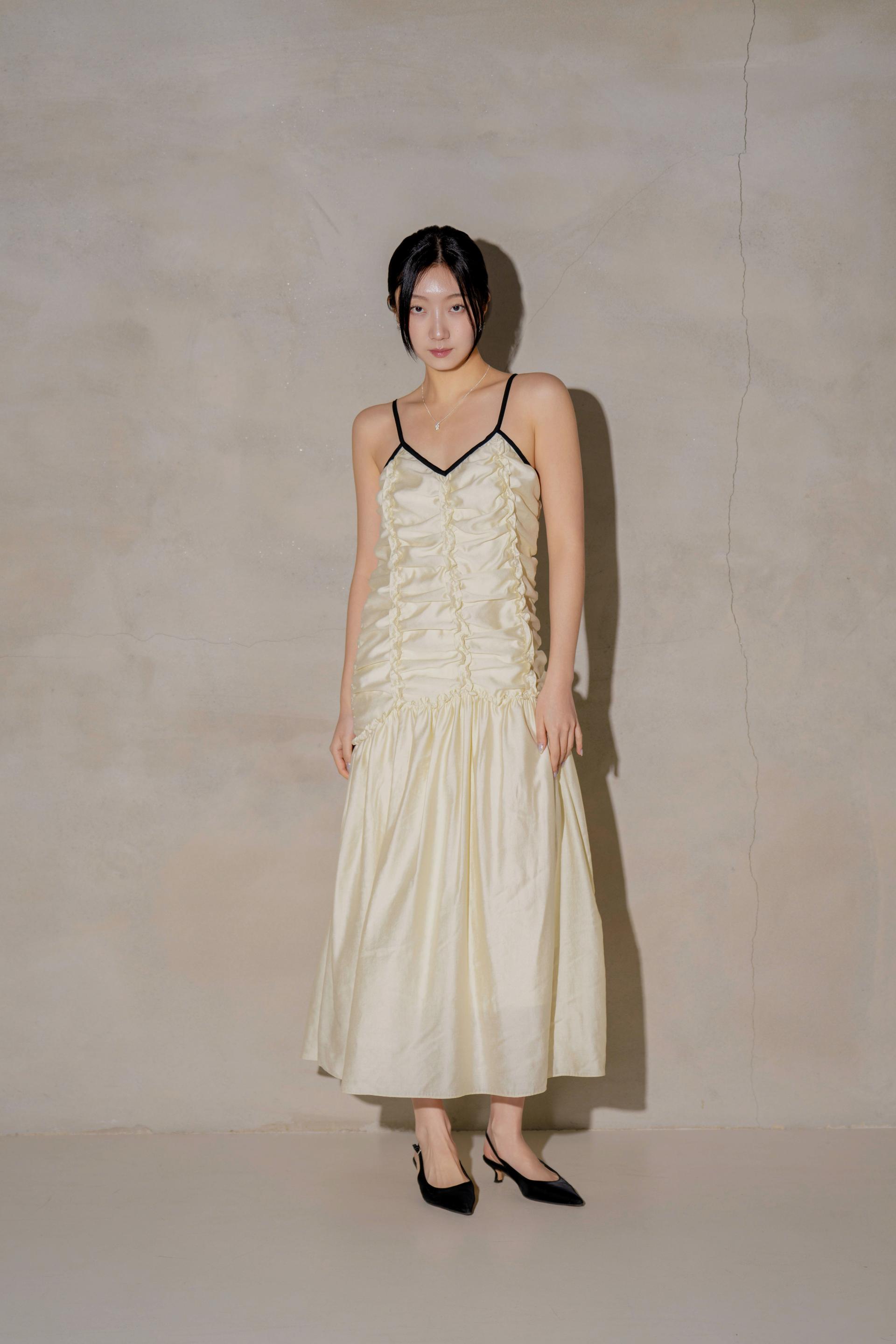 • 끈과 원피스 본체의 배색이 자연스럽게 어우러져 있으며, 전체적인 셔링 디테일이 단품만으로도 강한 아이덴티티를 표현해 줍니다. 특히, 큼지막한 셔링이 굵게 잡혀 있어 풍성하면서도 실루엣이 부해 보이지 않도록 세심하게 디자인되었습니다. 셔링 사이사이에 세로결로 들어간 레이스 디테일 덕분에 더욱 고급스럽고 세련된 인상을 줍니다.