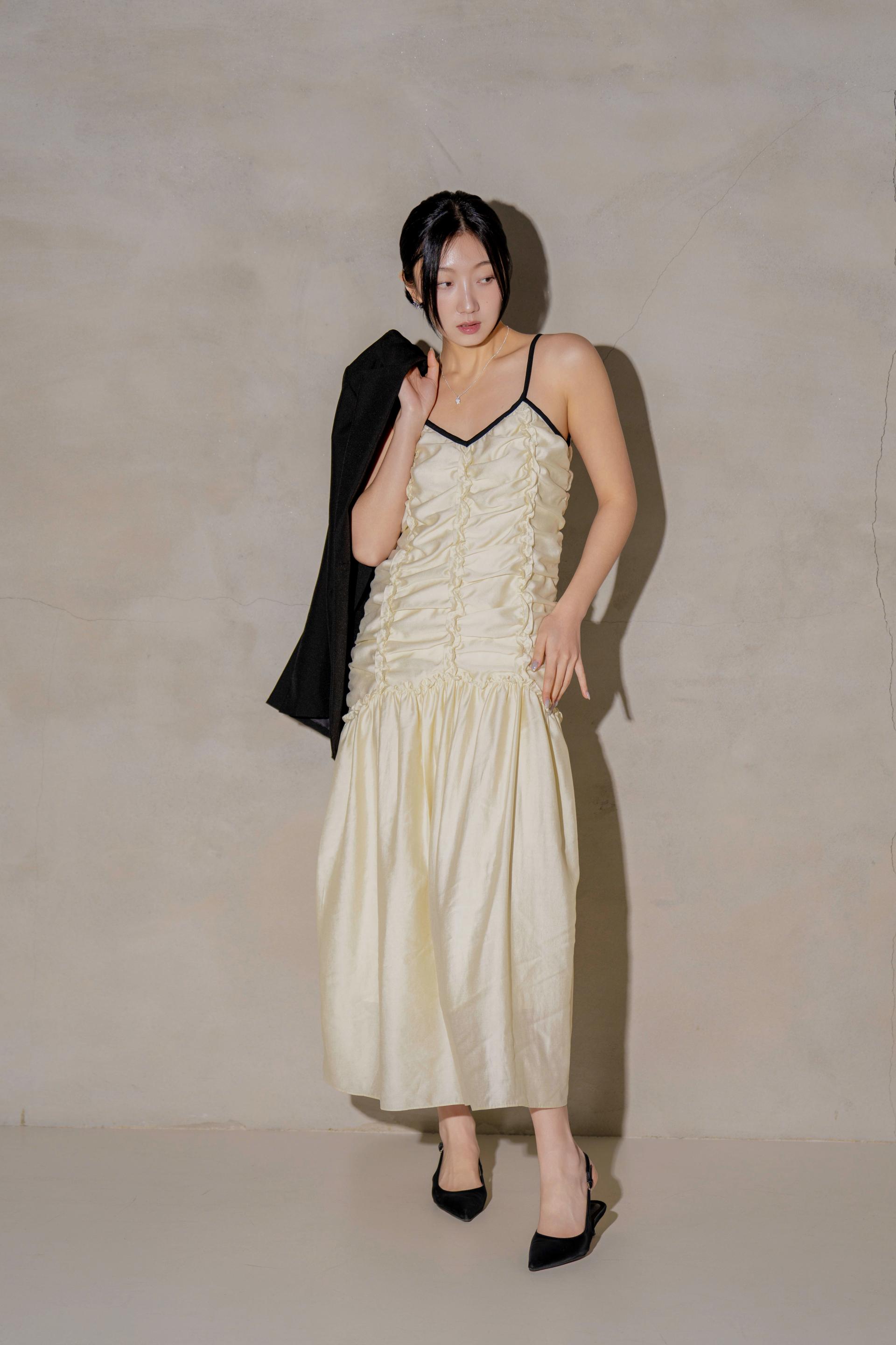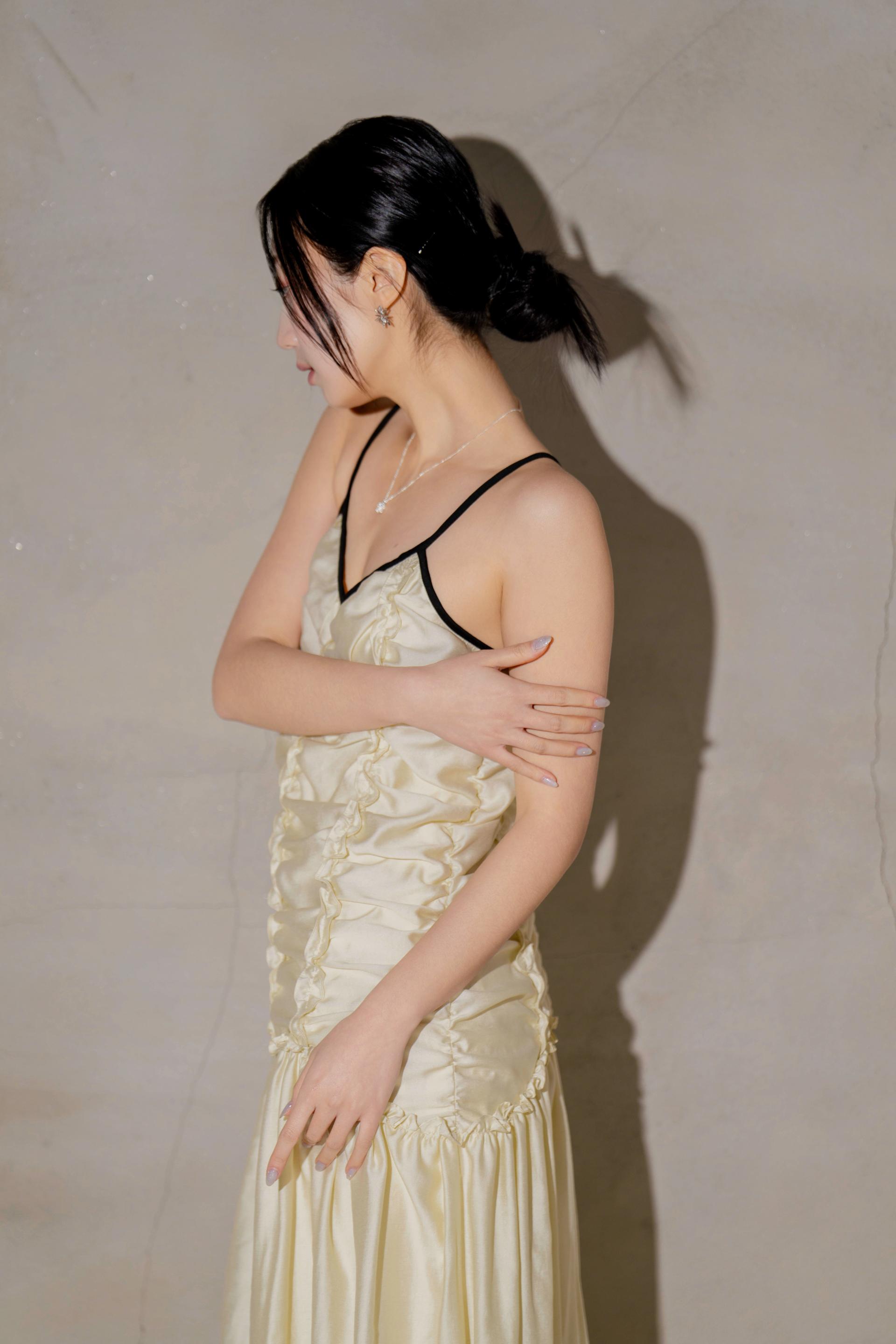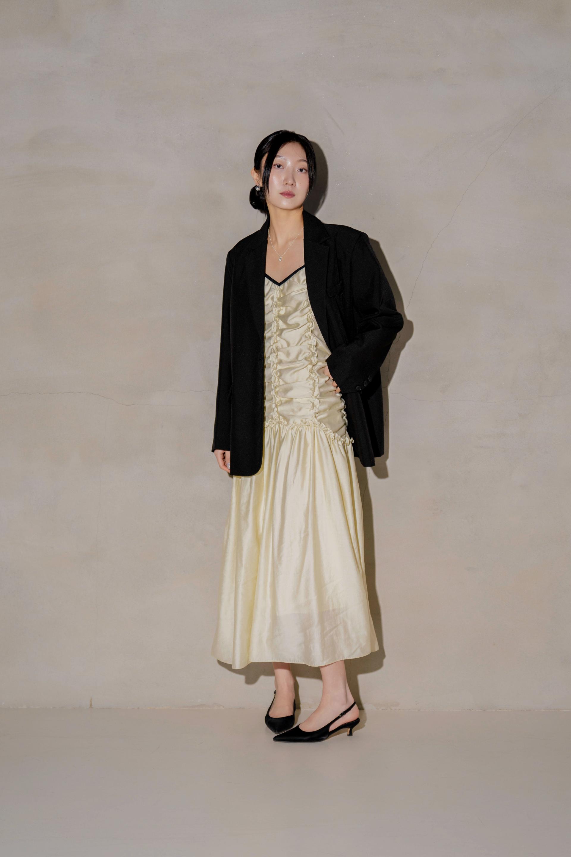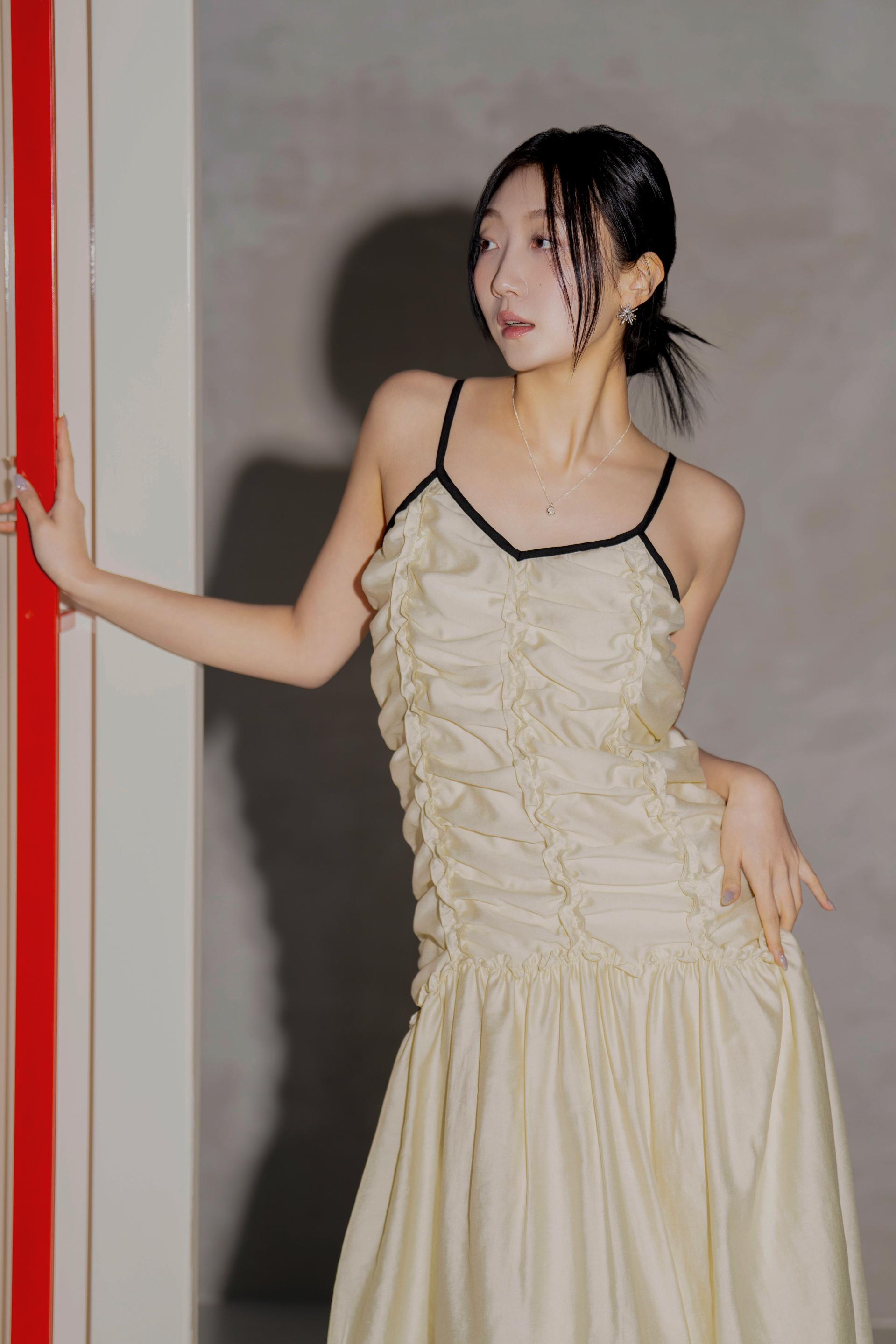 • 끈과 원피스 본체의 배색이 자연스럽게 어우러져 있으며, 전체적인 셔링 디테일이 단품만으로도 강한 아이덴티티를 표현해 줍니다. 특히, 큼지막한 셔링이 굵게 잡혀 있어 풍성하면서도 실루엣이 부해 보이지 않도록 세심하게 디자인되었습니다. 셔링 사이사이에 세로결로 들어간 레이스 디테일 덕분에 더욱 고급스럽고 세련된 인상을 줍니다.