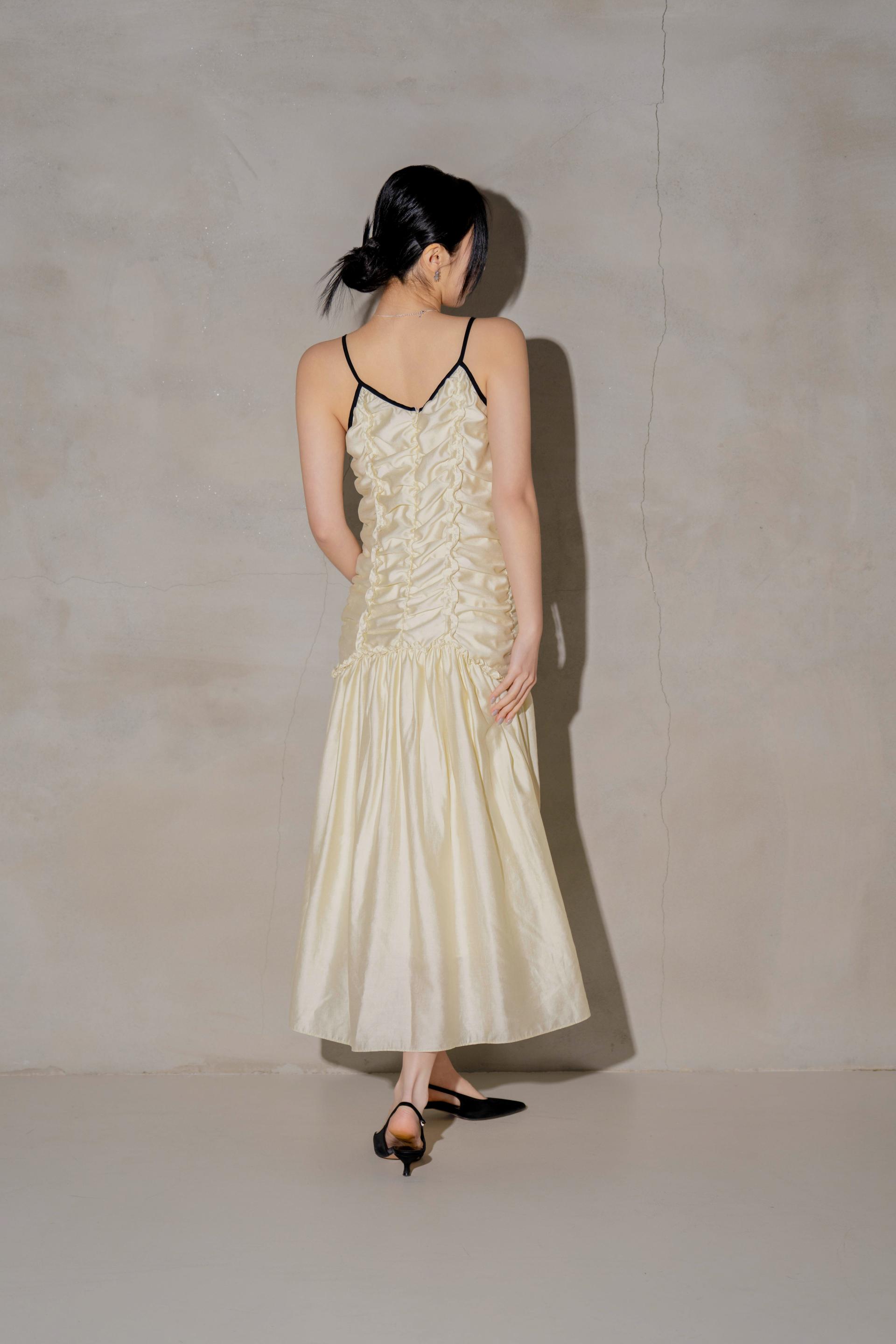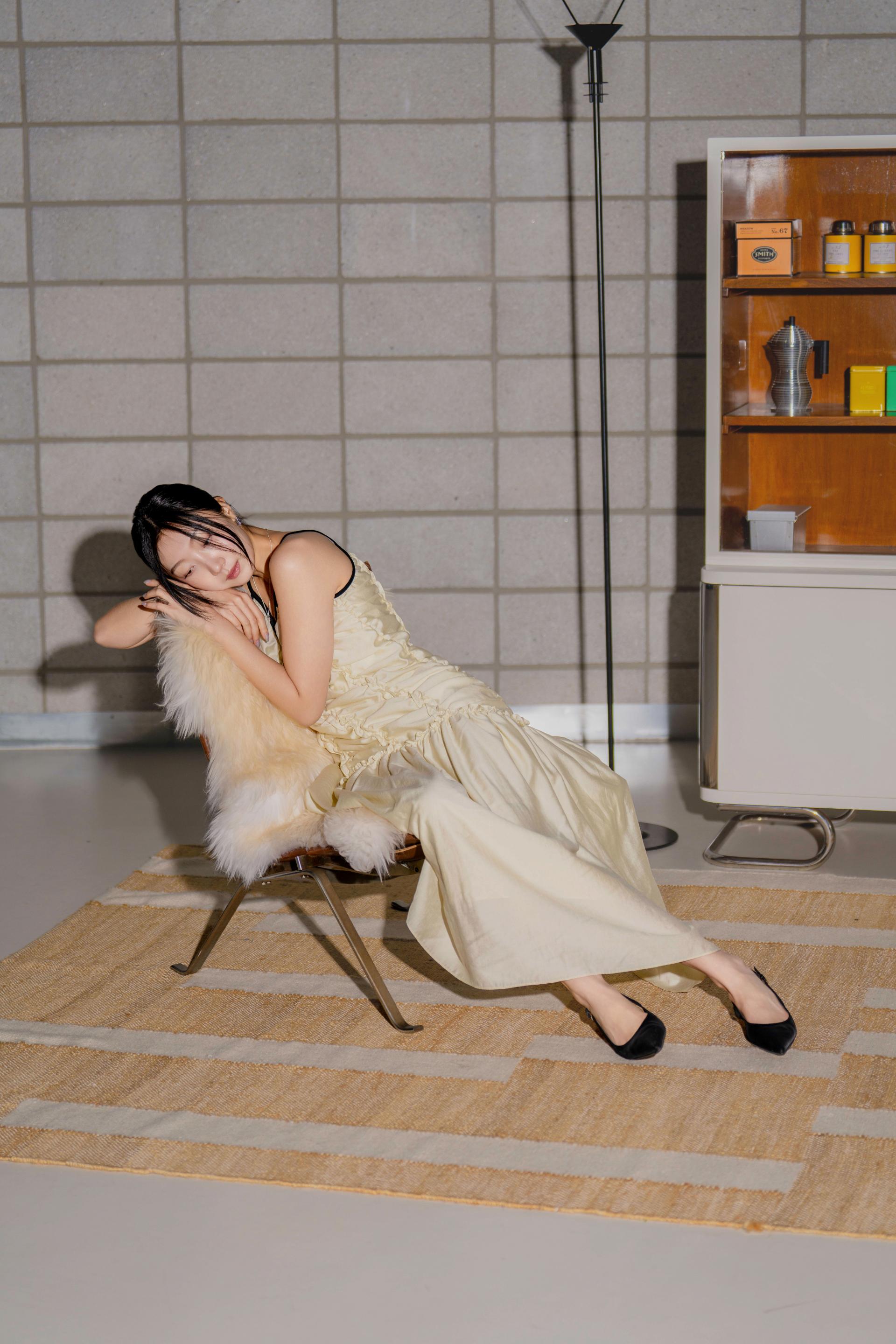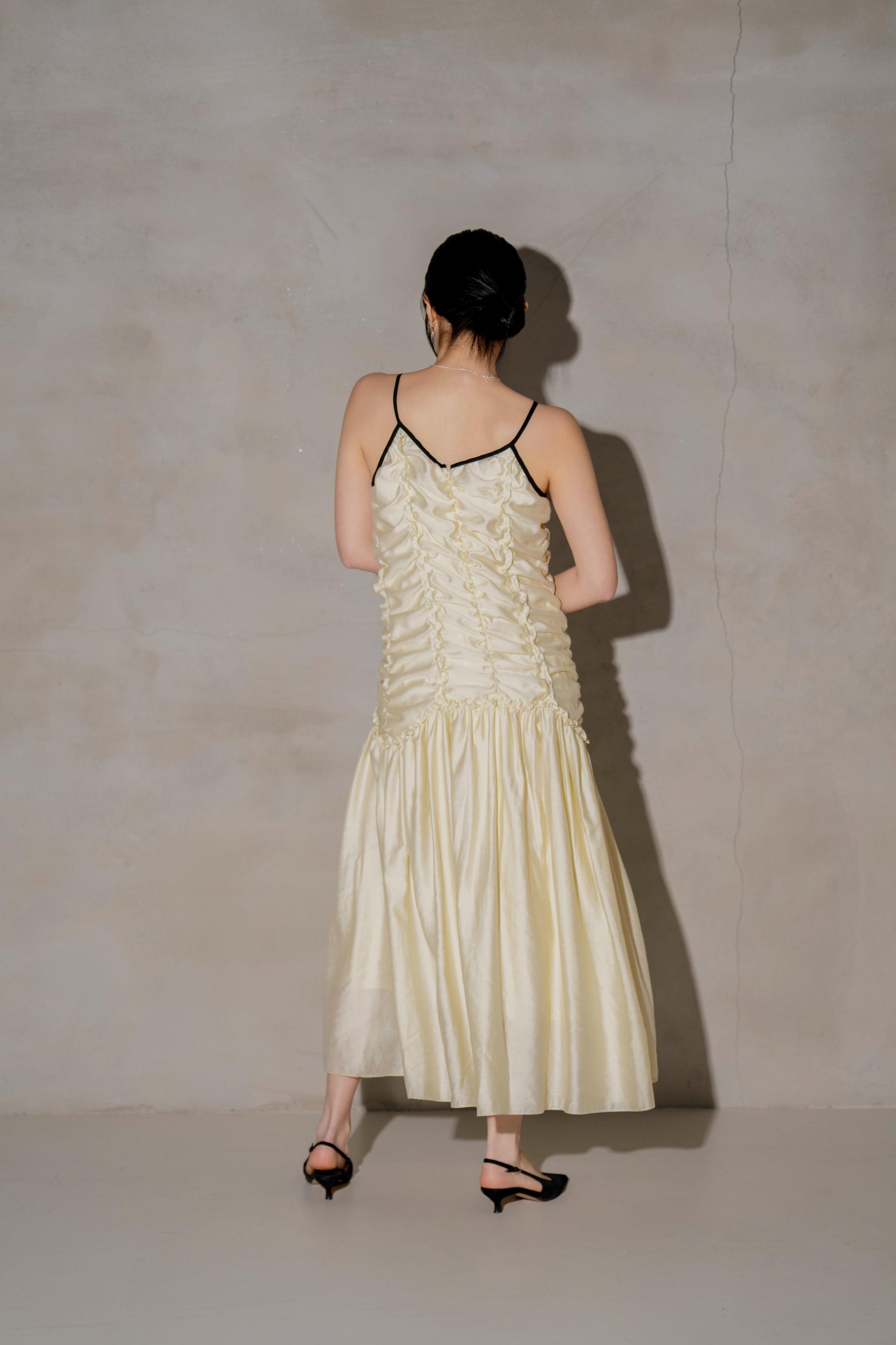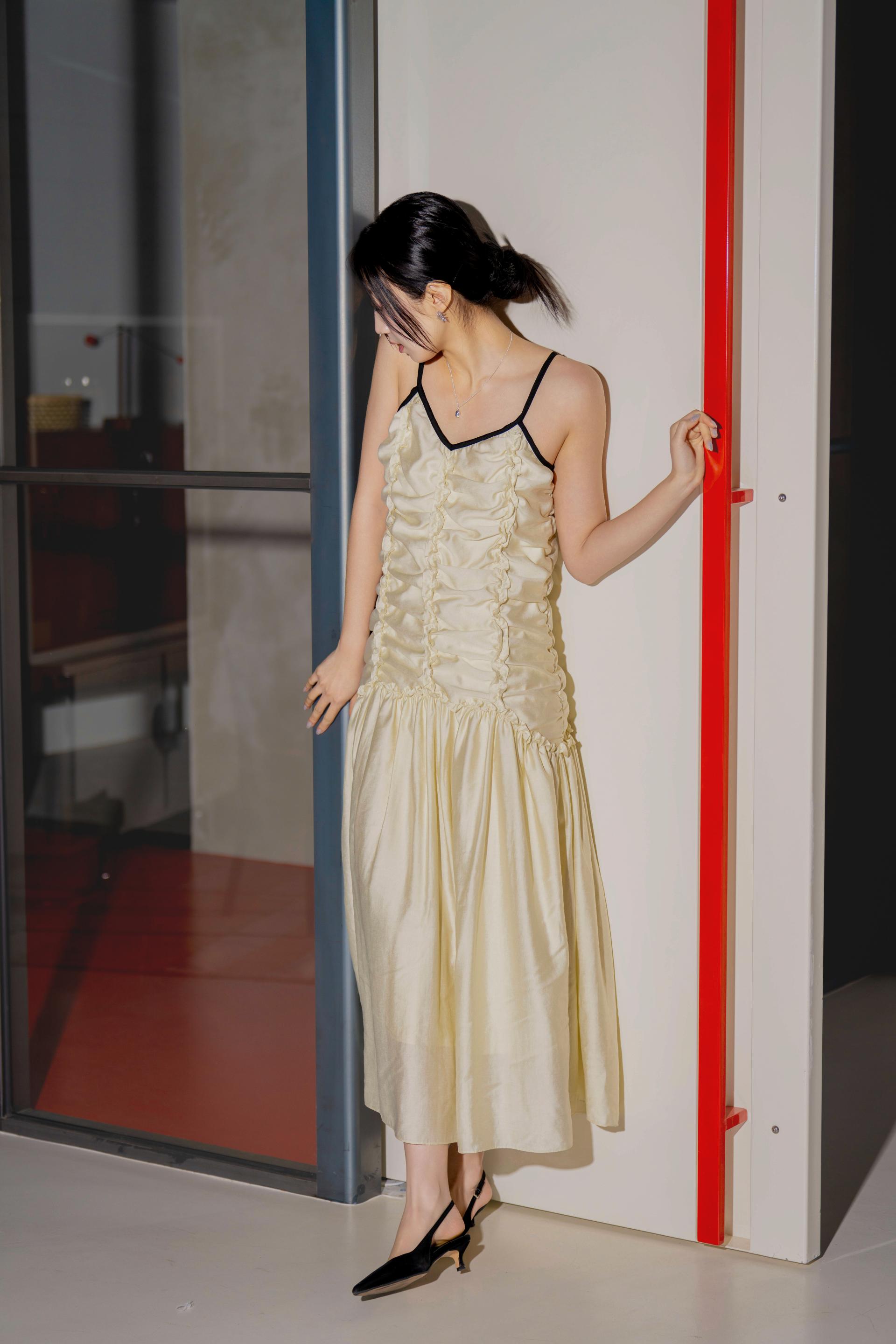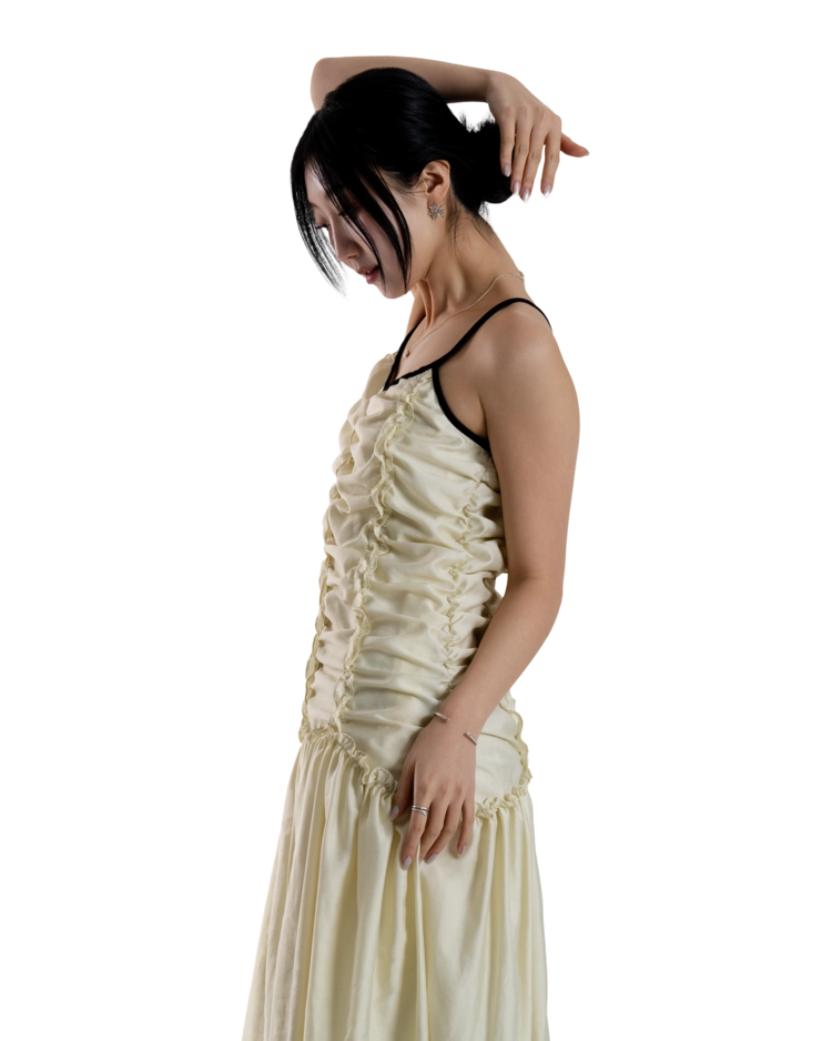 • 끈과 원피스 본체의 배색이 자연스럽게 어우러져 있으며, 전체적인 셔링 디테일이 단품만으로도 강한 아이덴티티를 표현해 줍니다. 특히, 큼지막한 셔링이 굵게 잡혀 있어 풍성하면서도 실루엣이 부해 보이지 않도록 세심하게 디자인되었습니다. 셔링 사이사이에 세로결로 들어간 레이스 디테일 덕분에 더욱 고급스럽고 세련된 인상을 줍니다.