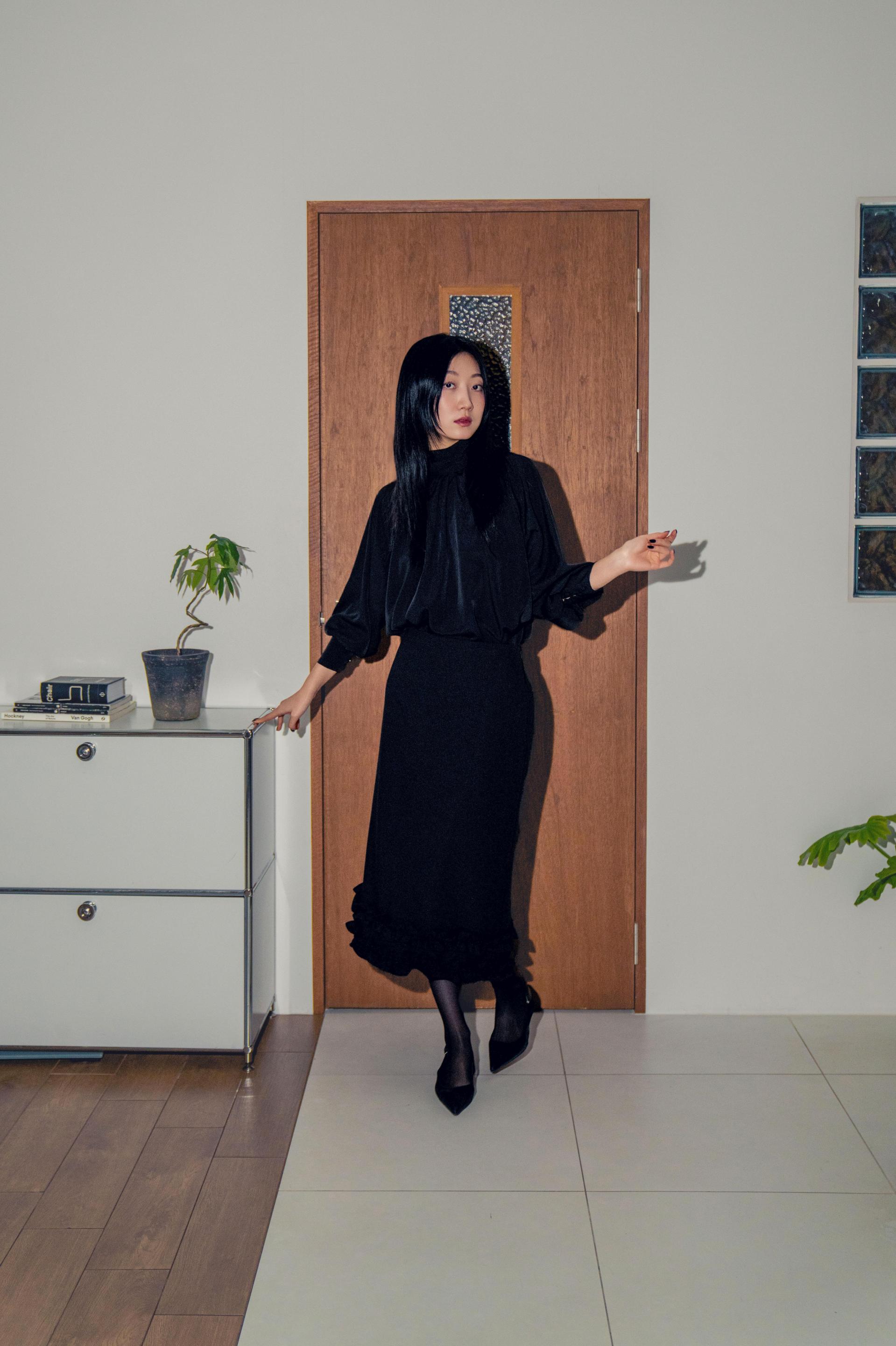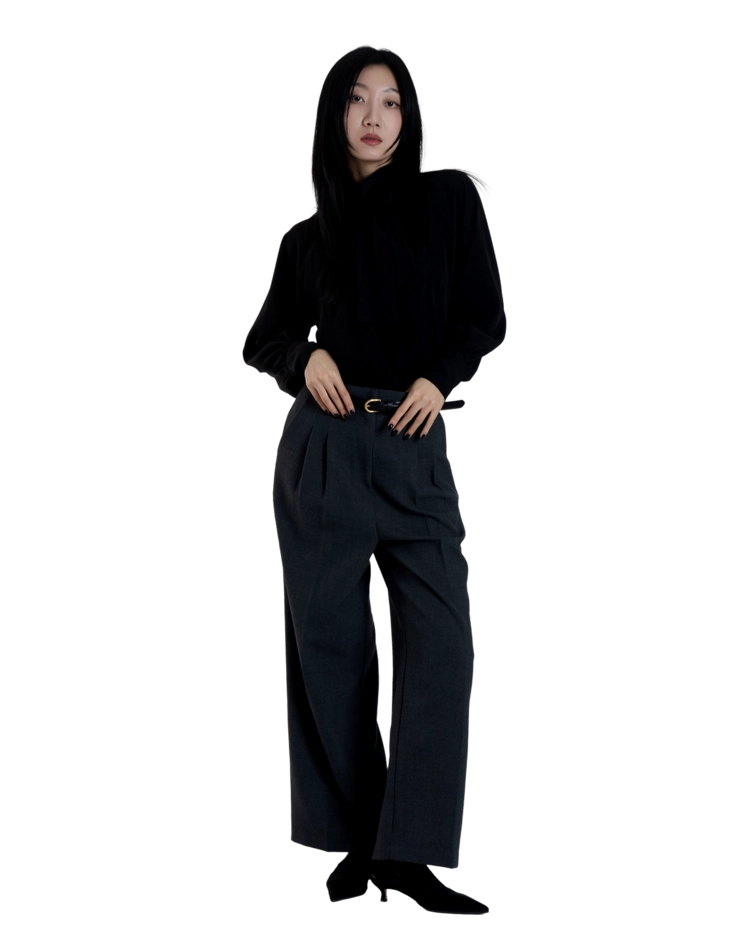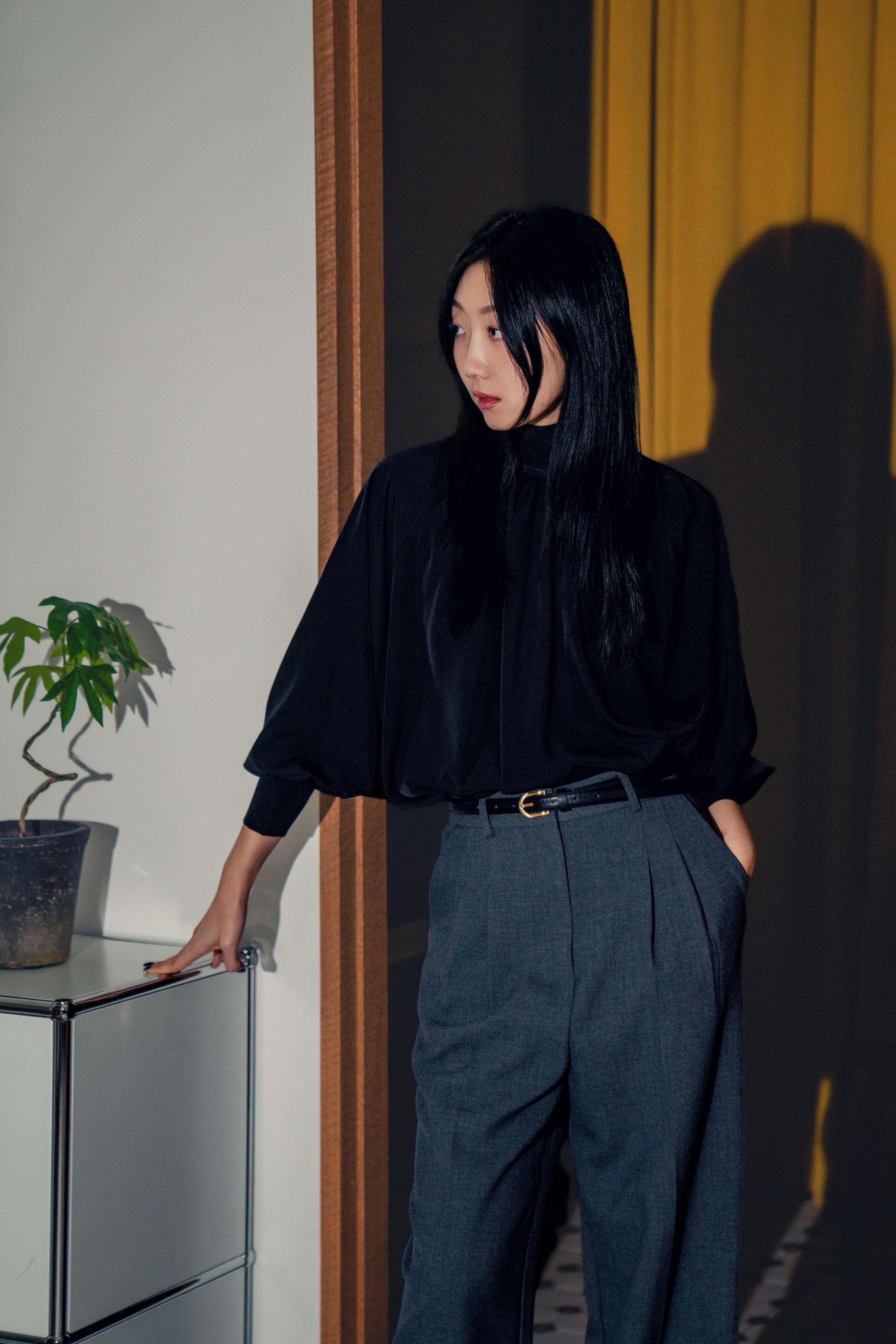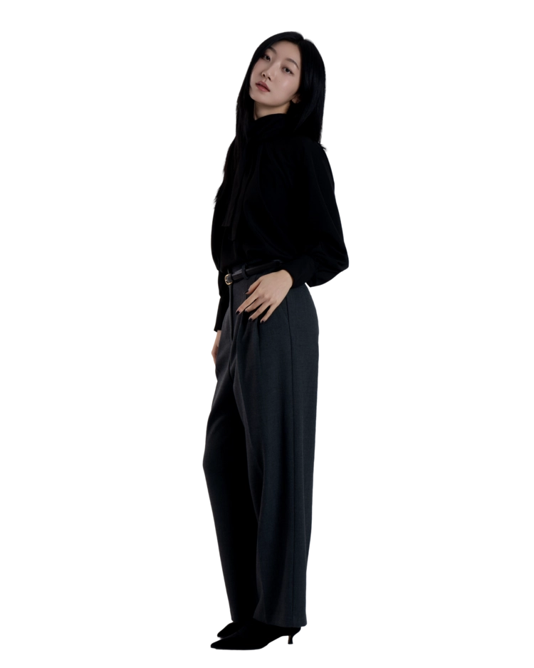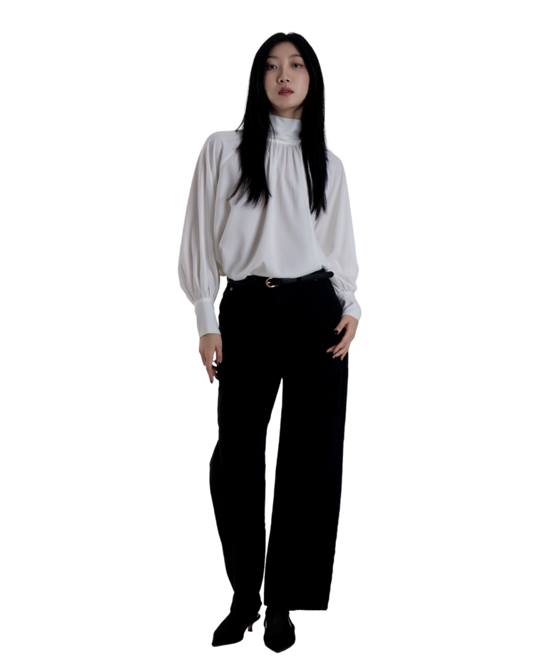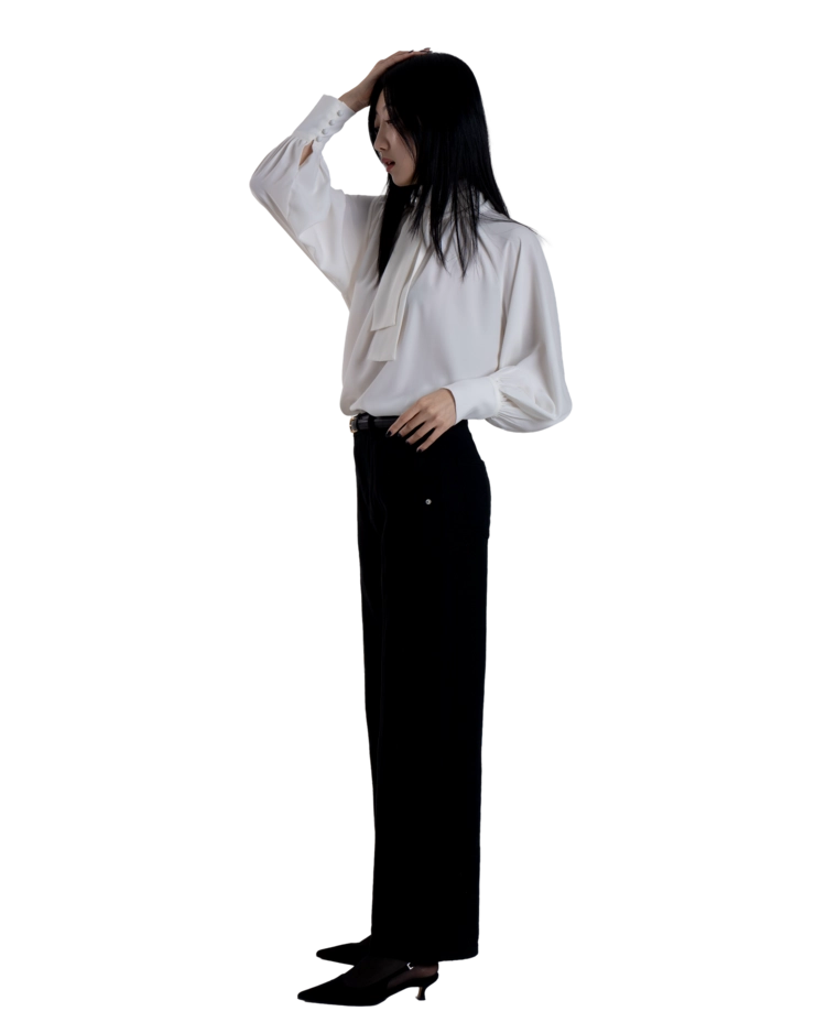 •손목의 긴 커프스 디테일과 싸개 단추가 블라우스의 실루엣을 안정적으로 잡아주며, 자연스럽게 흐르는 드레이프 핏이 과하지 않게 정리되어 우아한 분위기를 완성합니다.
