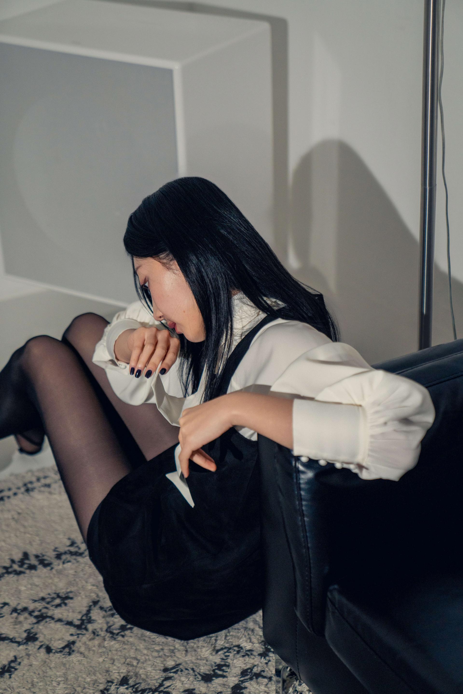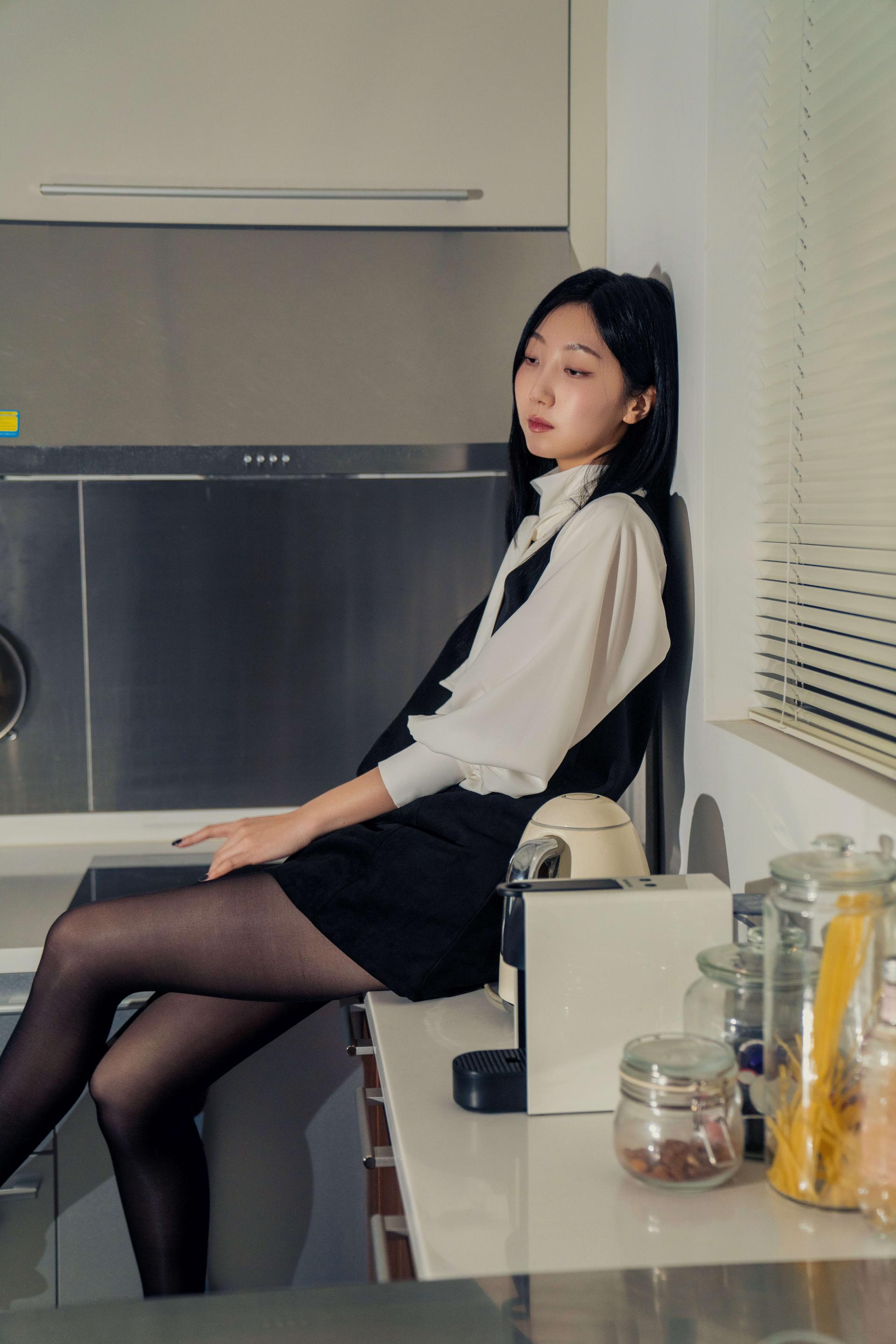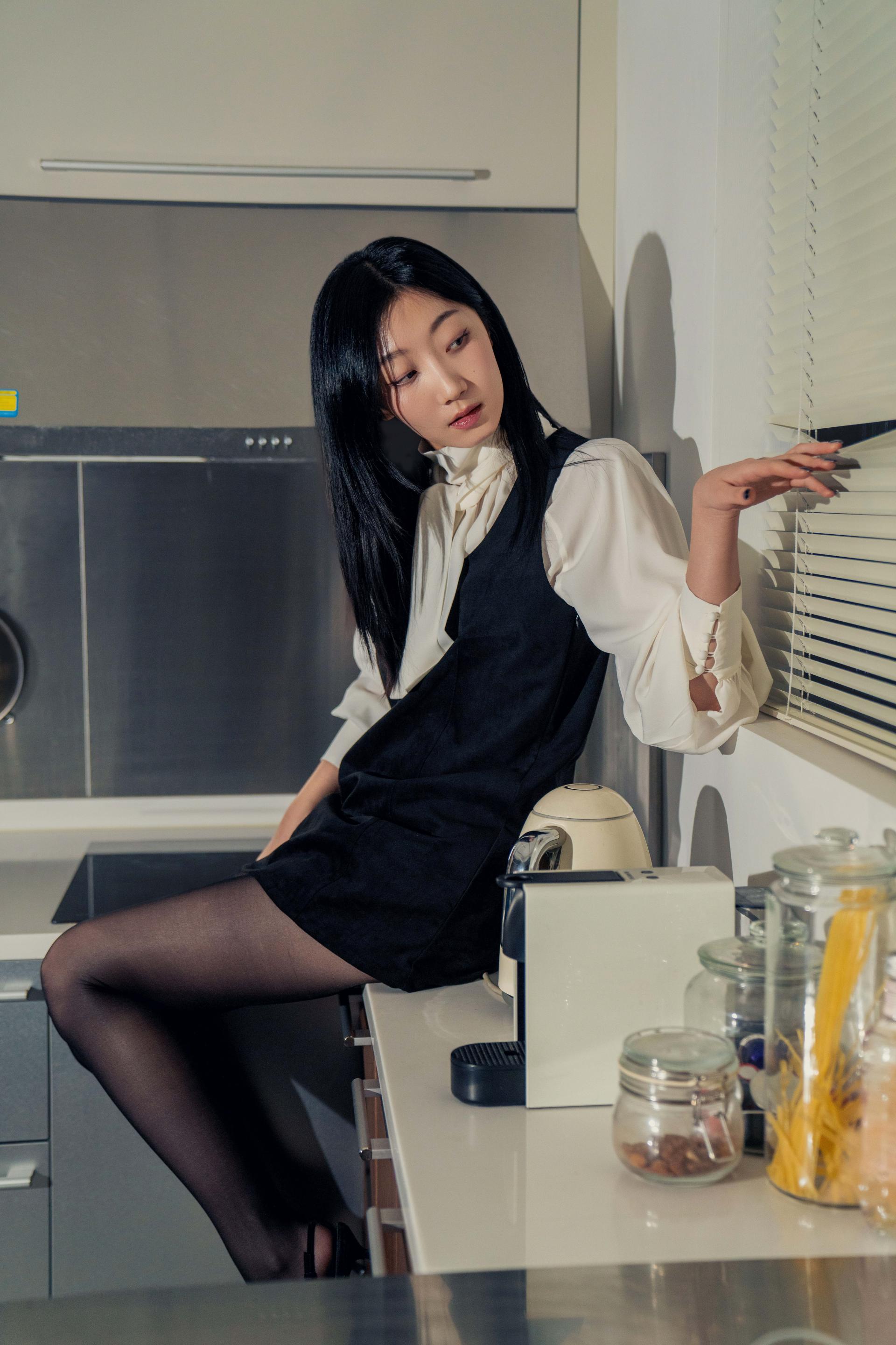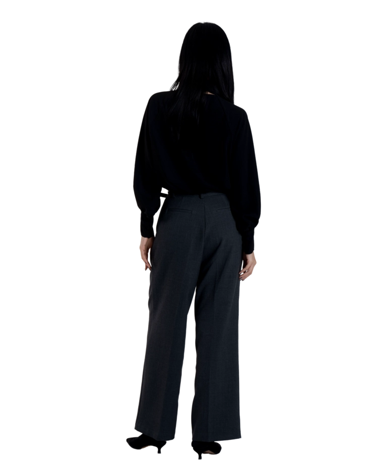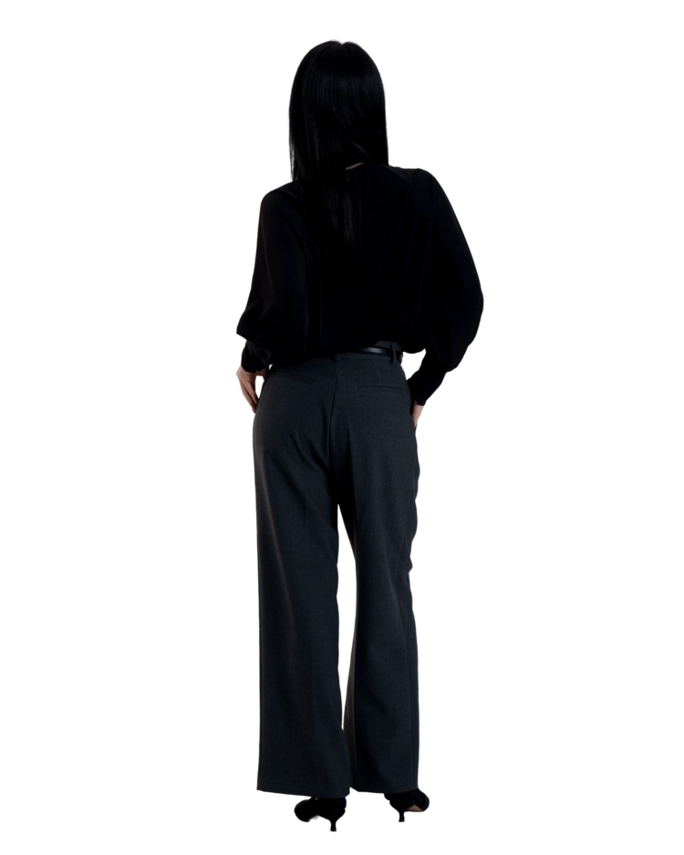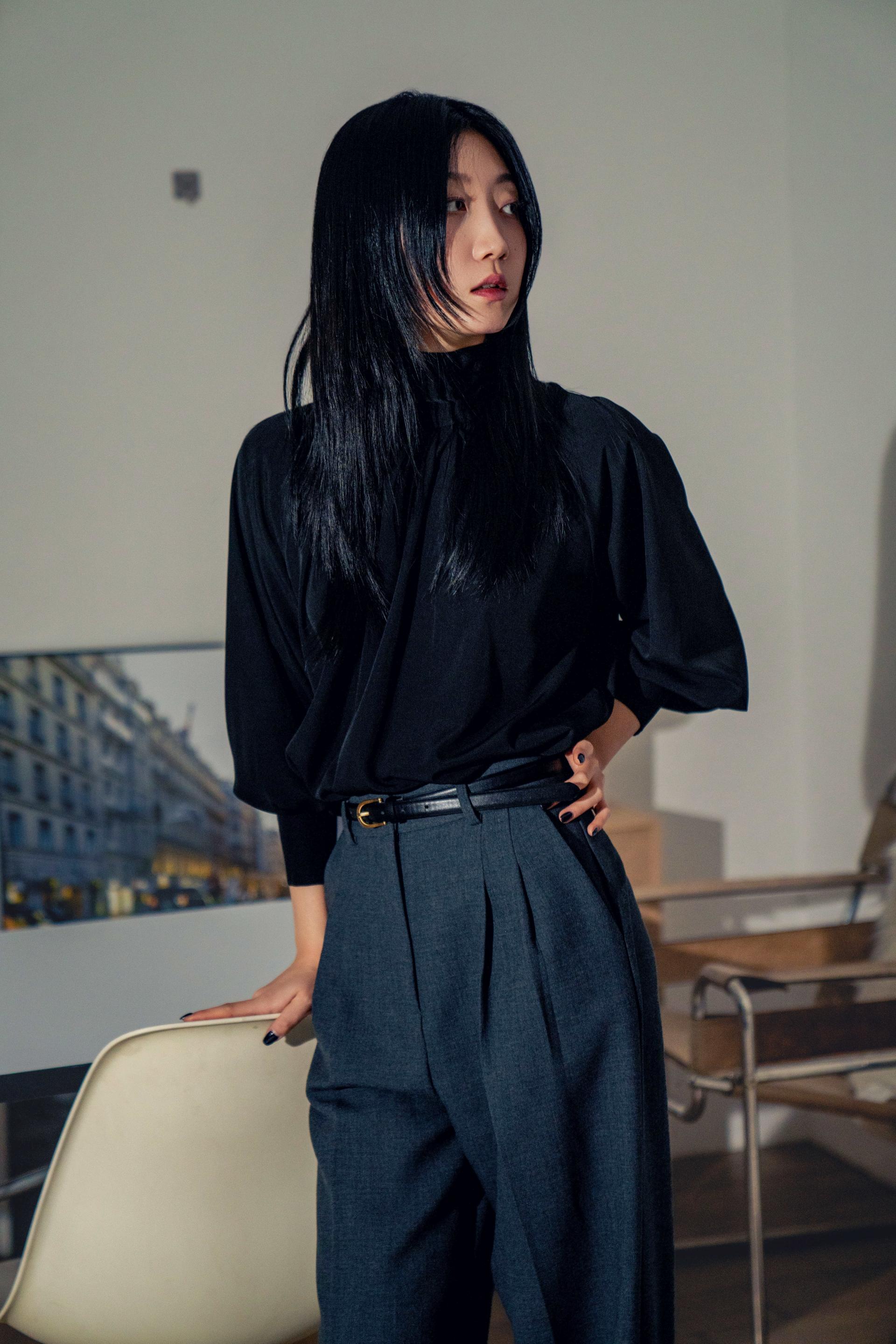 •손목의 긴 커프스 디테일과 싸개 단추가 블라우스의 실루엣을 안정적으로 잡아주며, 자연스럽게 흐르는 드레이프 핏이 과하지 않게 정리되어 우아한 분위기를 완성합니다.