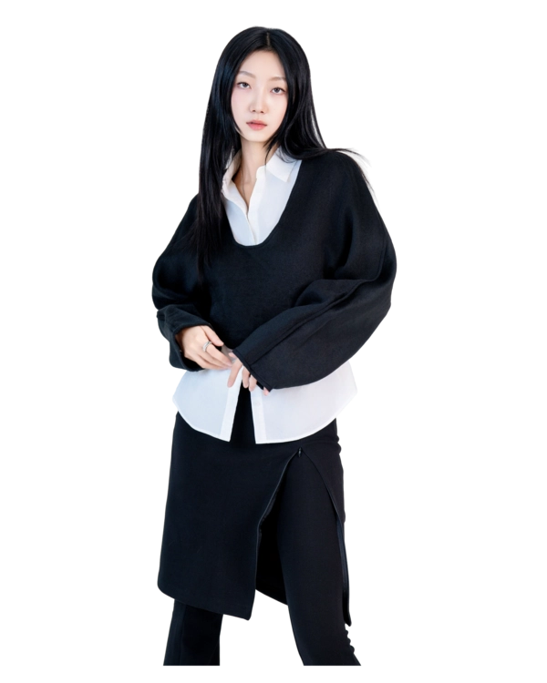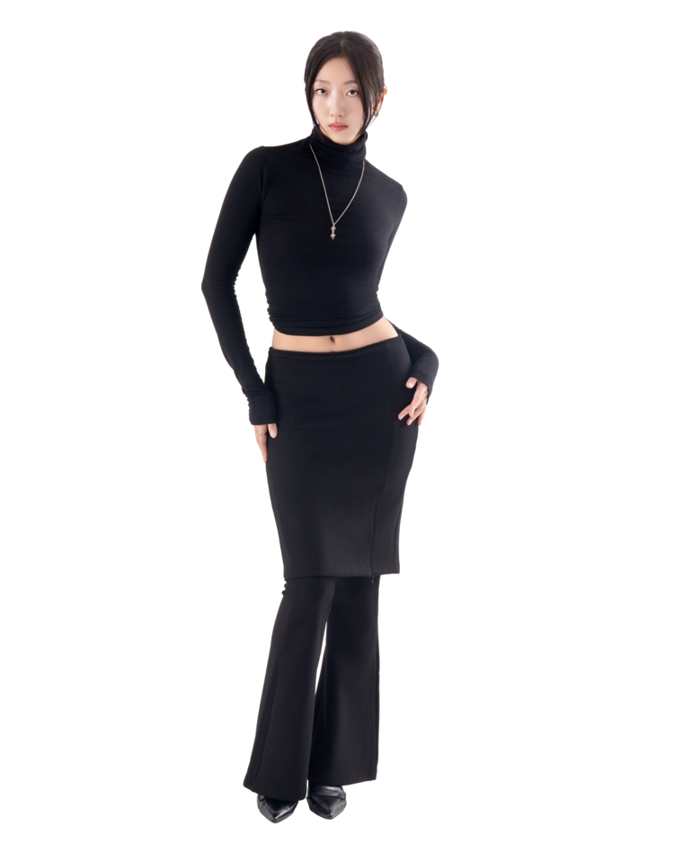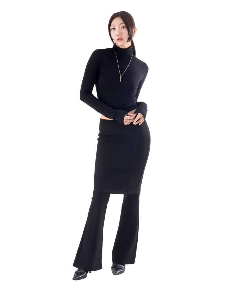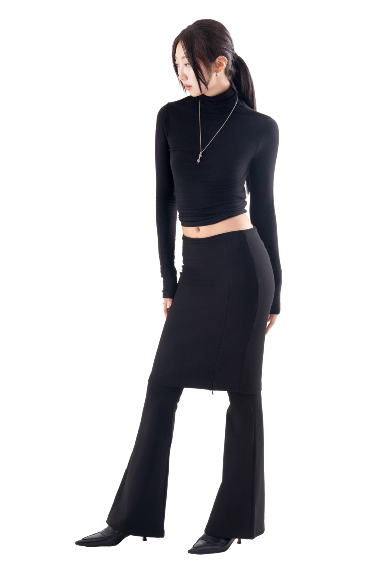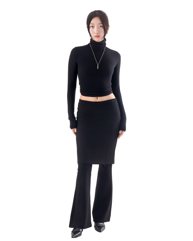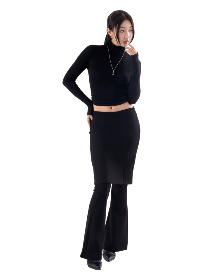 • 슬림한 미디 스커트와 플레어 팬츠가 결합된 레이어드 디자인