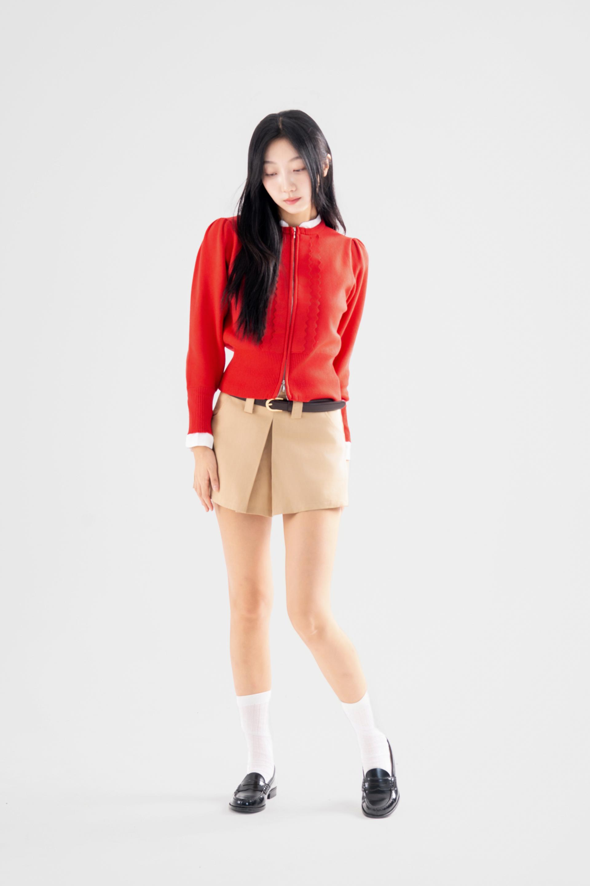 • 입체적인 웨이브 프릴 디테일이 중심이 되는 짚업 니트 가디건