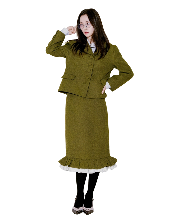버튼프릴 페플럼셋업 올리브그린