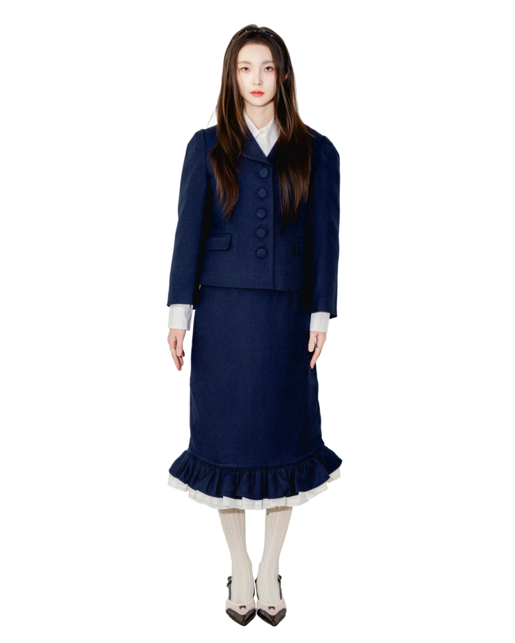 • 짧고 단정한 기장감으로 구성된 버튼 프릴 셋업입니다.