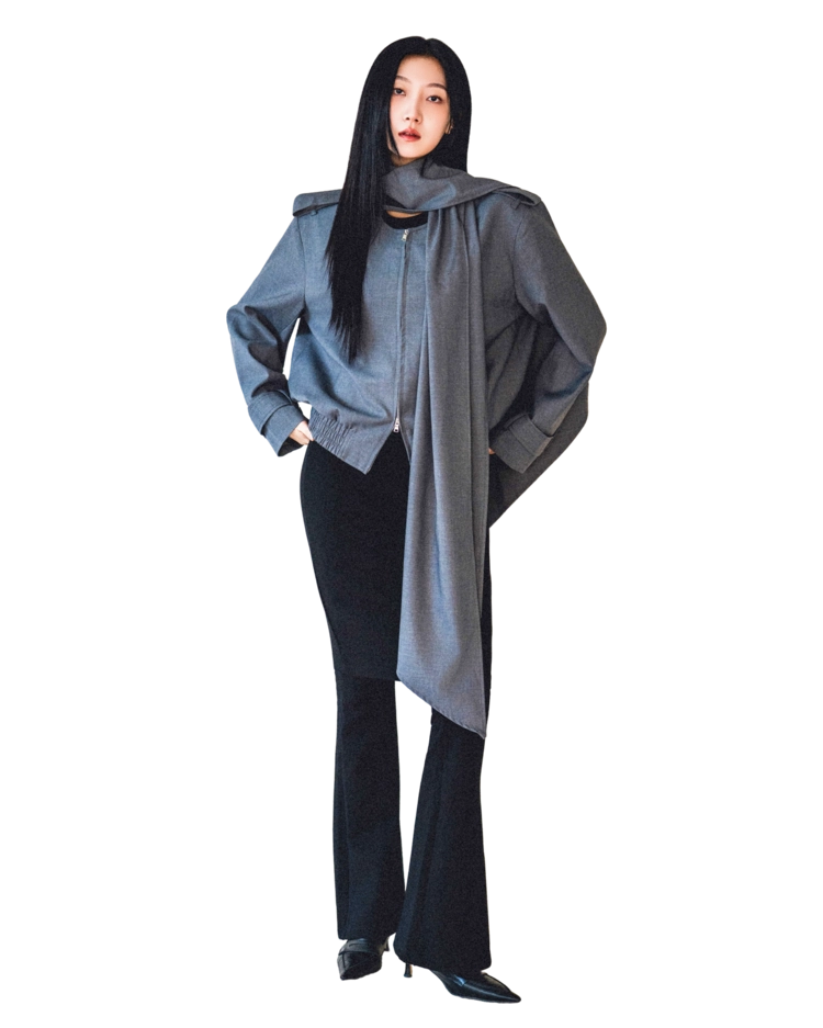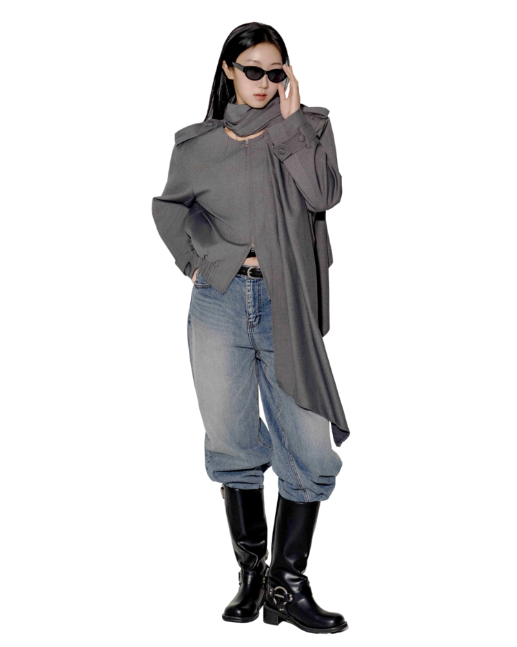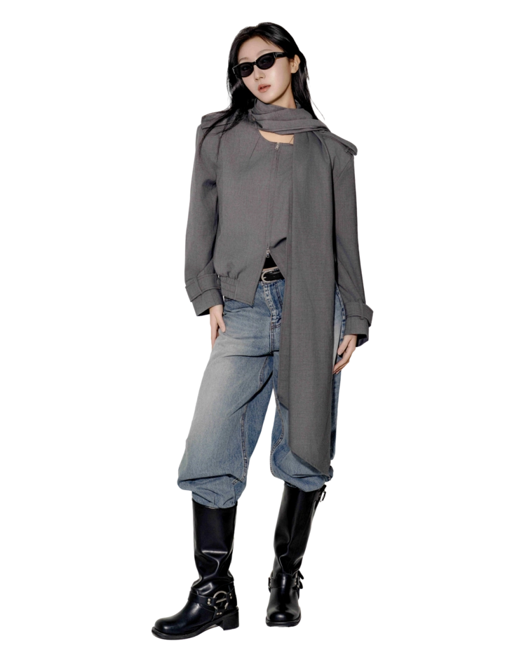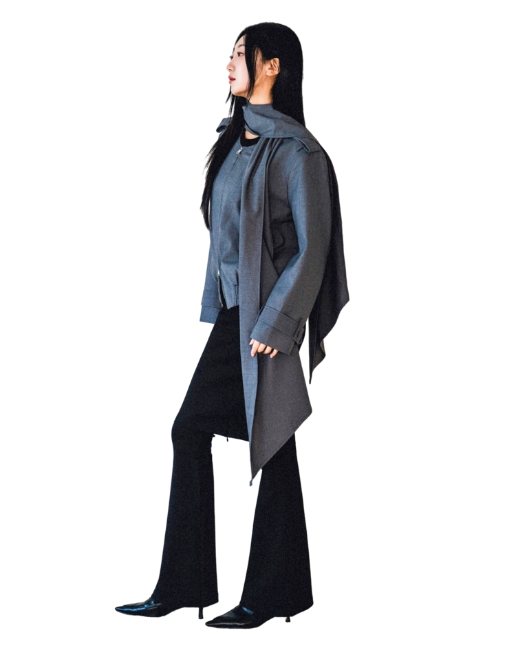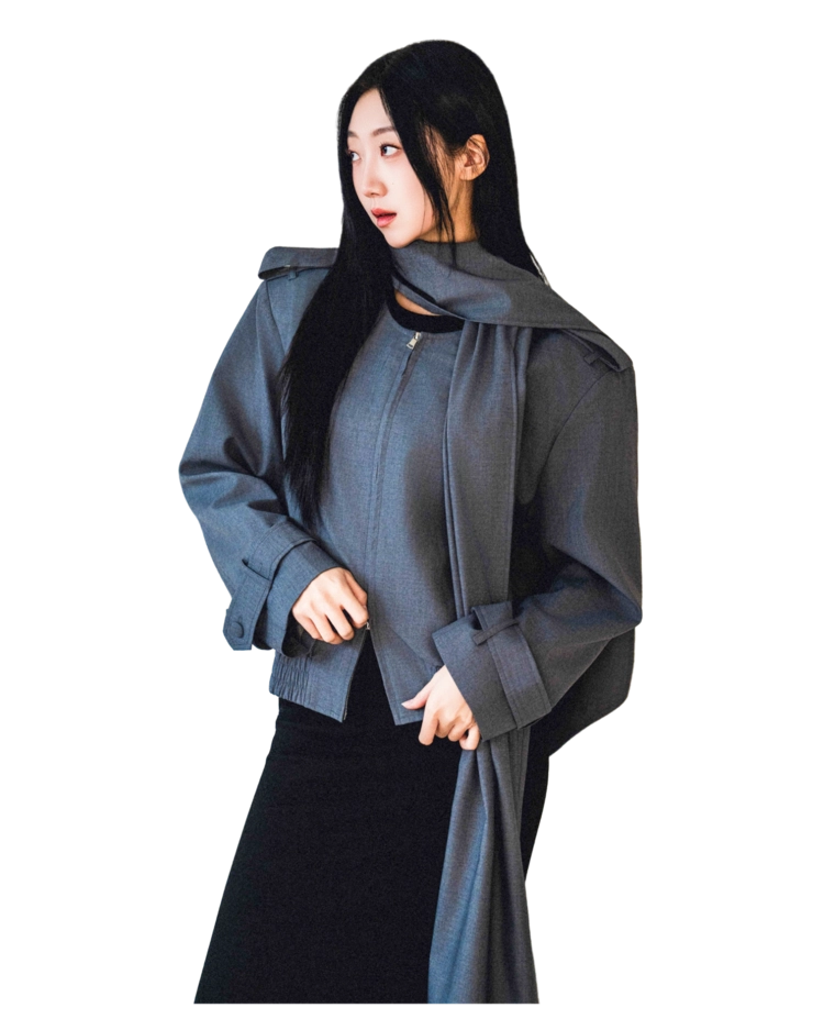 "롱 스카프 디테일 덕분에 자켓 하나만 걸쳐도 완성도 있는 느낌이에요. 어깨선이나 소매 끝 디테일도 단단하게 잡혀서 전체적인 실루엣이 무너지지 않아요."