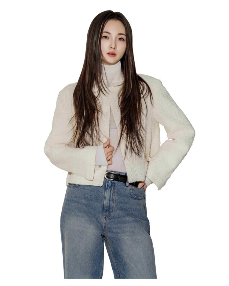 "화이트 트위드인데 부담스럽게 화려한 느낌이 아니라, 데님에 입어도 깔끔하게 정리돼서 손이 자주 가는 자켓이에요."
