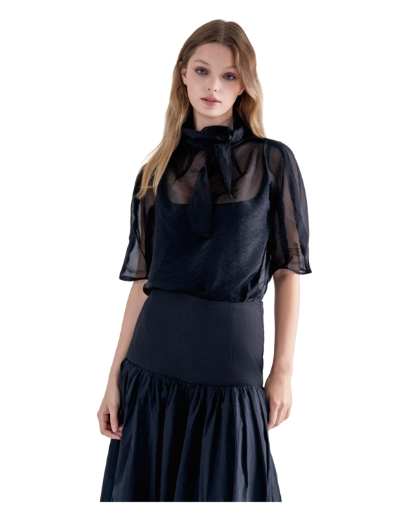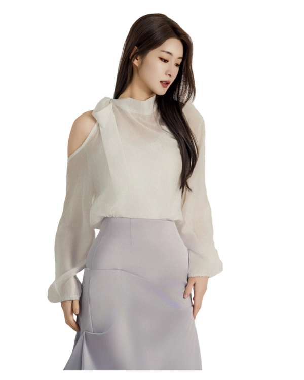 • 숄카라에 가까운 깊은 V 라인이 목선과 상체 라인을 길어 보이게 정돈합니다.