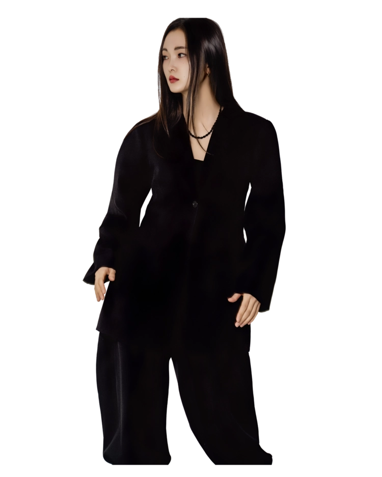 "스크런치까지 같은 원단이라 작은 디테일인데도 룩이 확 정리돼 보여요. 자켓은 딥V 라인이 깔끔해서 이너 바꿔도 분위기가 쉽게 맞춰졌어요."