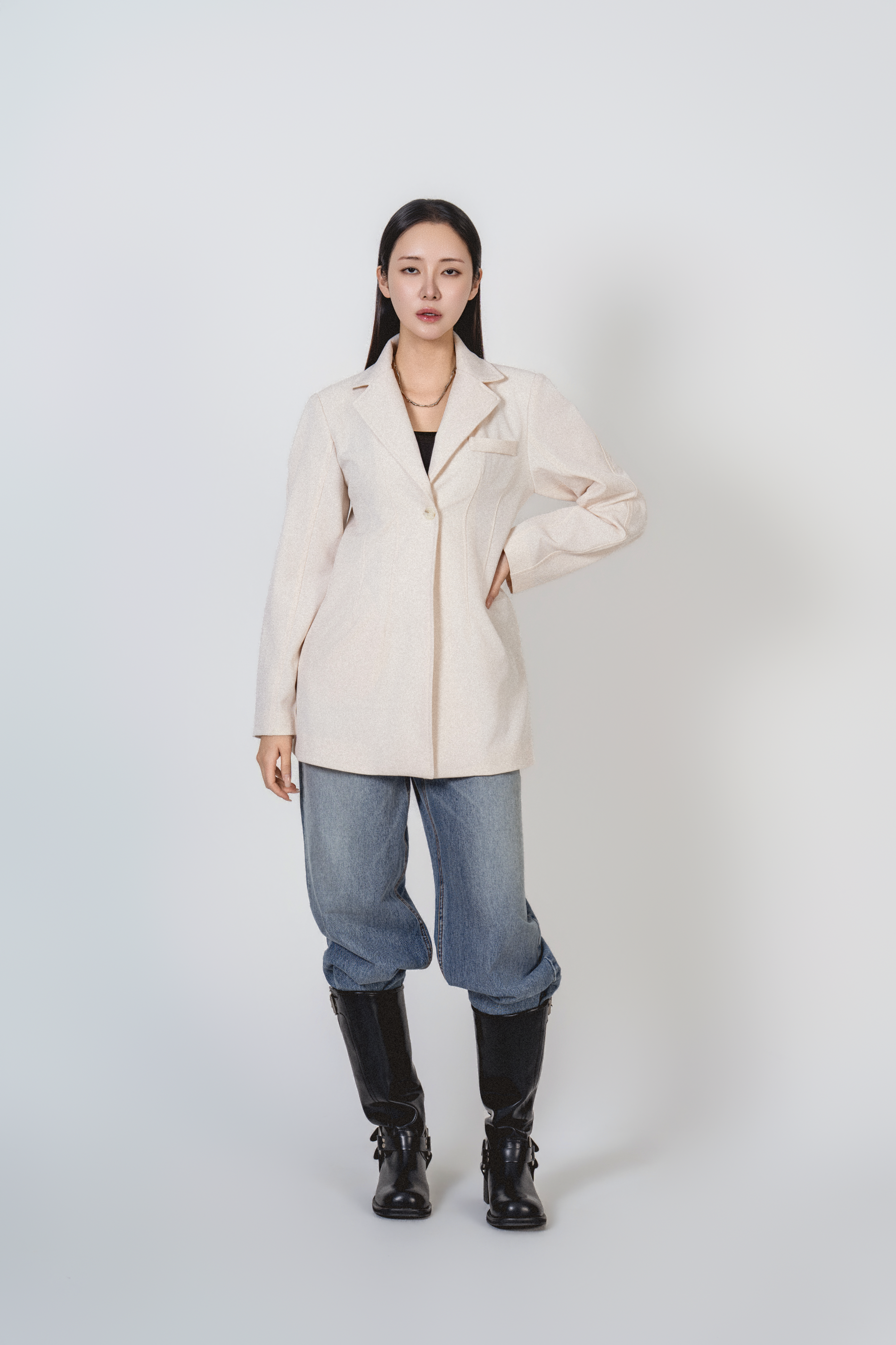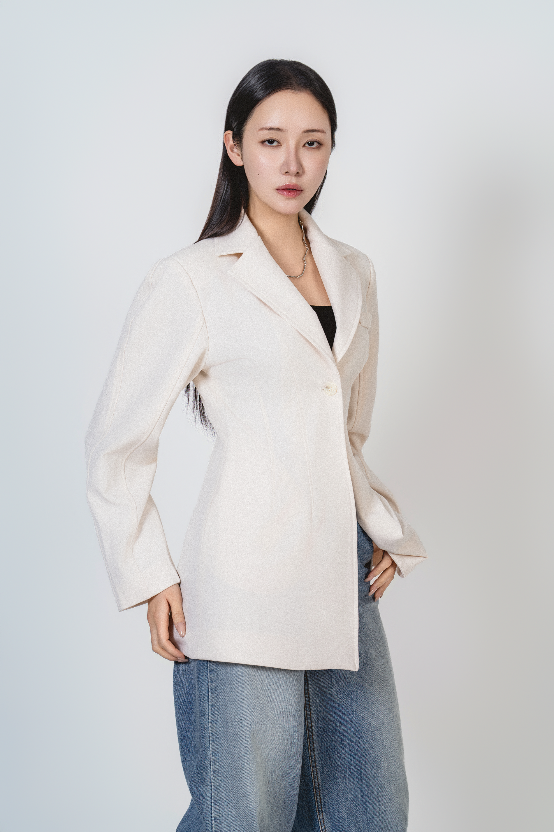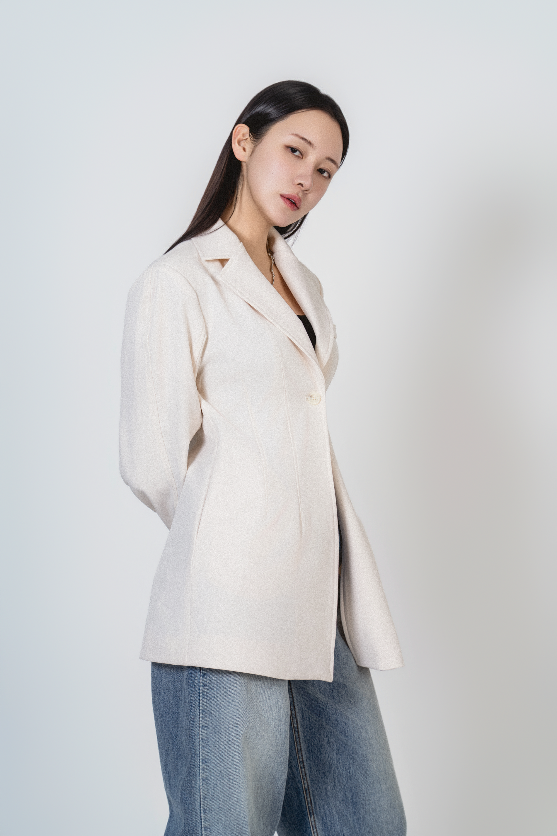 • 미니멀한 원버튼 클로징으로 앞판이 깔끔하게 떨어지고, 이너를 가리지 않게 중심을 잡아줍니다.
