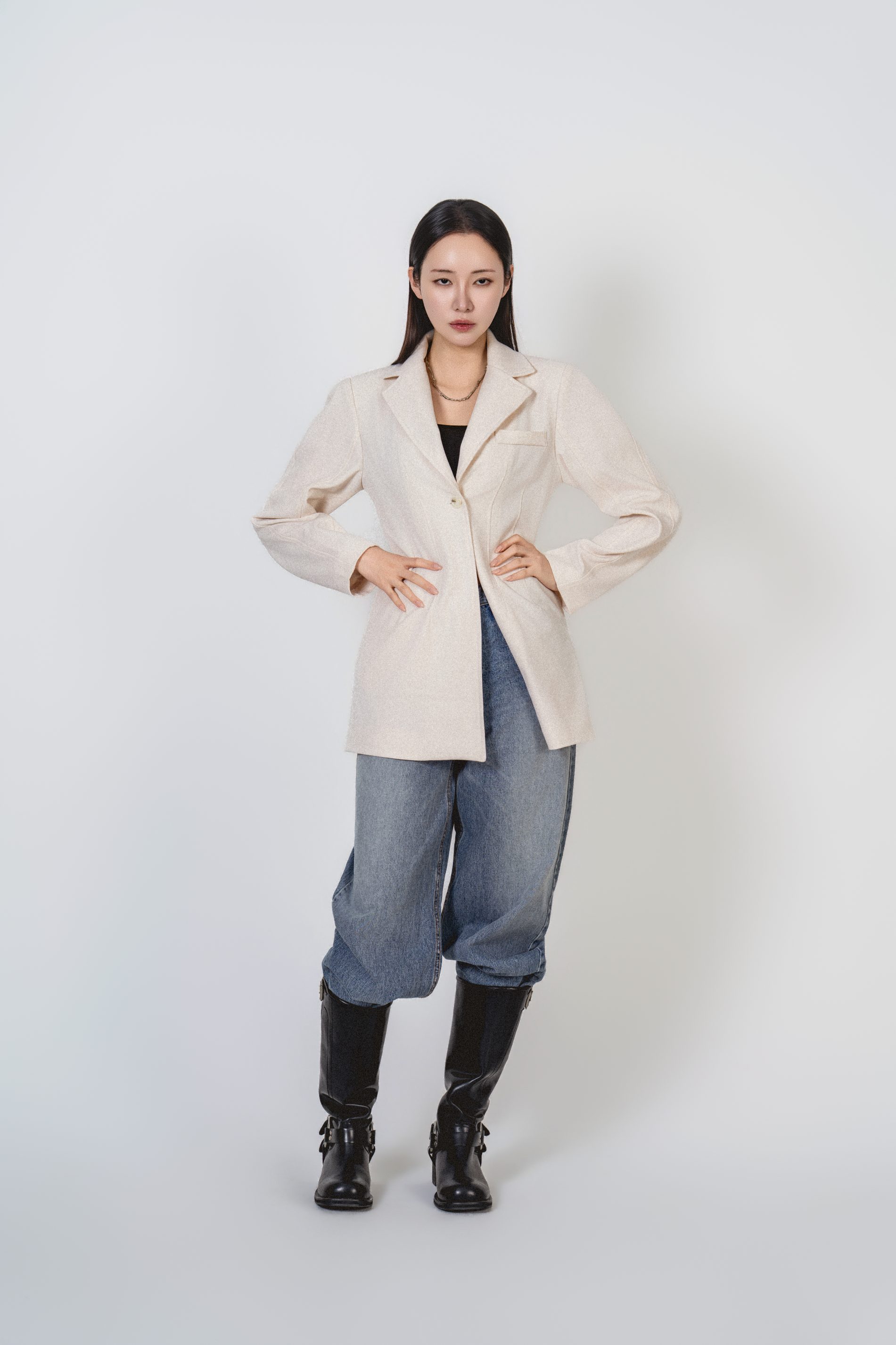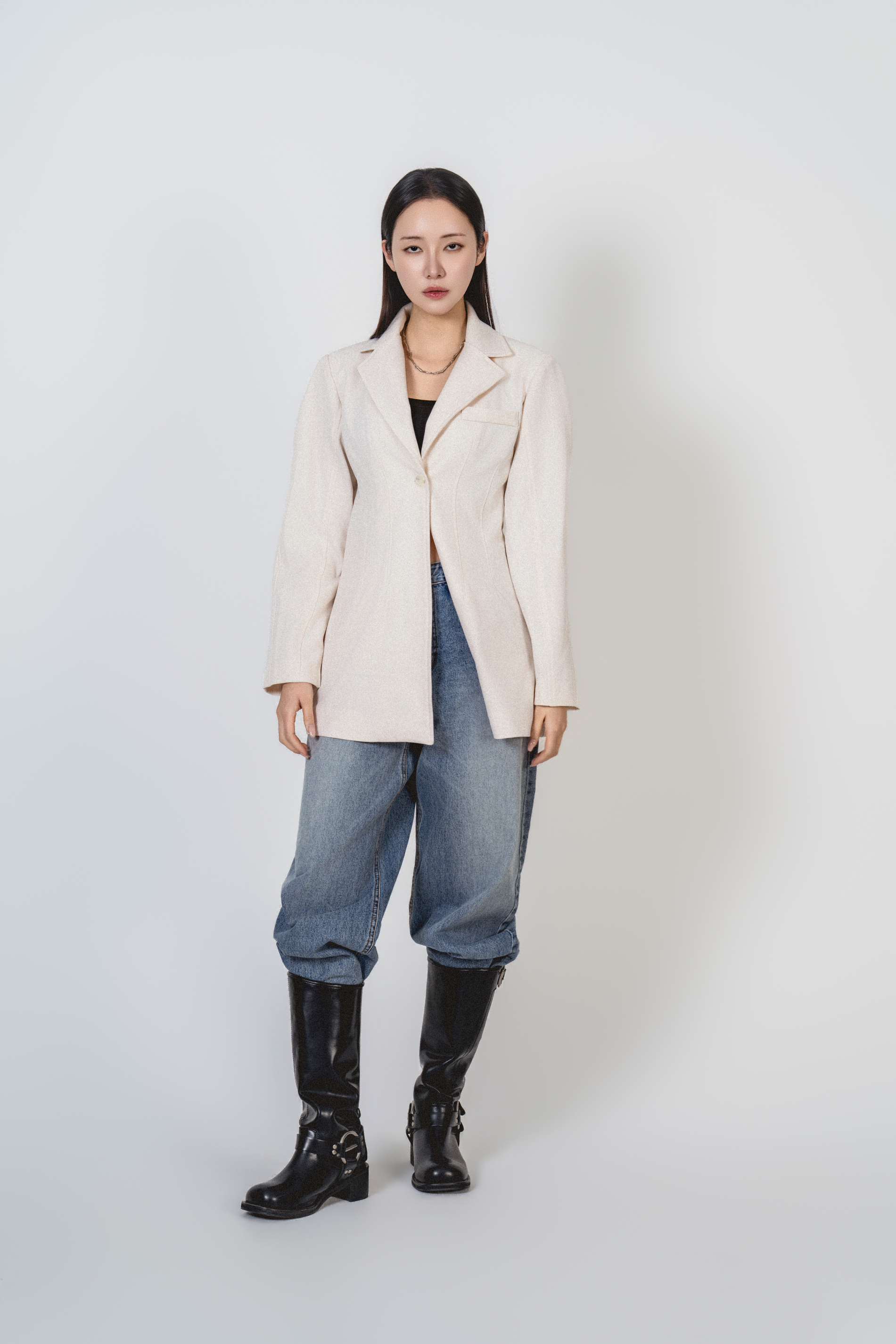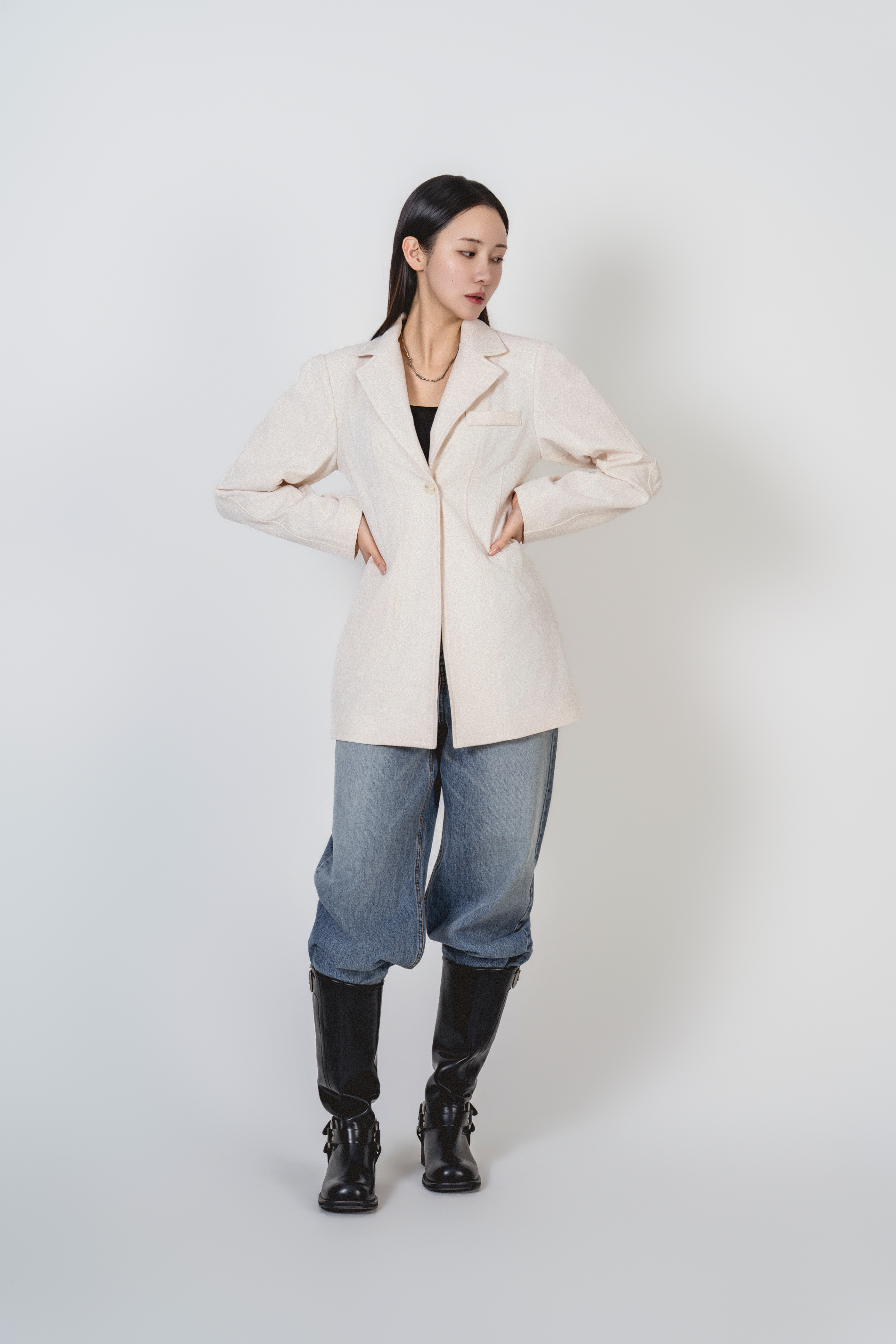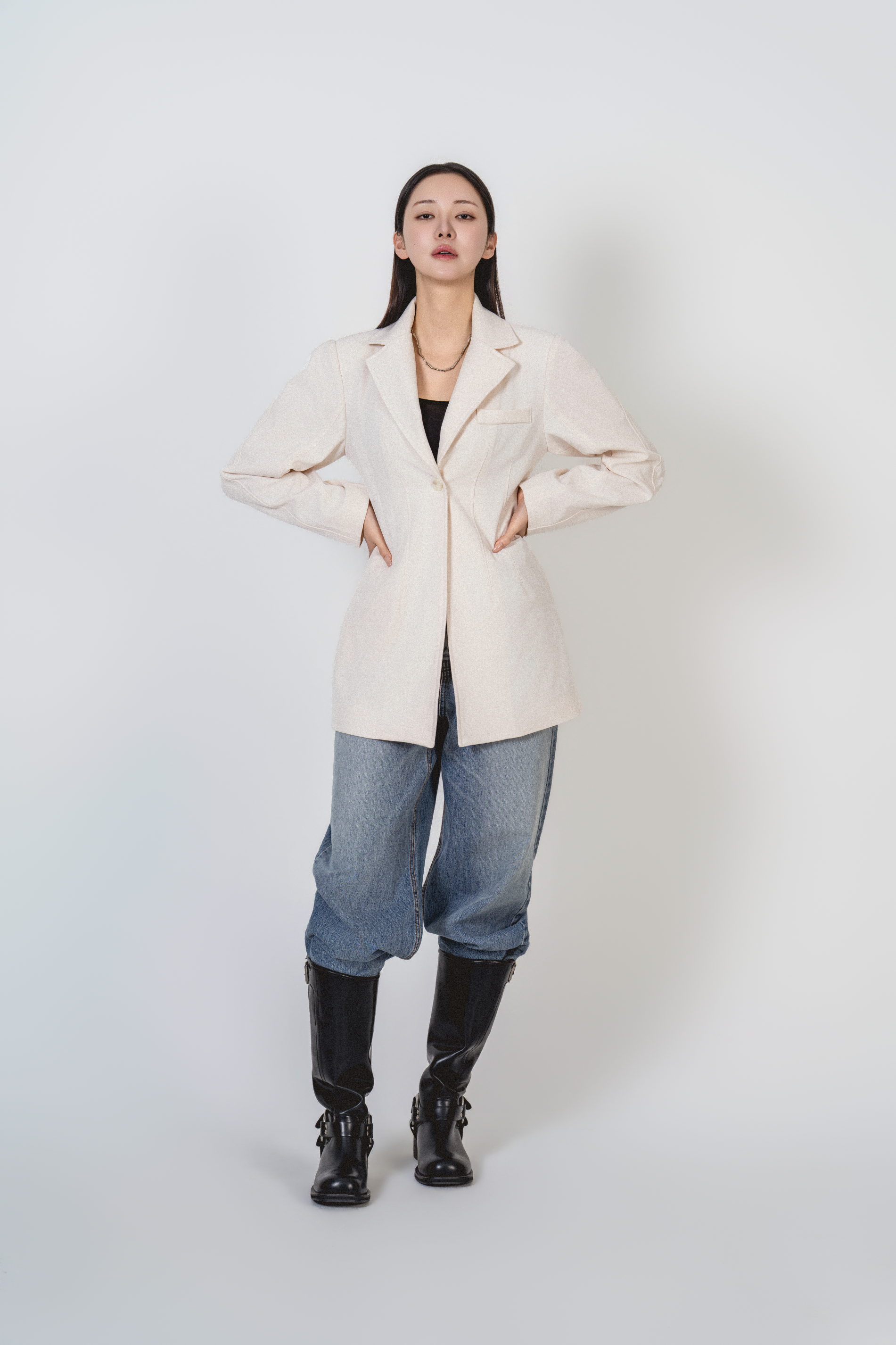 • 미니멀한 원버튼 클로징으로 앞판이 깔끔하게 떨어지고, 이너를 가리지 않게 중심을 잡아줍니다.