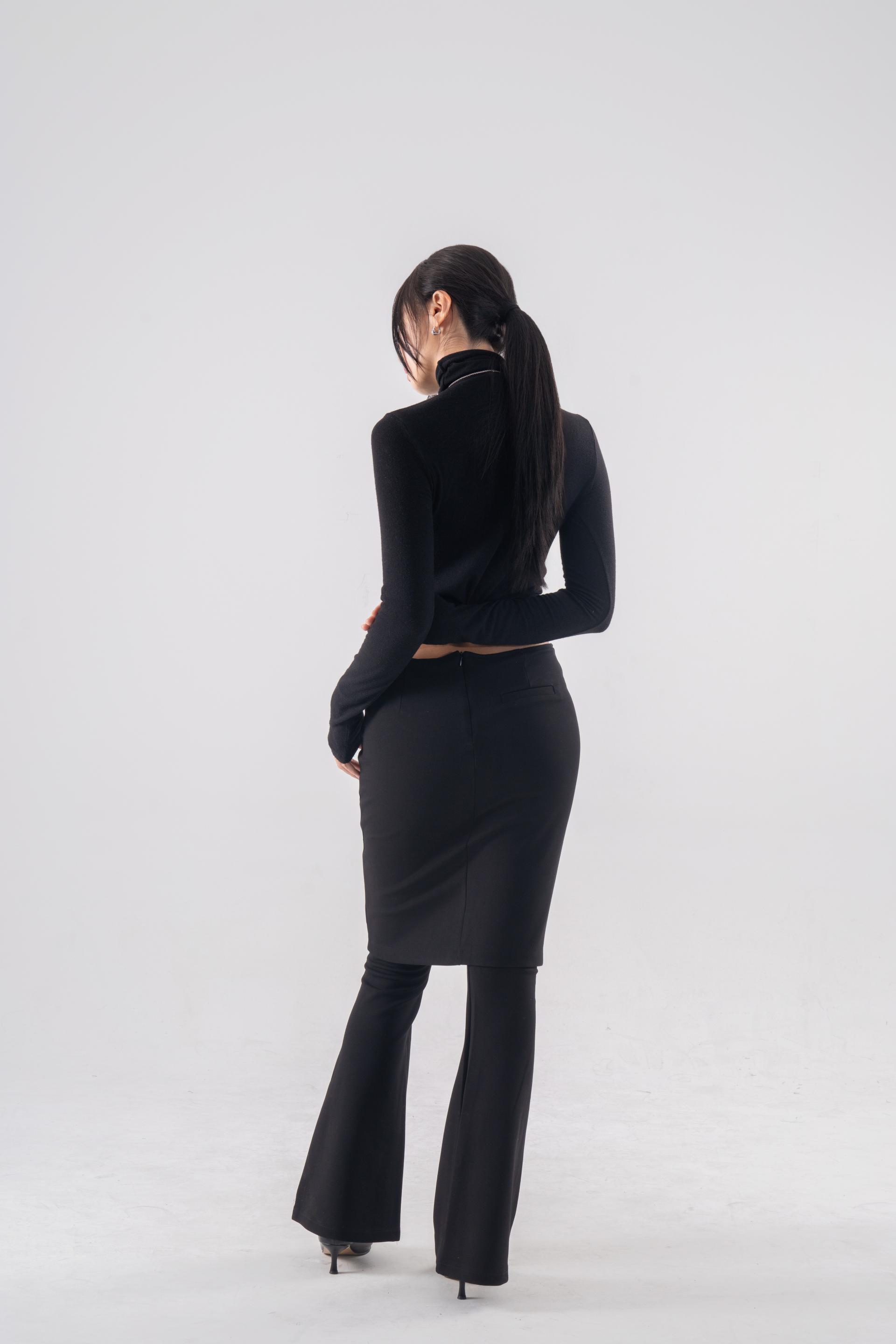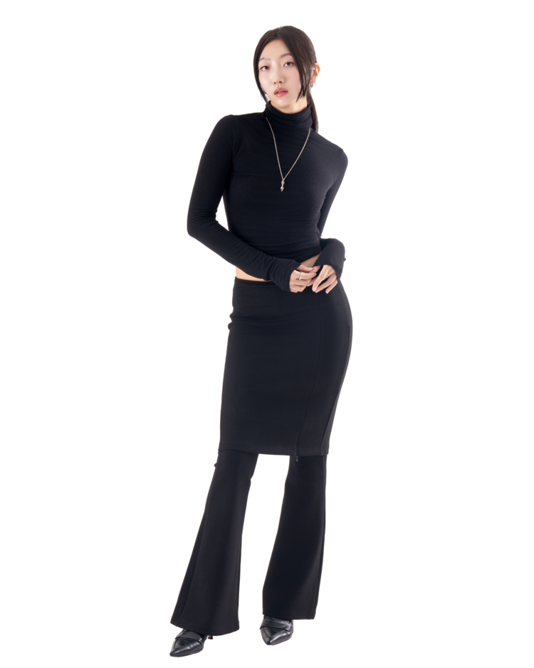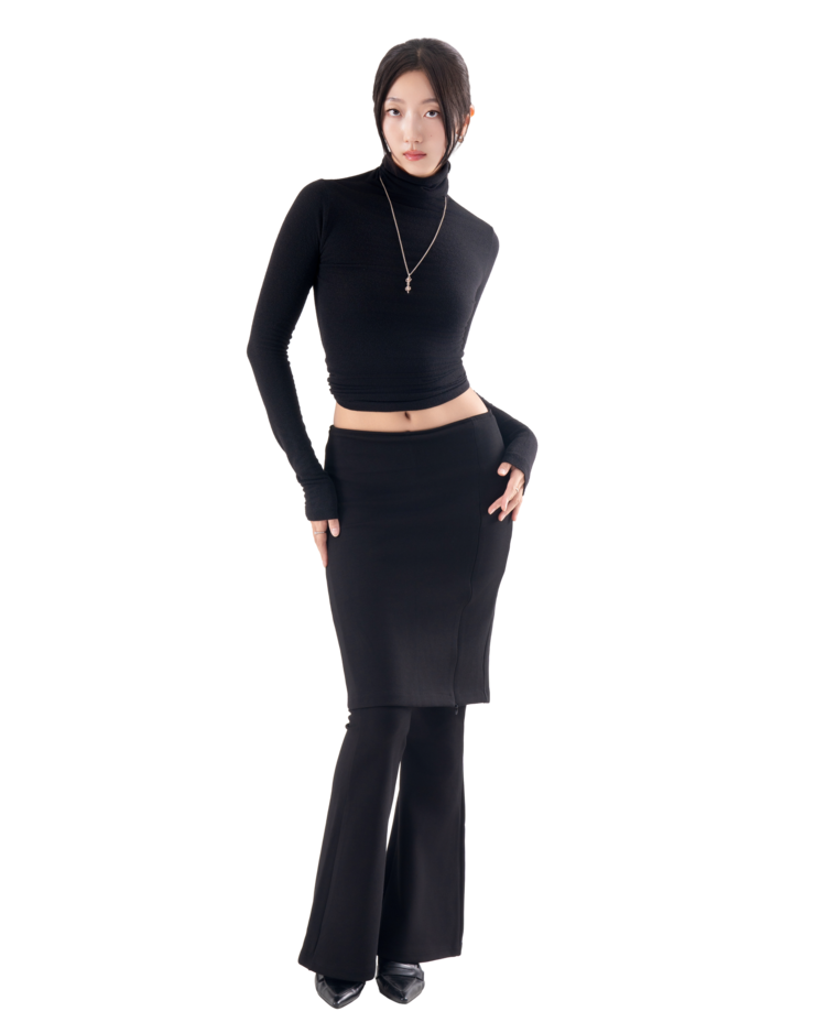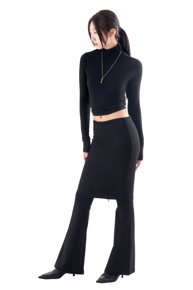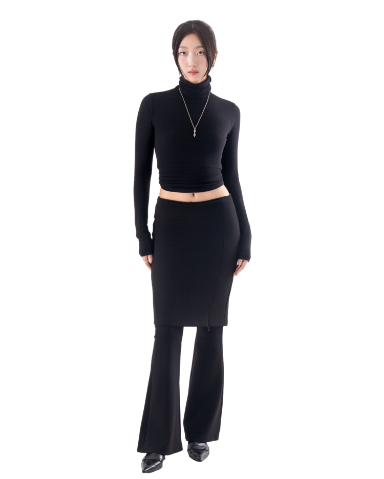 • 슬림한 미디 스커트와 플레어 팬츠가 결합된 레이어드 디자인