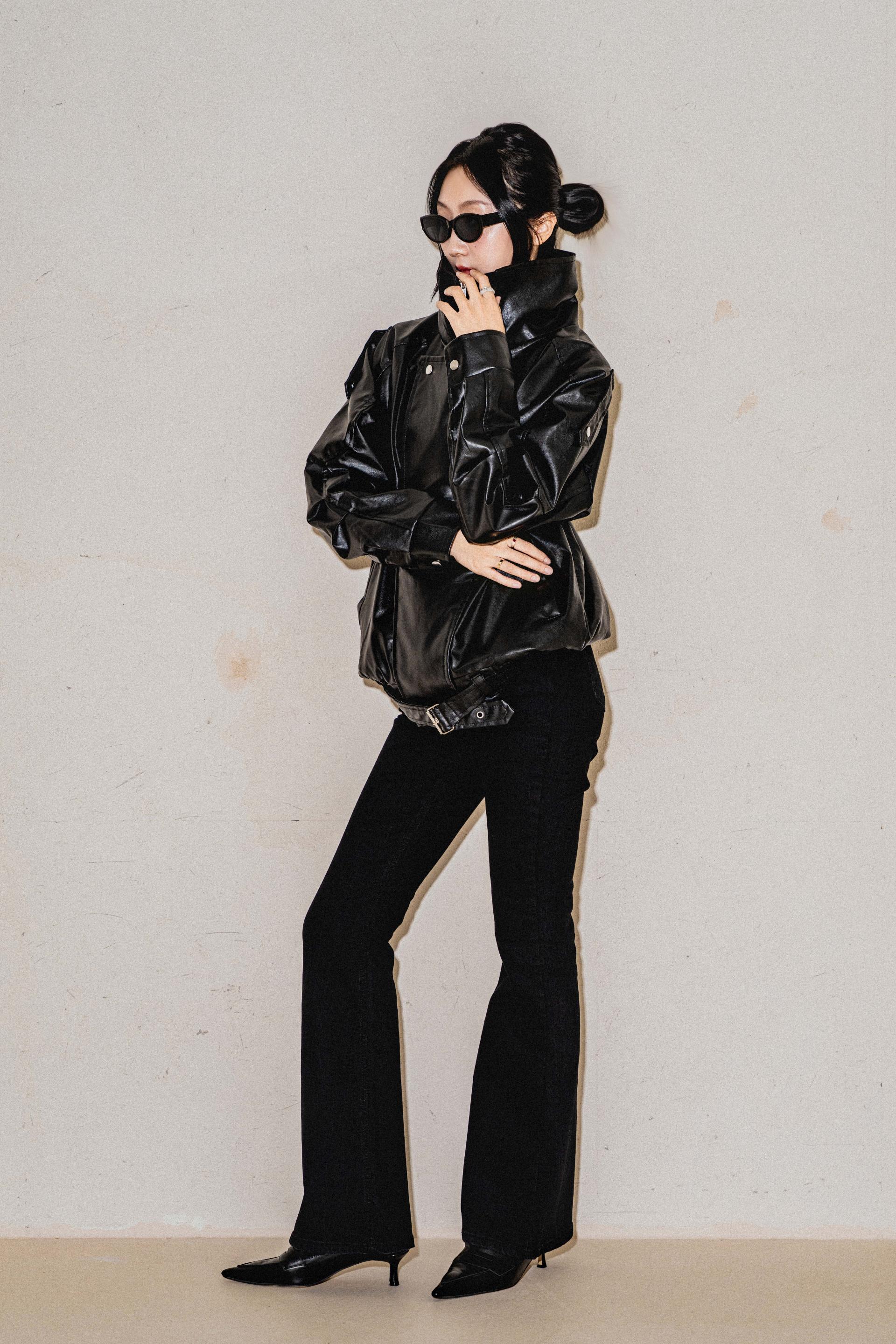• 빛에 따라 은은하게 광택이 감도는 가공 레더 소재로 제작된 오버사이즈 자켓