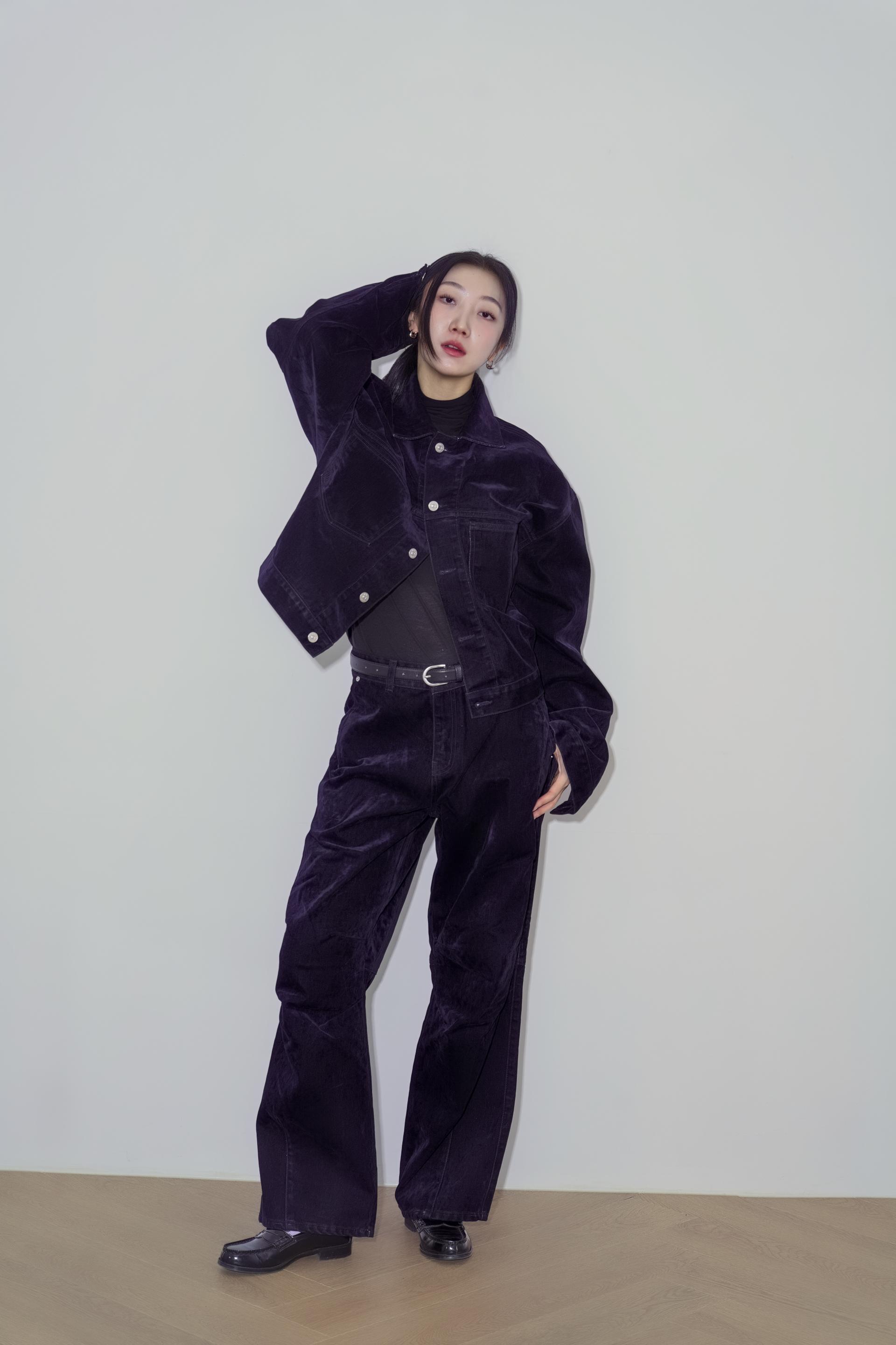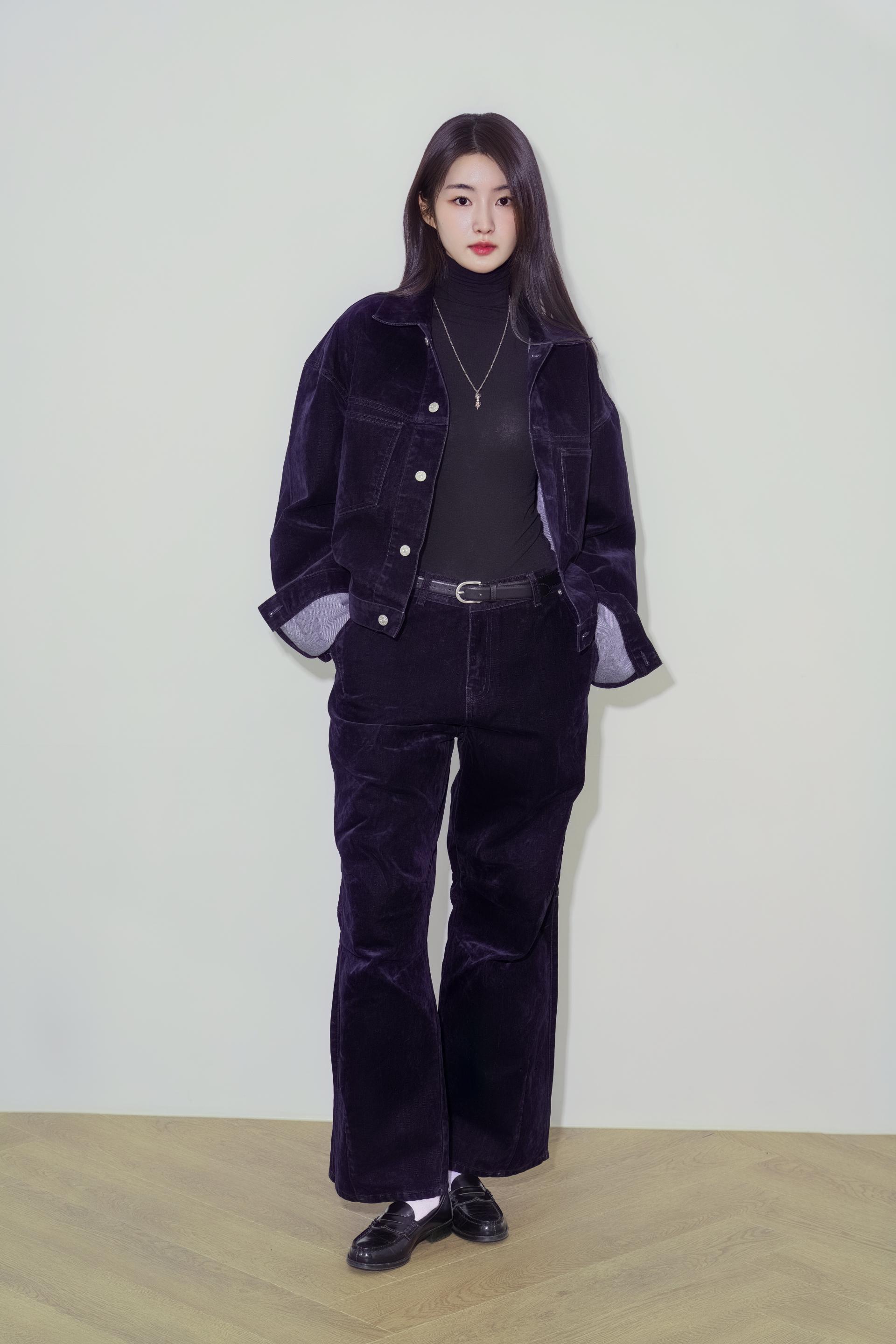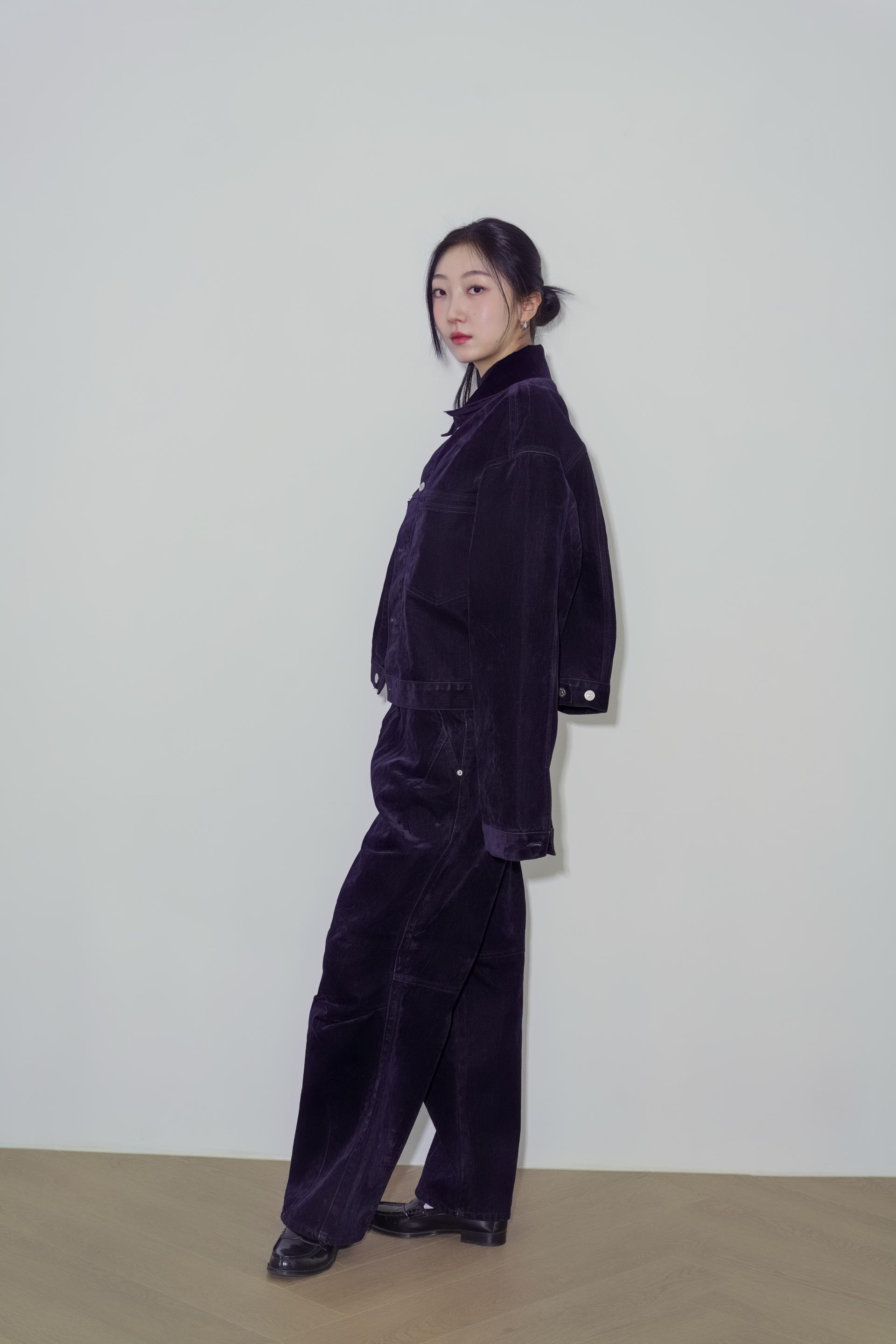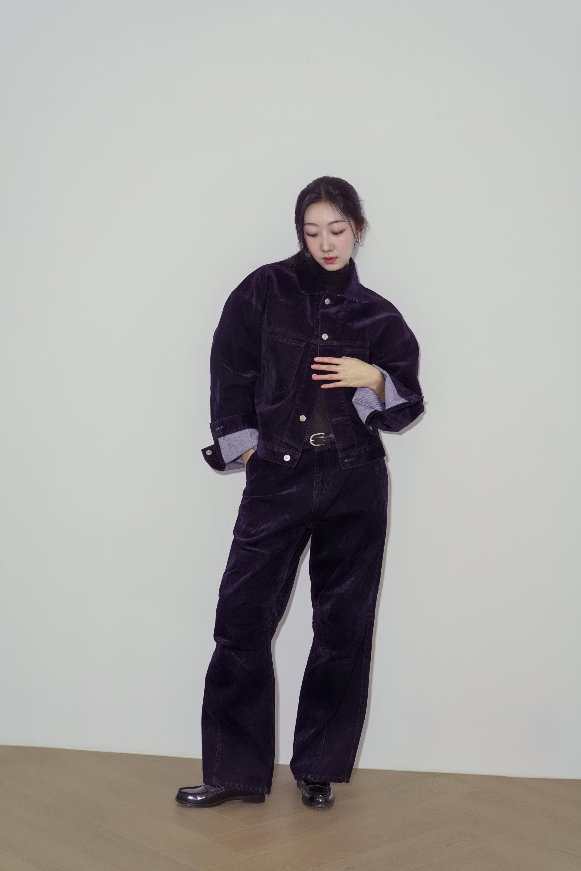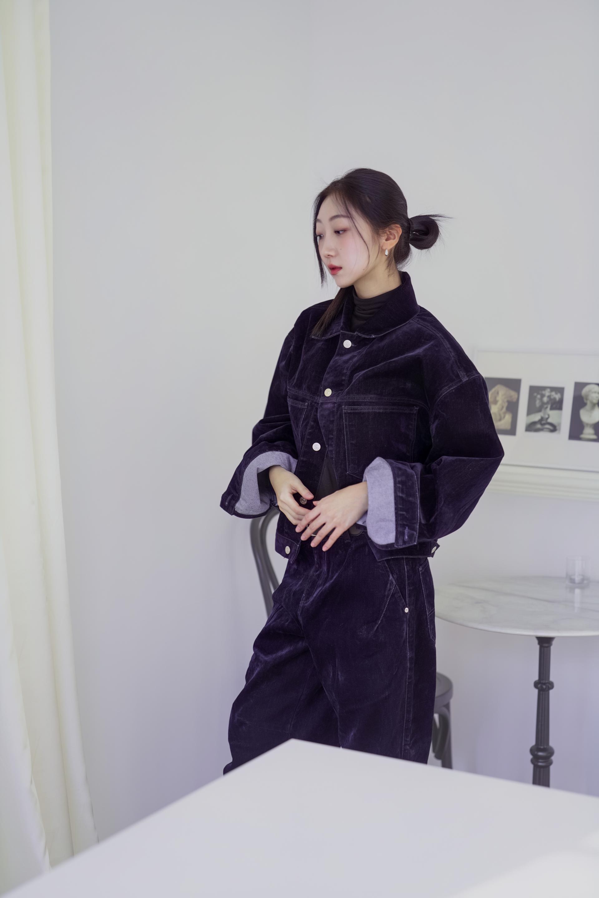 • 벨벳 특유의 은은한 광택감과 부드러운 표면 질감을 가미한 데님 셋업입니다. 빛의 각도에 따라 표면이 섬세하게 반짝이며, 입체적인 광택이 깊이 있는 무드를 형성합니다.