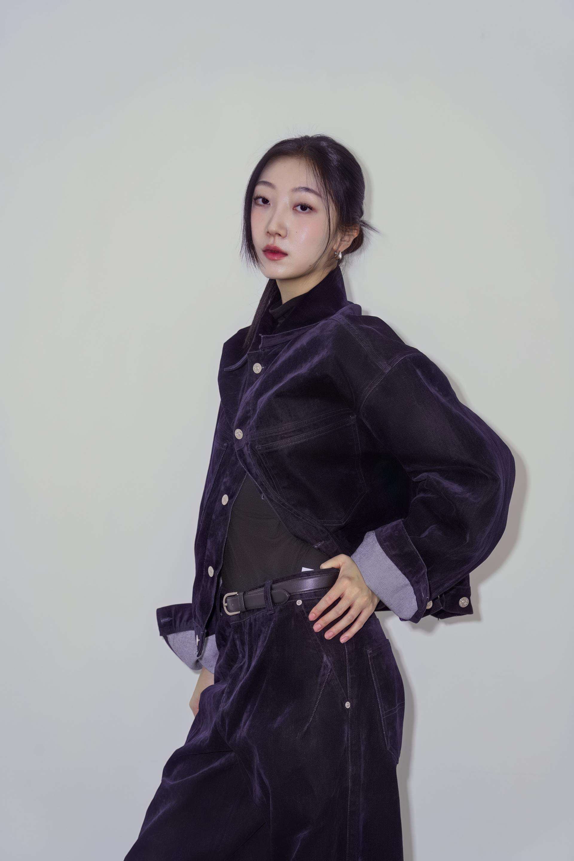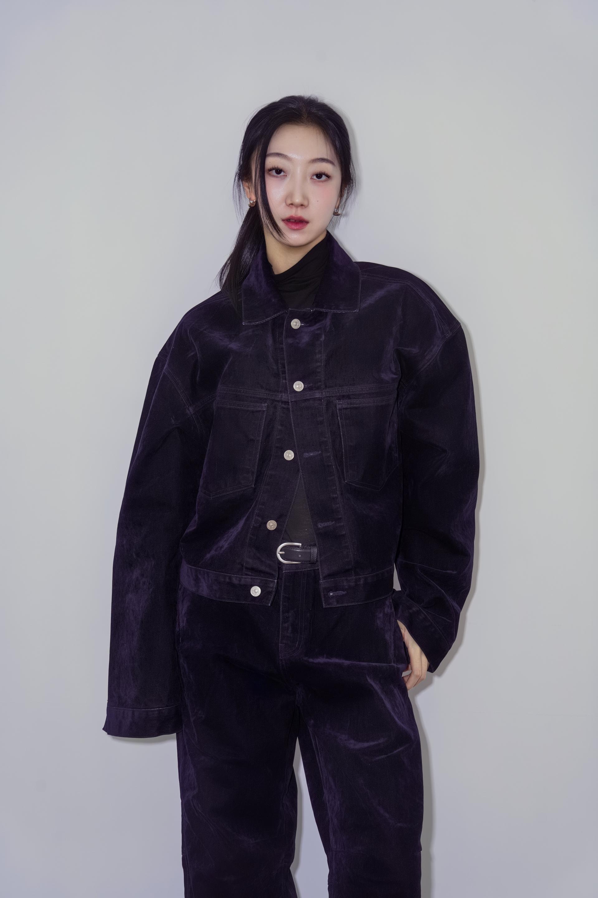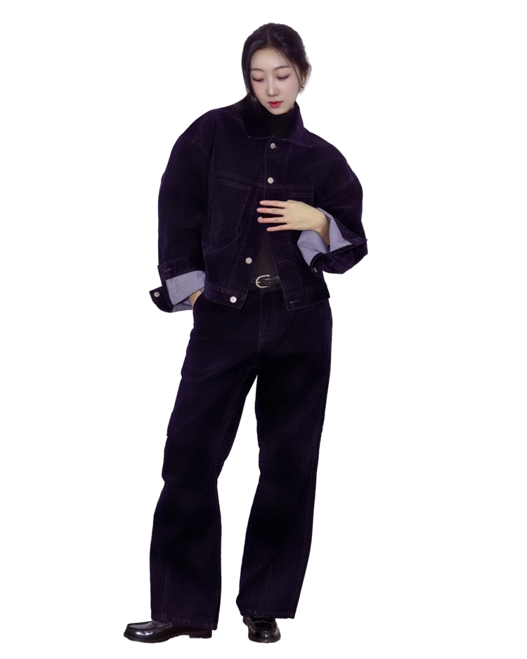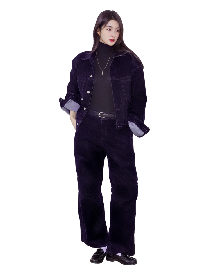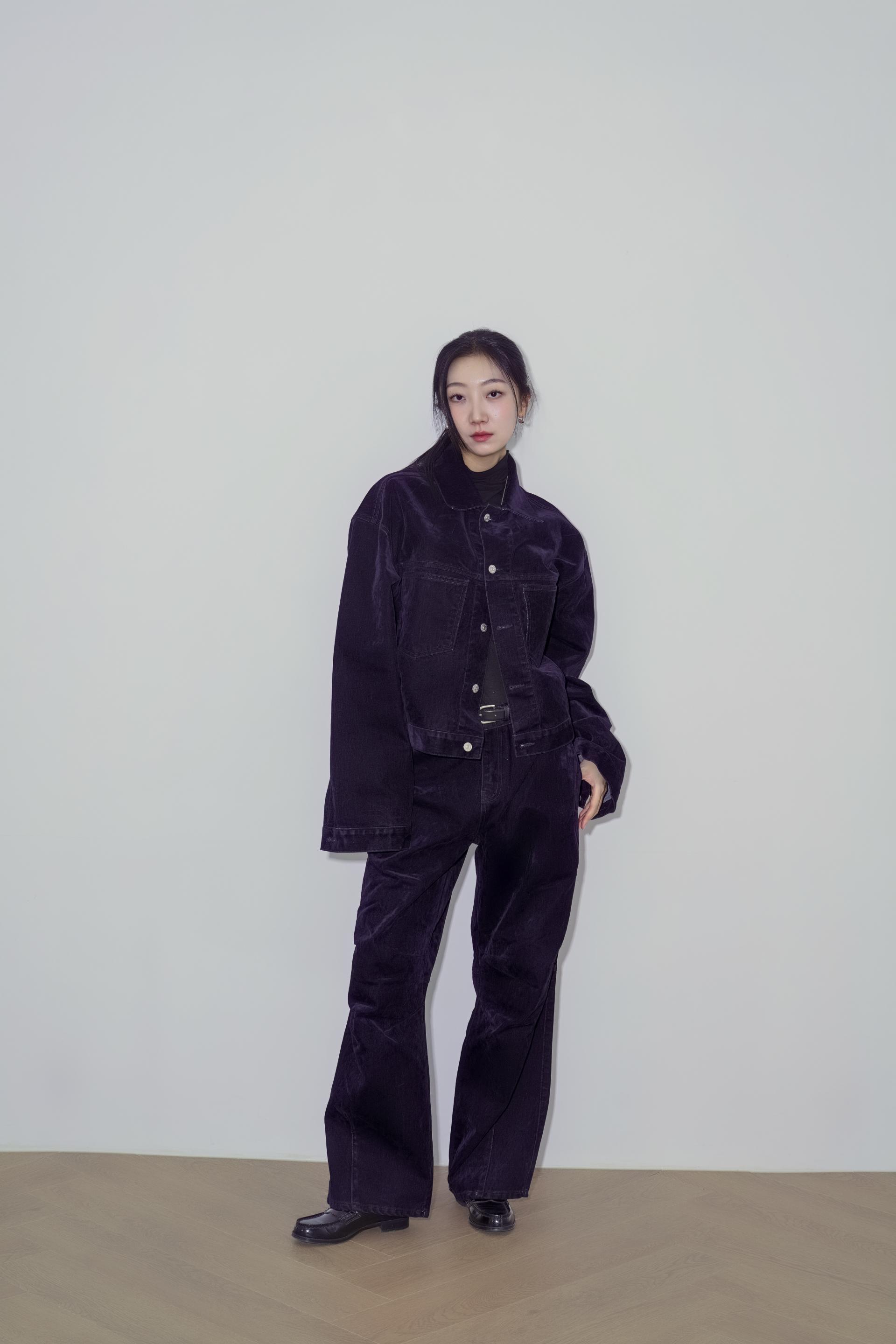 • 벨벳 특유의 은은한 광택감과 부드러운 표면 질감을 가미한 데님 셋업입니다. 빛의 각도에 따라 표면이 섬세하게 반짝이며, 입체적인 광택이 깊이 있는 무드를 형성합니다.
