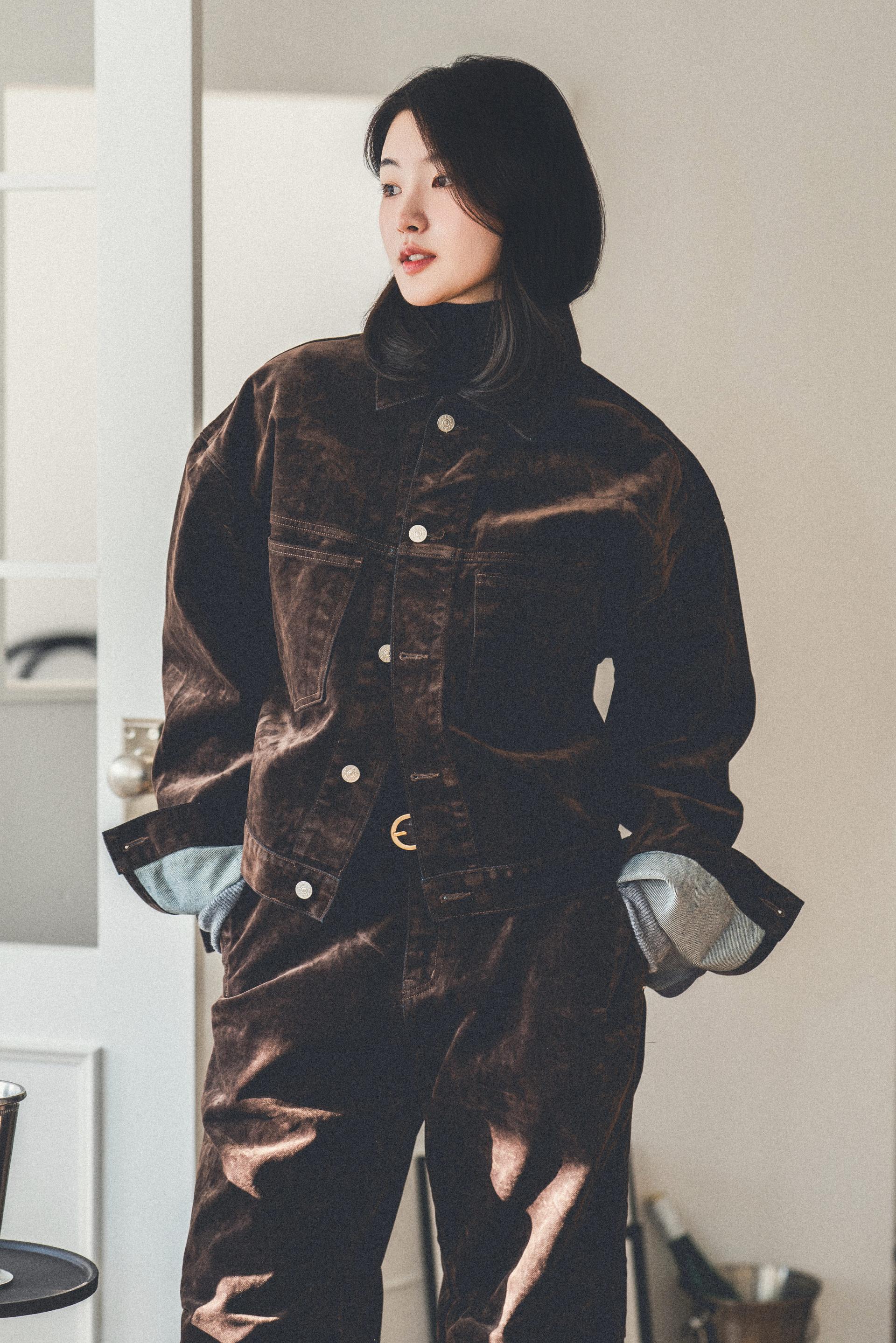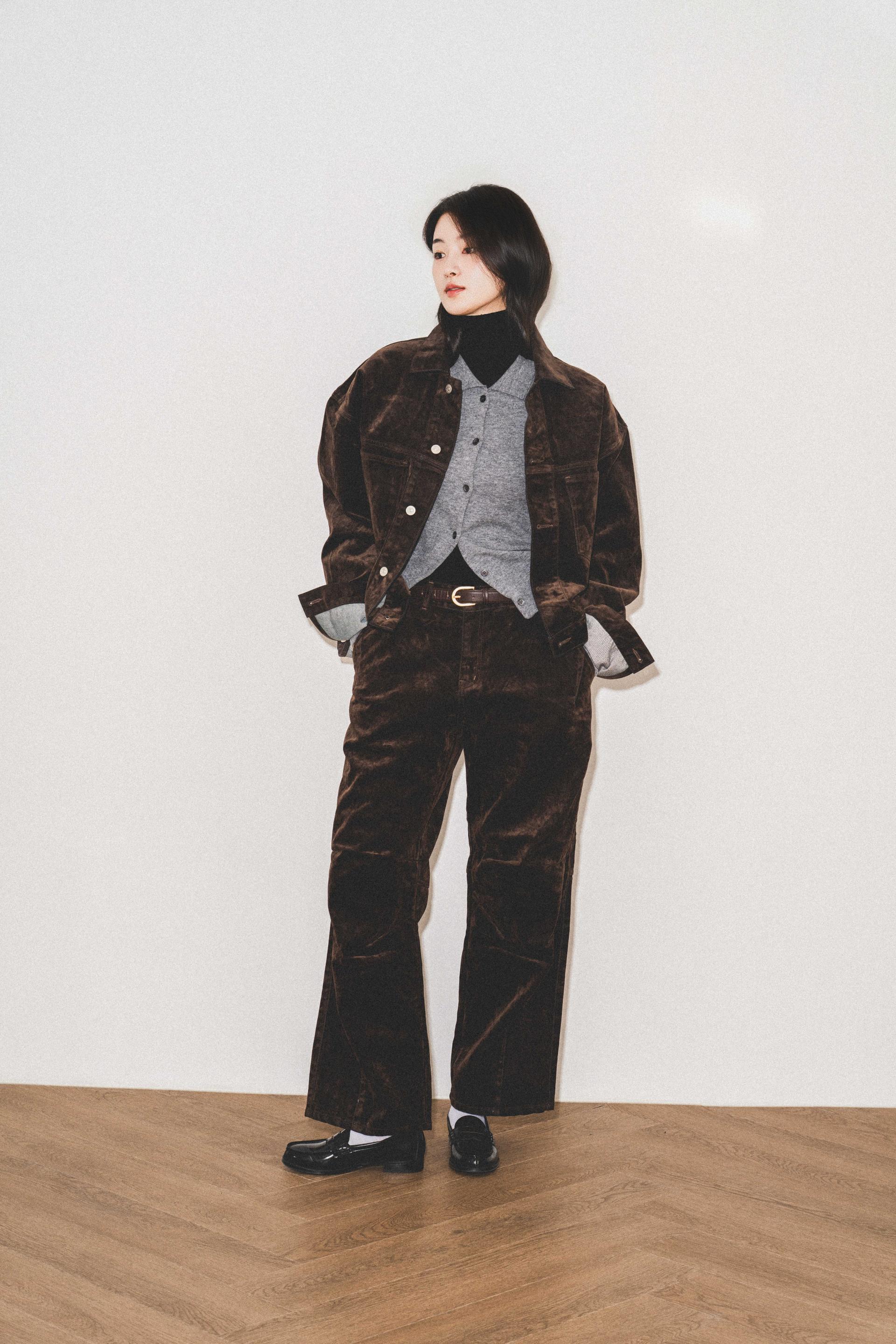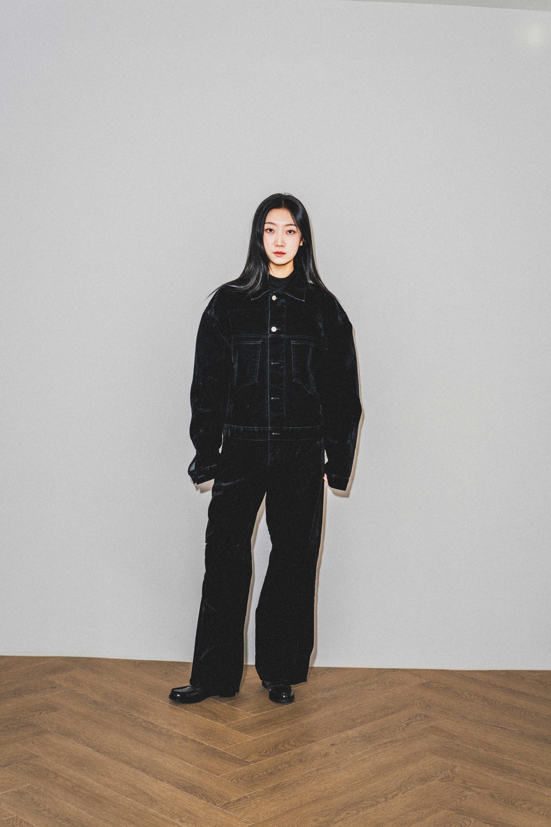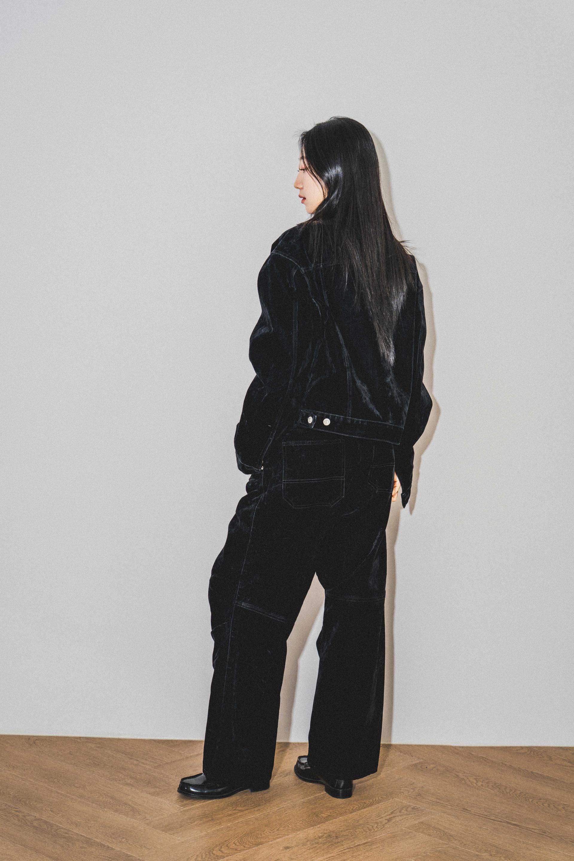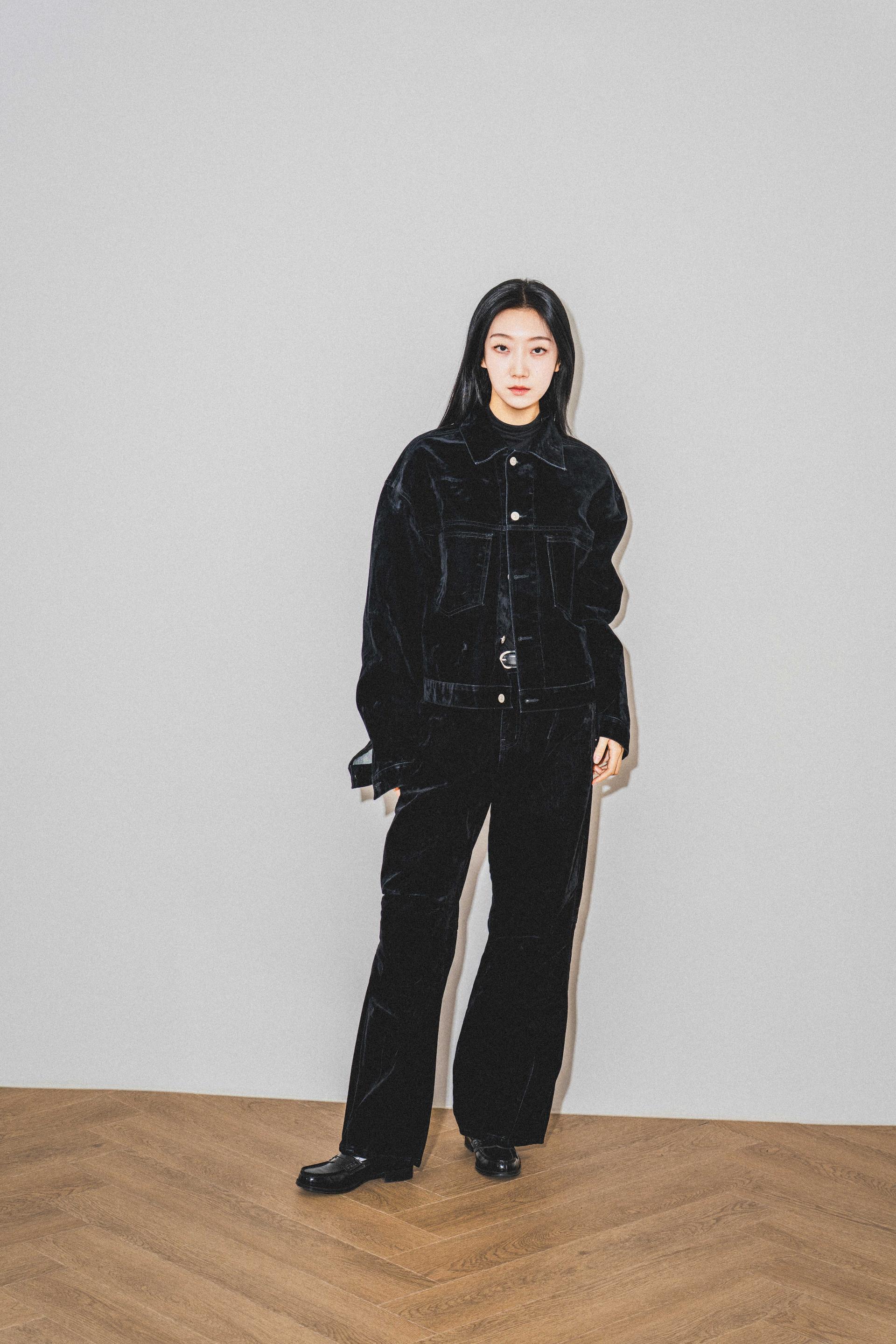 • 벨벳 특유의 은은한 광택감과 부드러운 표면 질감을 가미한 데님 셋업입니다. 빛의 각도에 따라 표면이 섬세하게 반짝이며, 입체적인 광택이 깊이 있는 무드를 형성합니다.