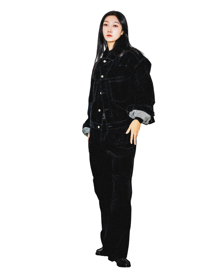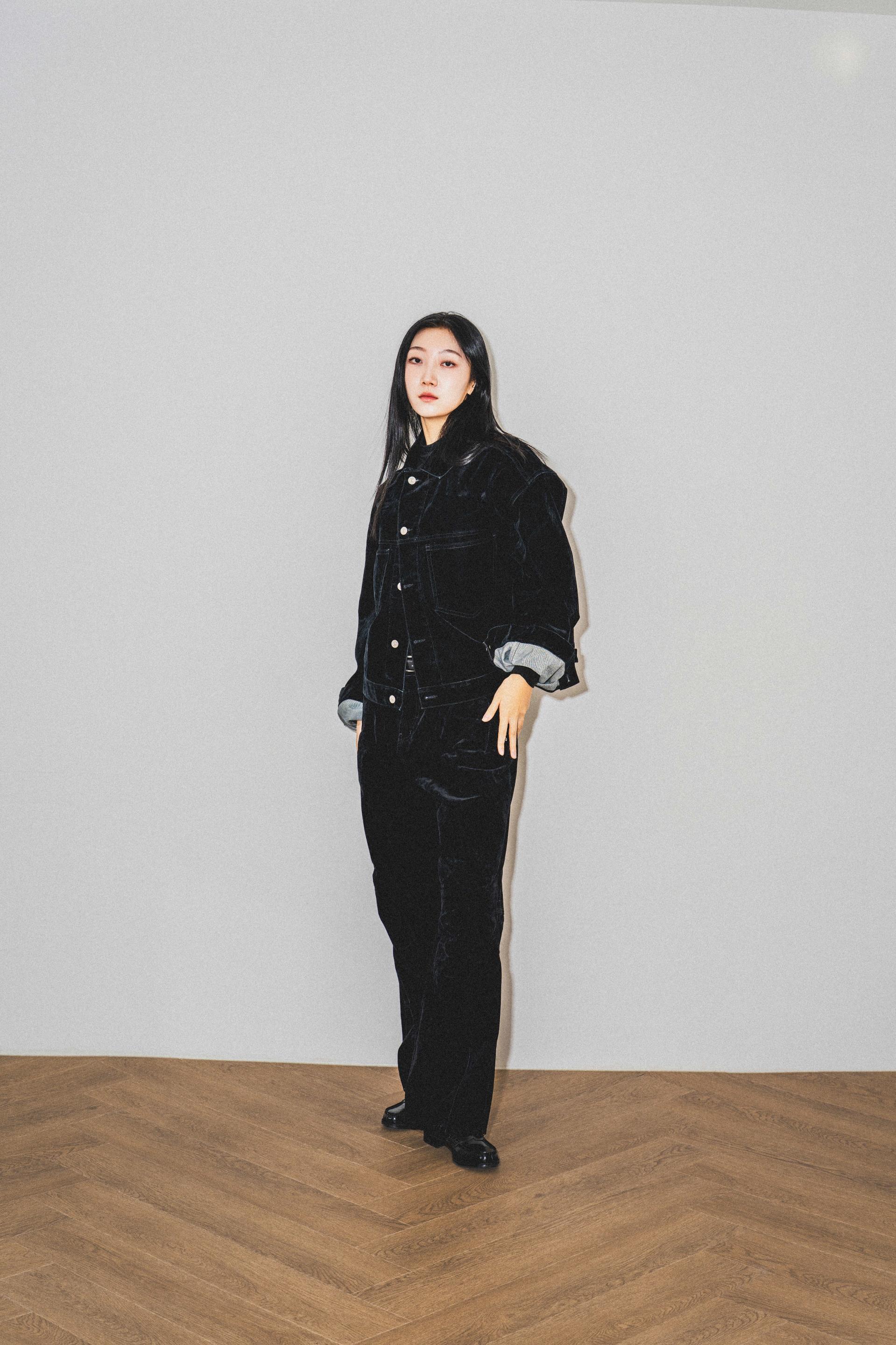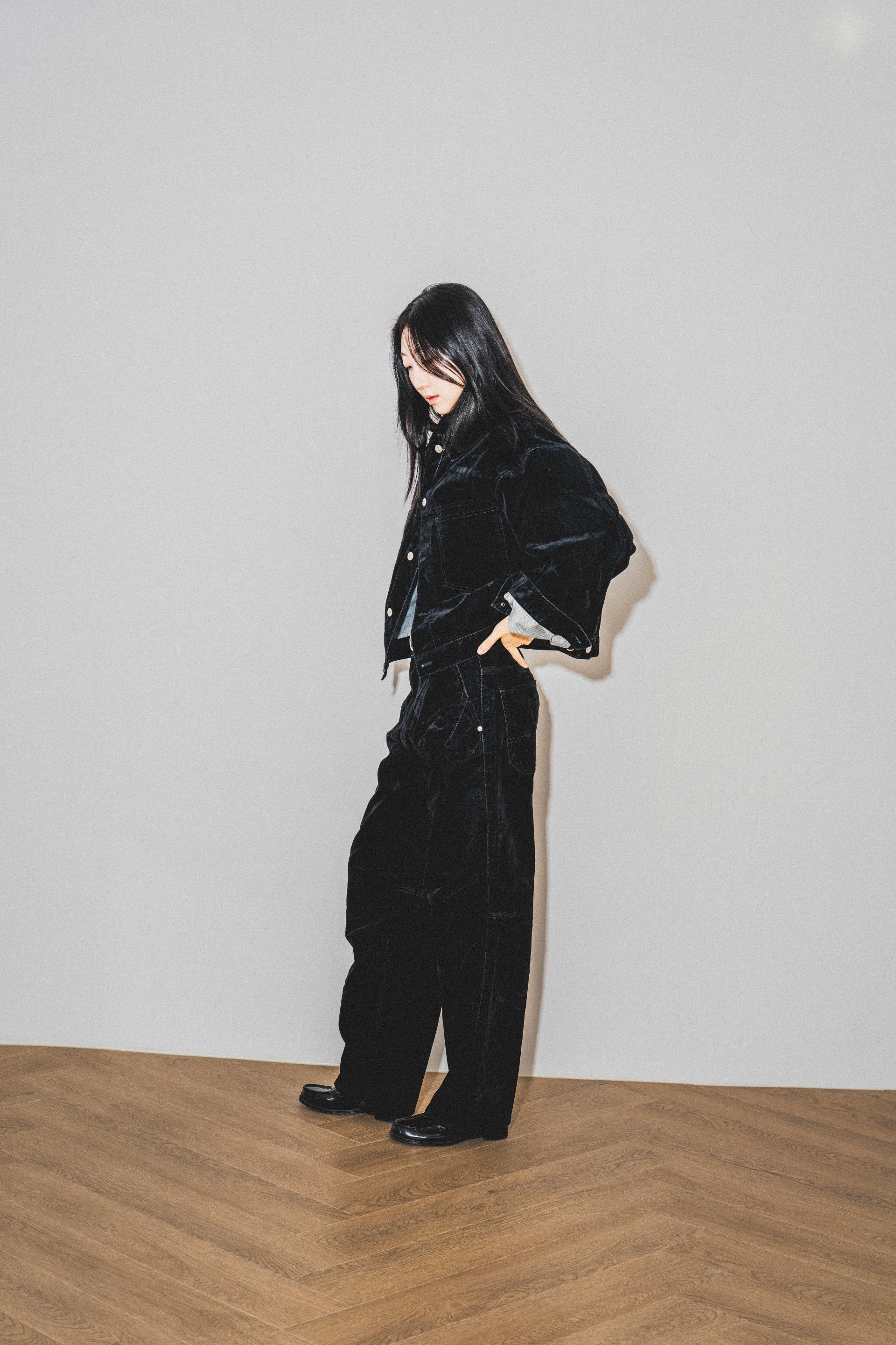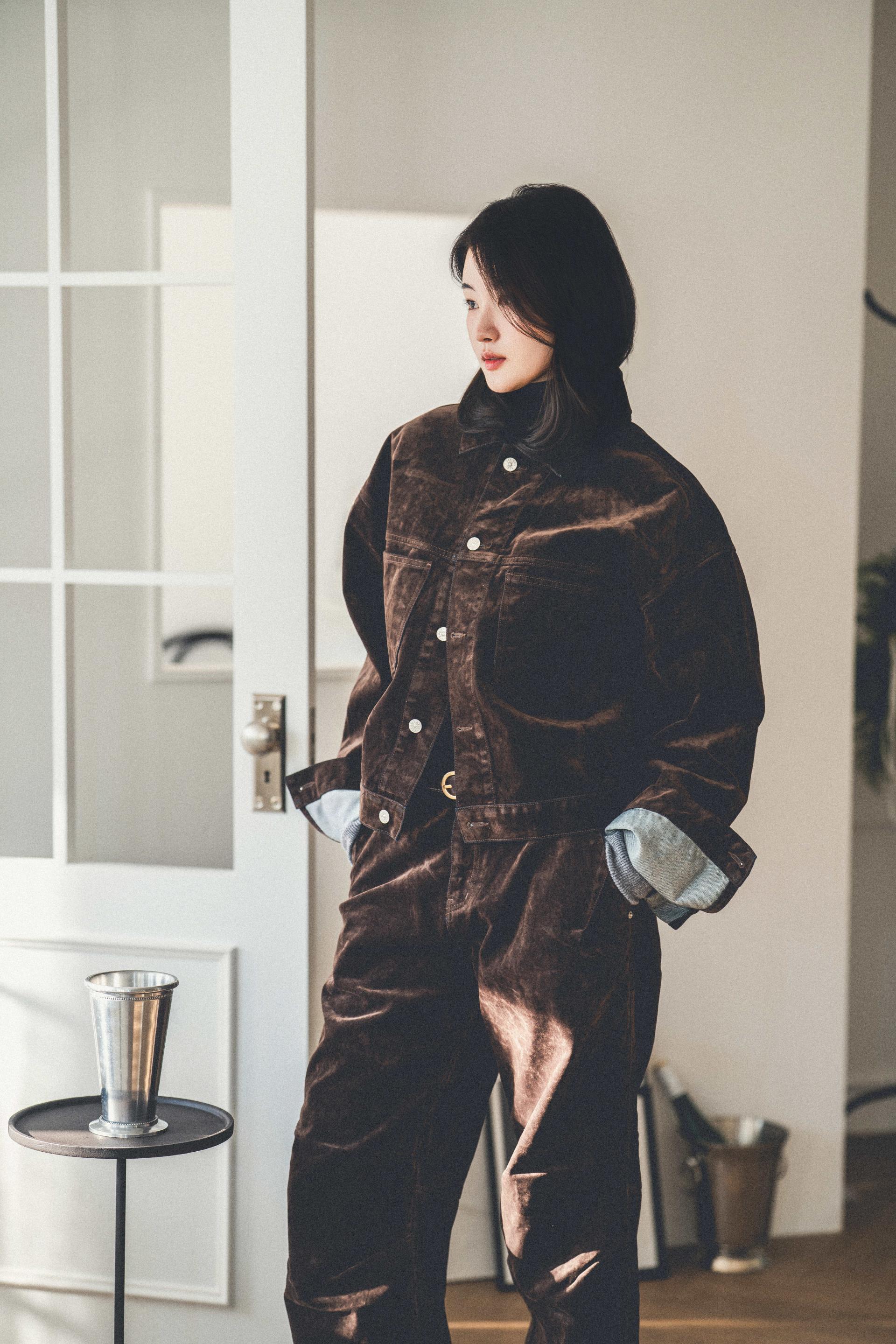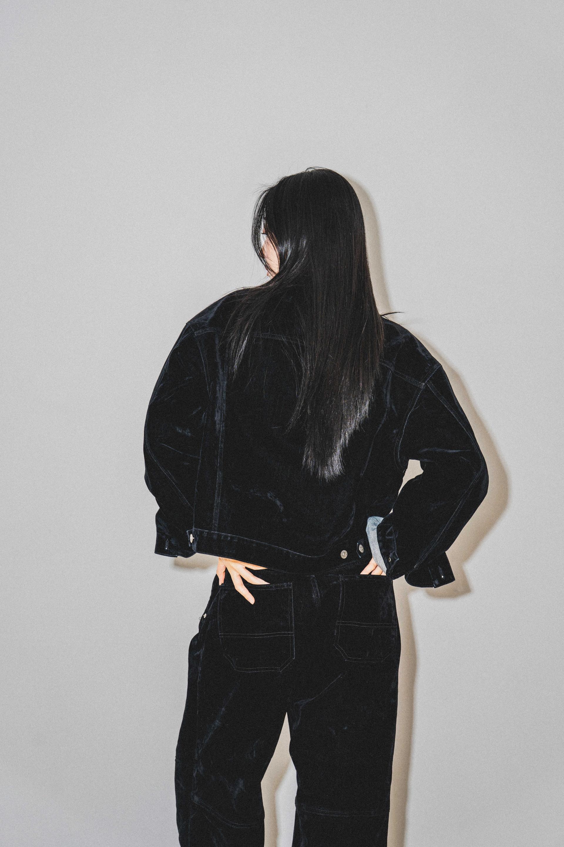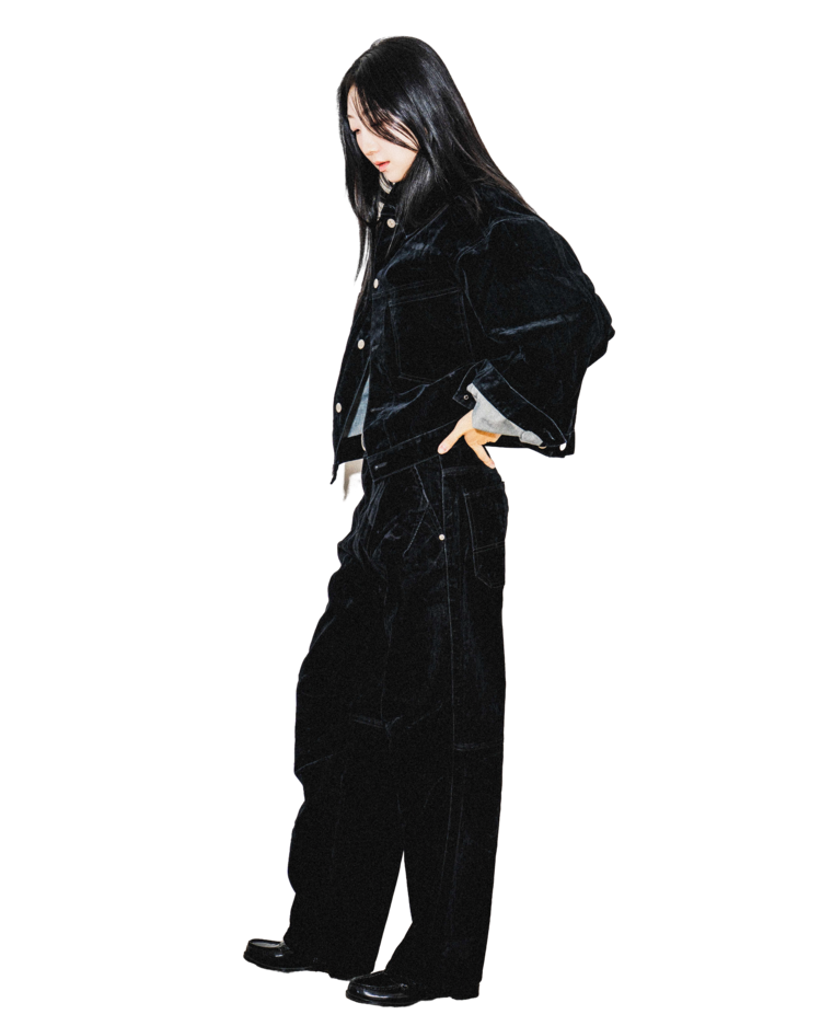 • 벨벳 특유의 은은한 광택감과 부드러운 표면 질감을 가미한 데님 셋업입니다. 빛의 각도에 따라 표면이 섬세하게 반짝이며, 입체적인 광택이 깊이 있는 무드를 형성합니다.