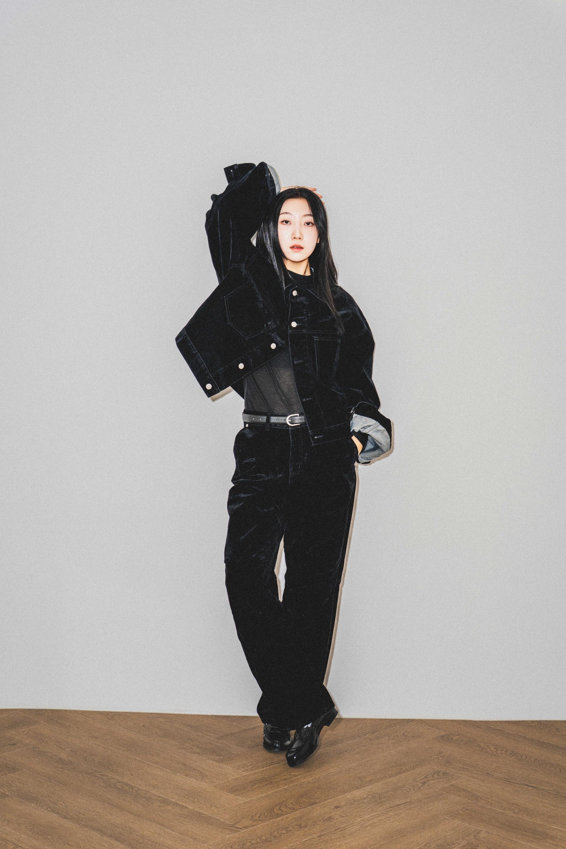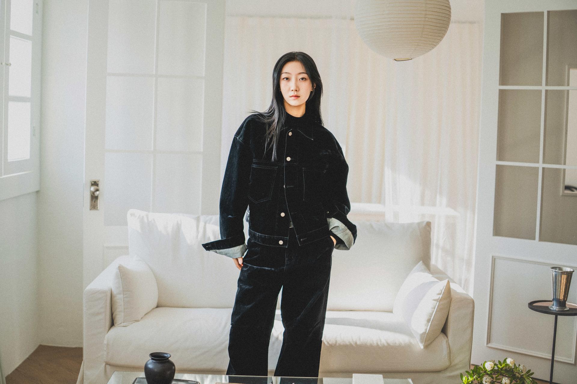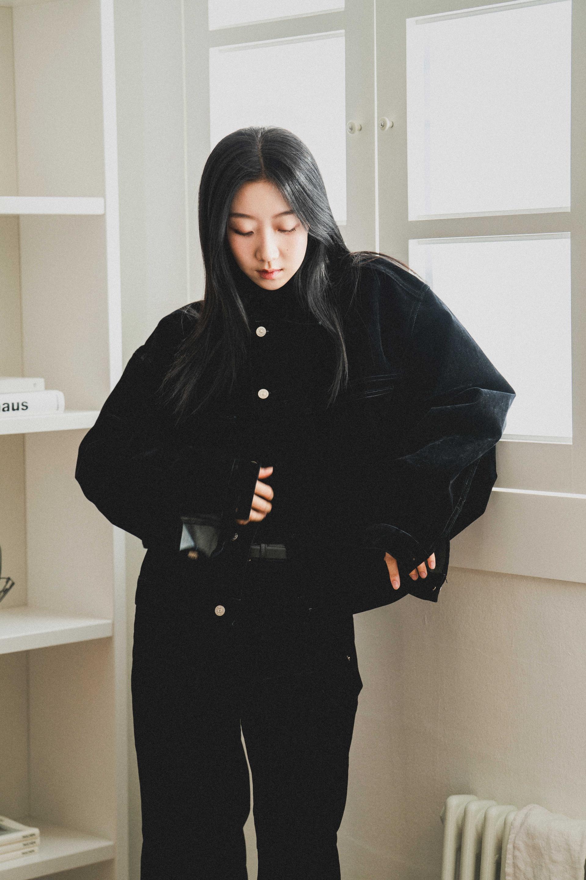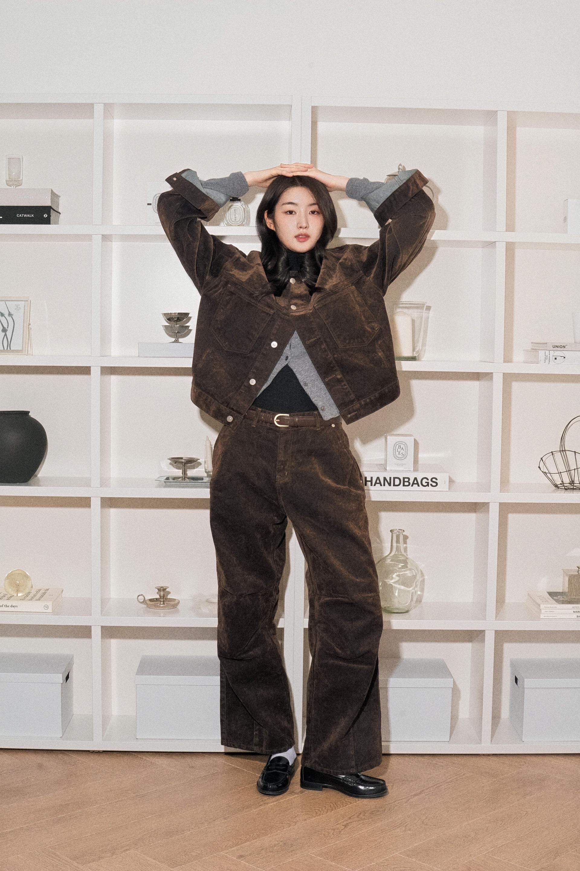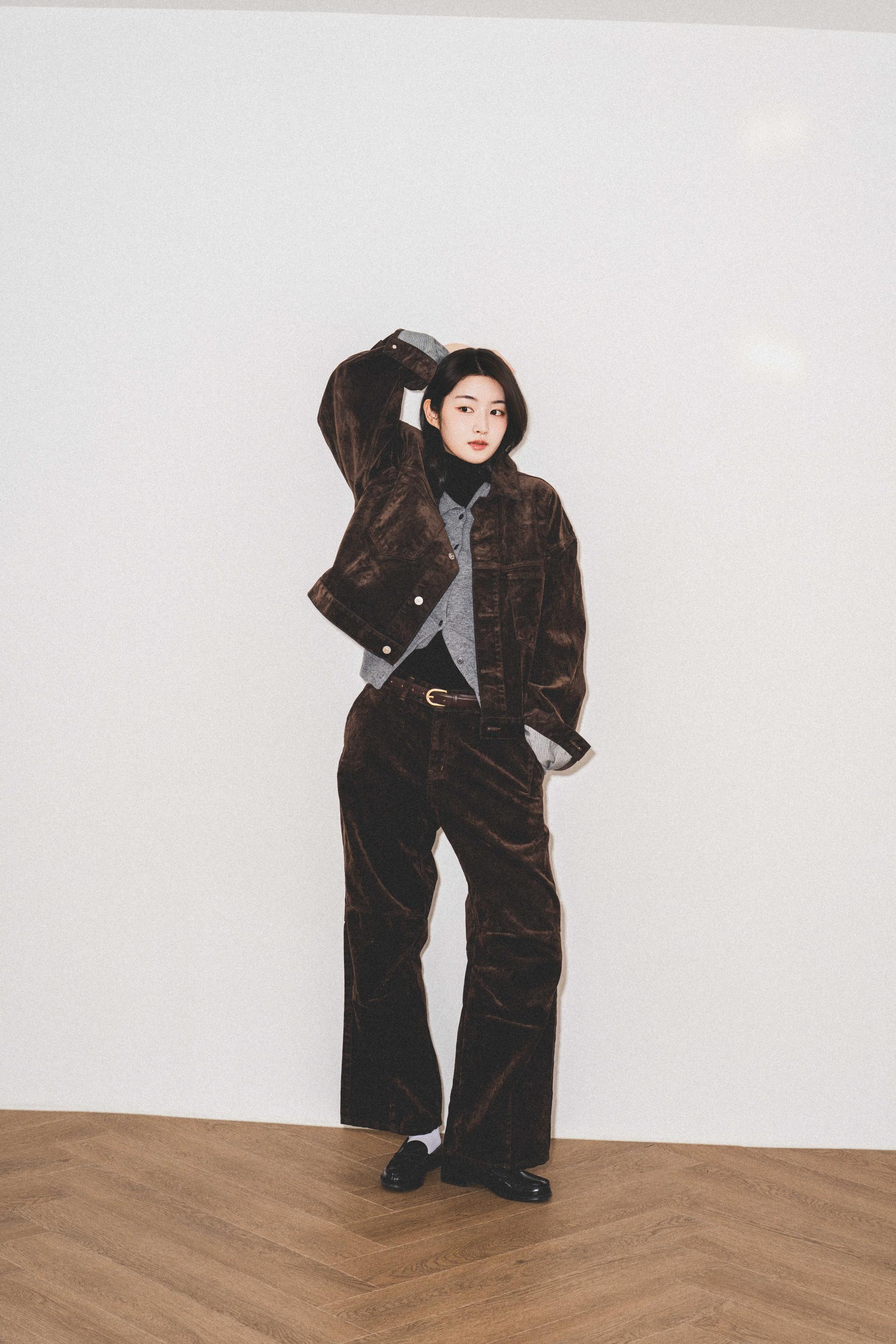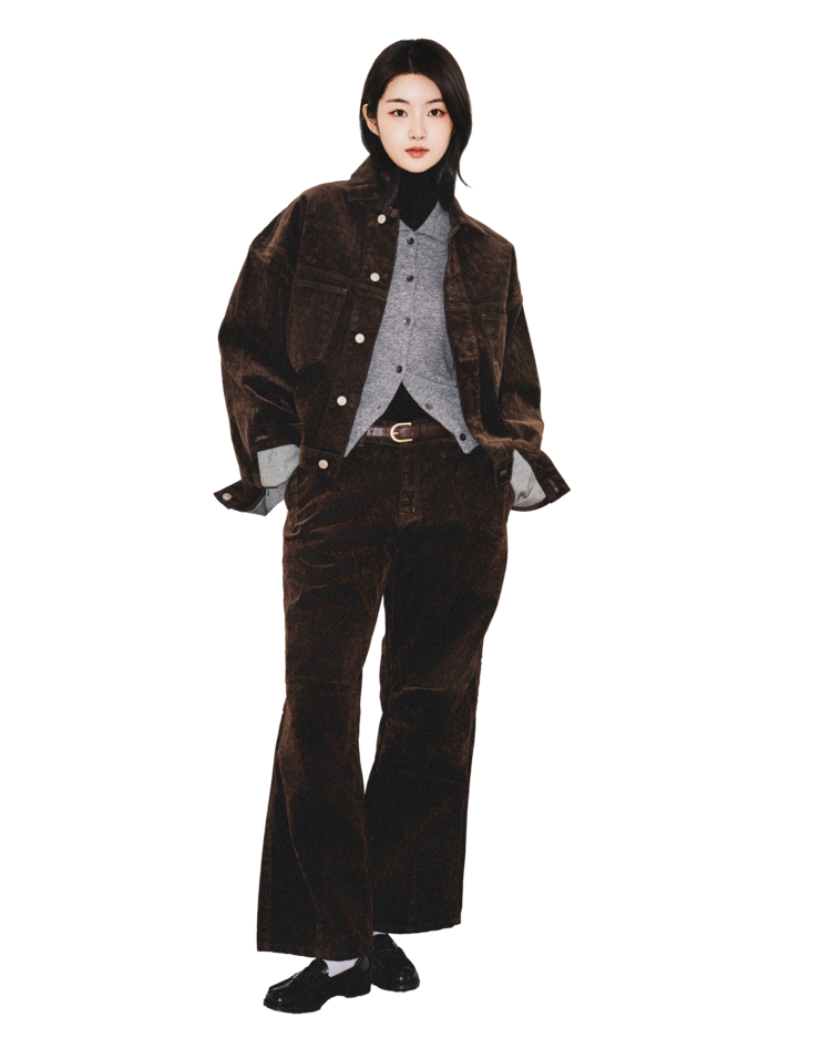 • 벨벳 특유의 은은한 광택감과 부드러운 표면 질감을 가미한 데님 셋업입니다. 빛의 각도에 따라 표면이 섬세하게 반짝이며, 입체적인 광택이 깊이 있는 무드를 형성합니다.