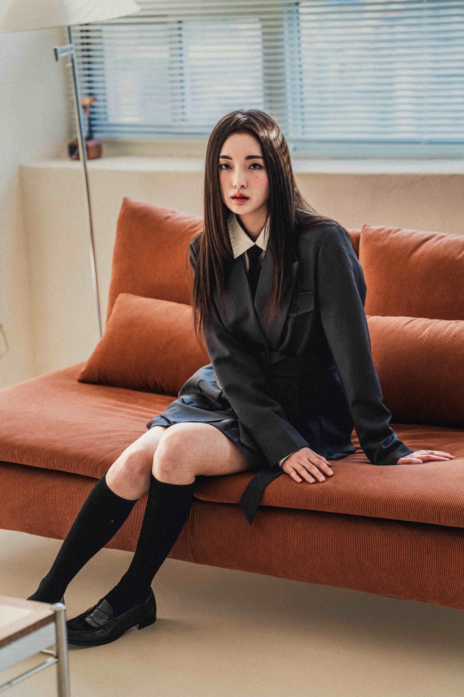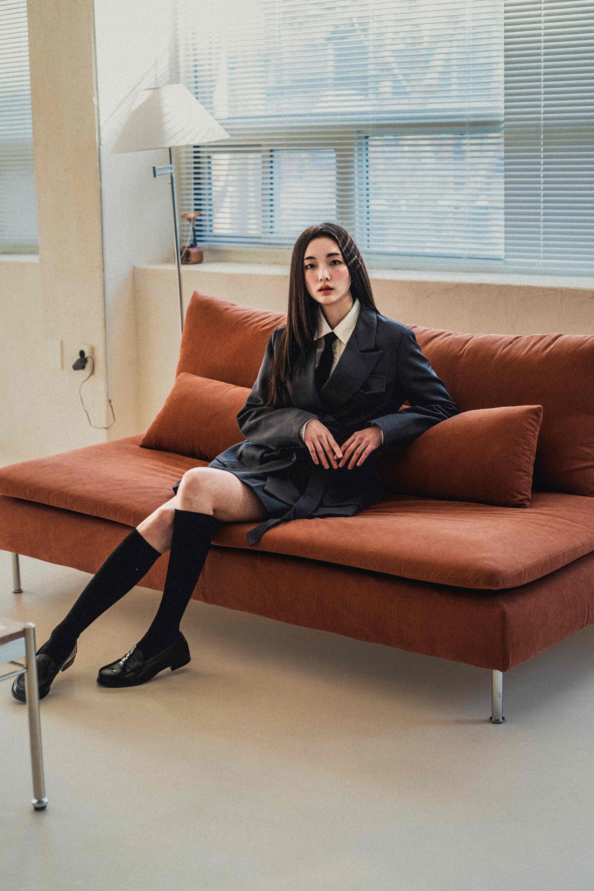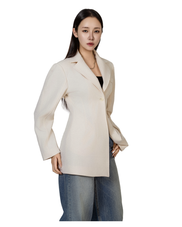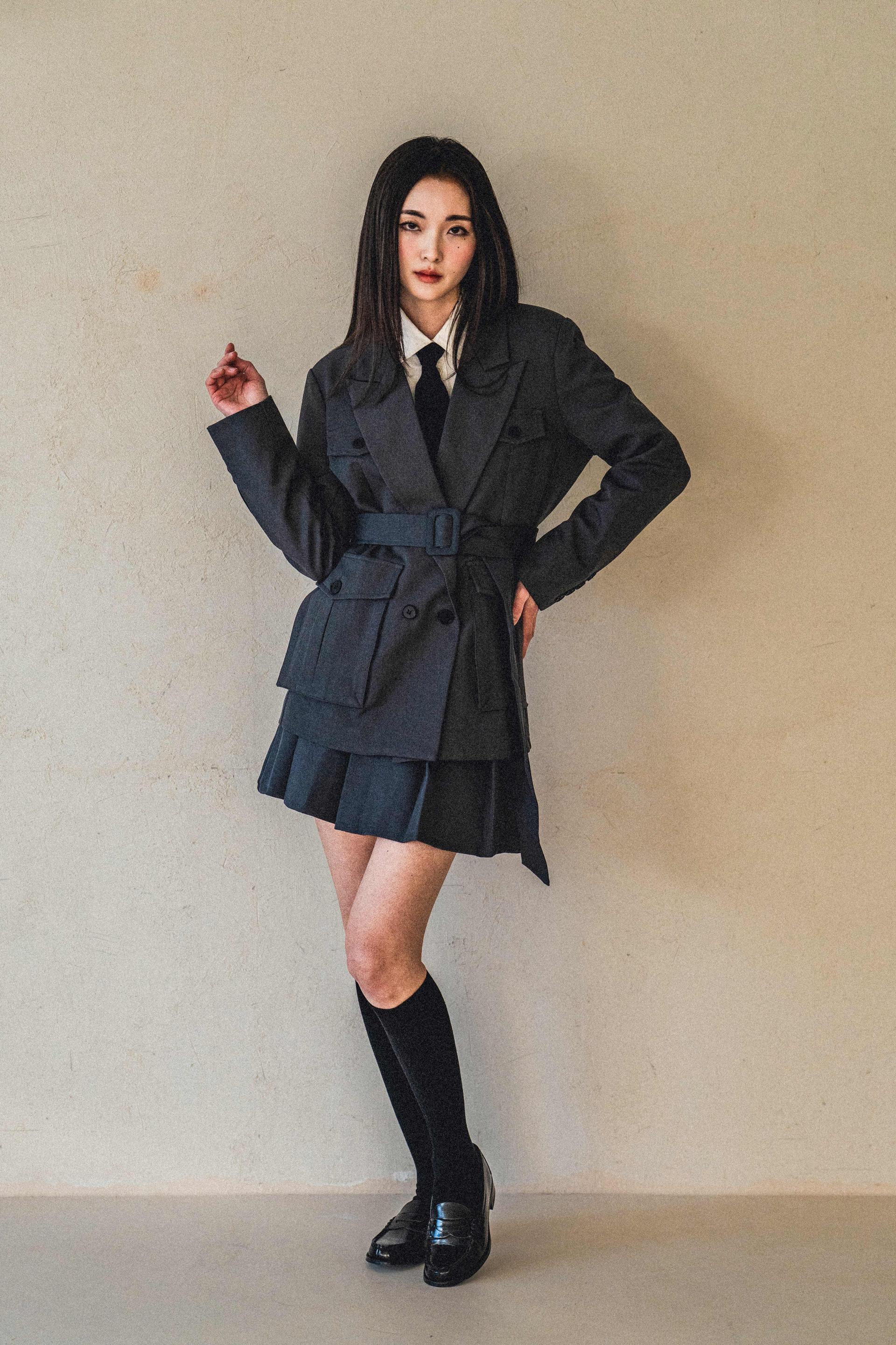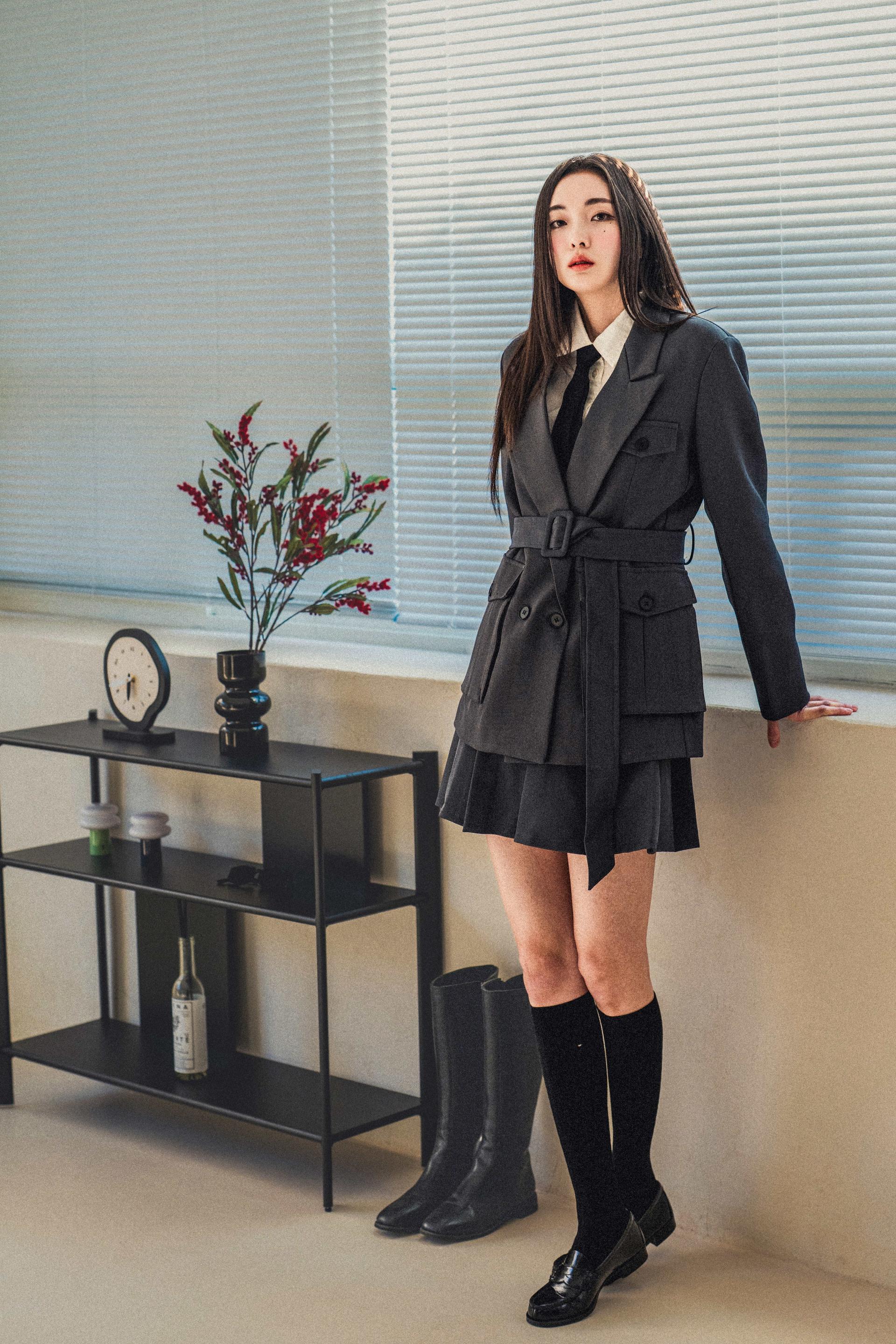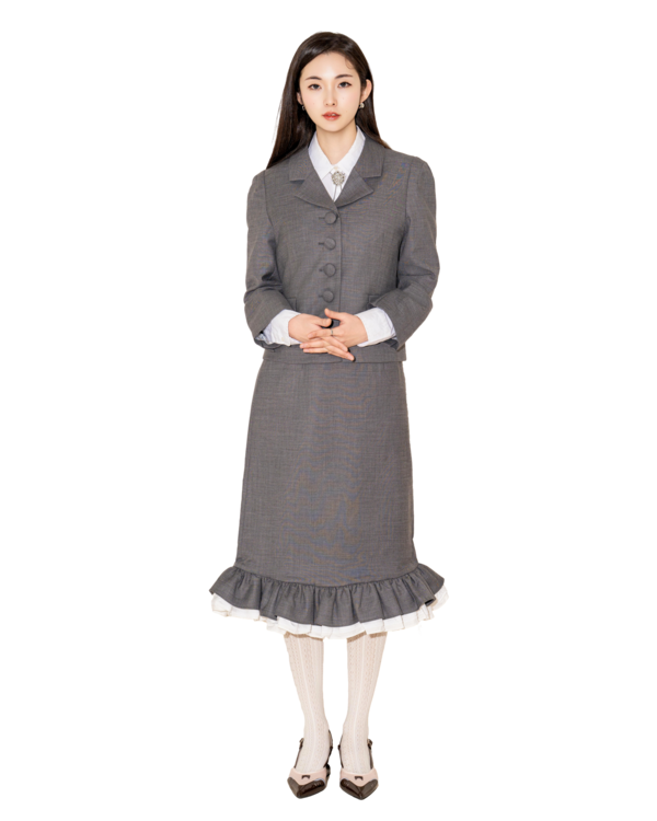 • 자켓은 상체를 슬림하게 정리해주고, 스커트는 자연스러운 플레어 라인으로 대비되는 볼륨감을 형성합니다.