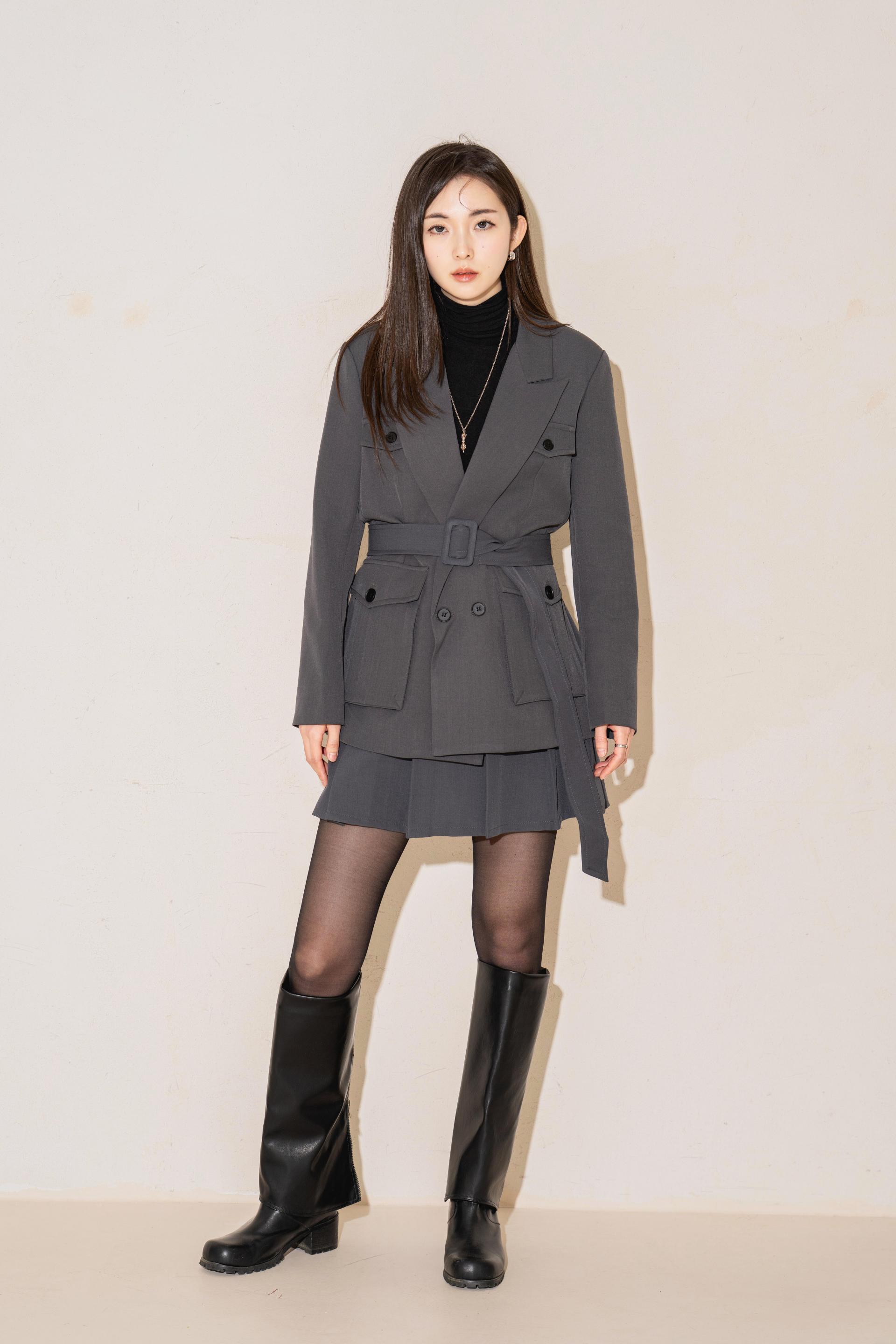 • 더블브레스티드 구조에 버튼 플랩 포켓과 웨이스트 벨트가 더해져 입체감 있는 실루엣을 연출합니다.
