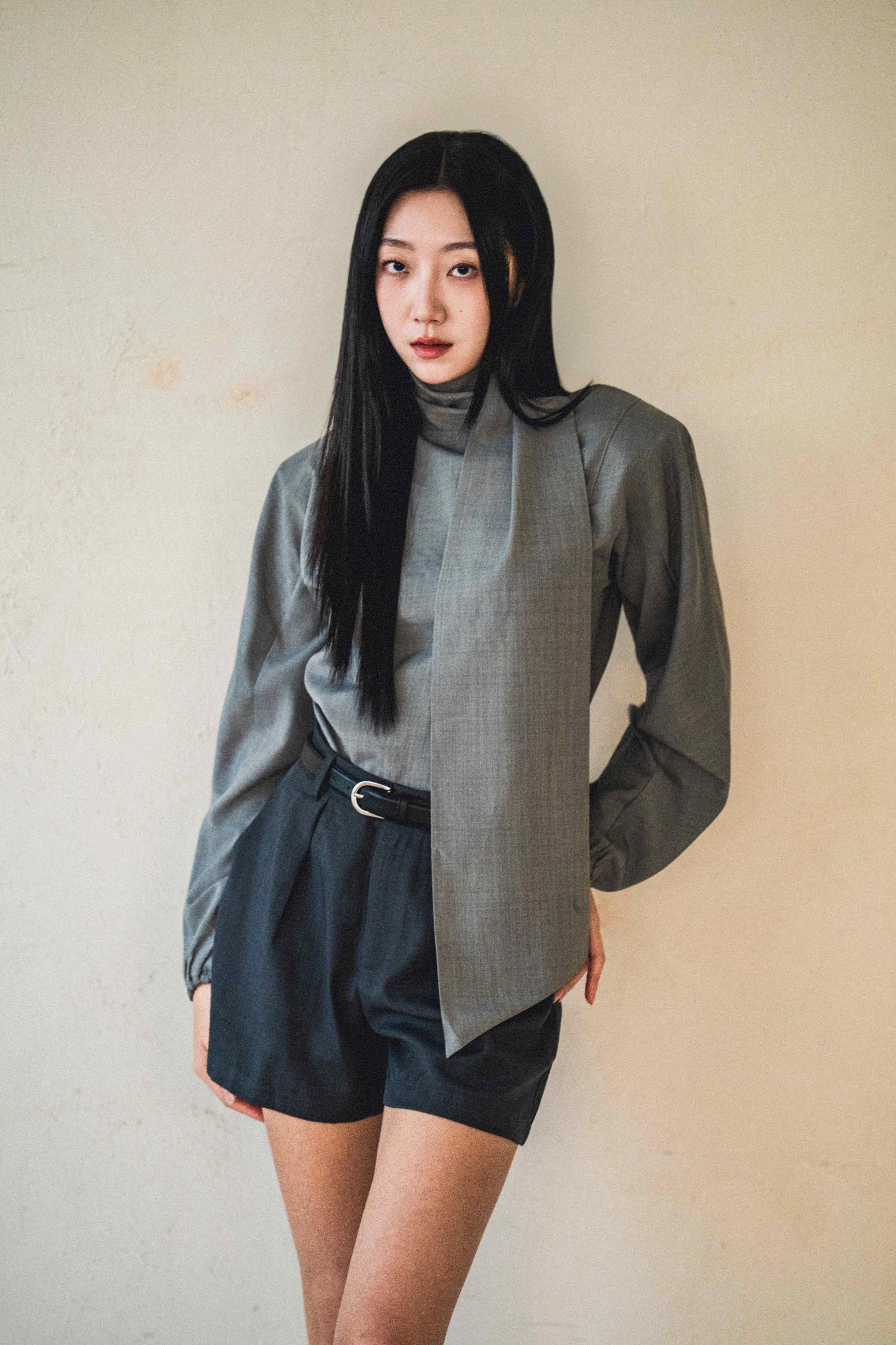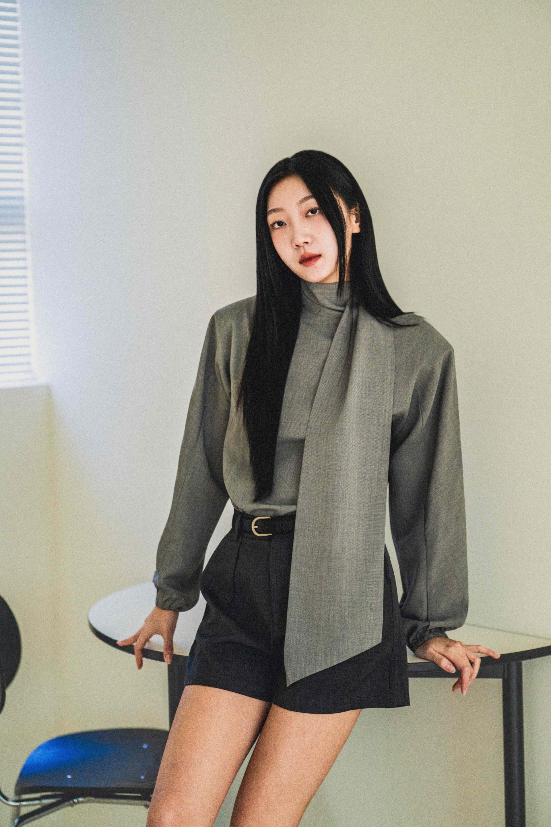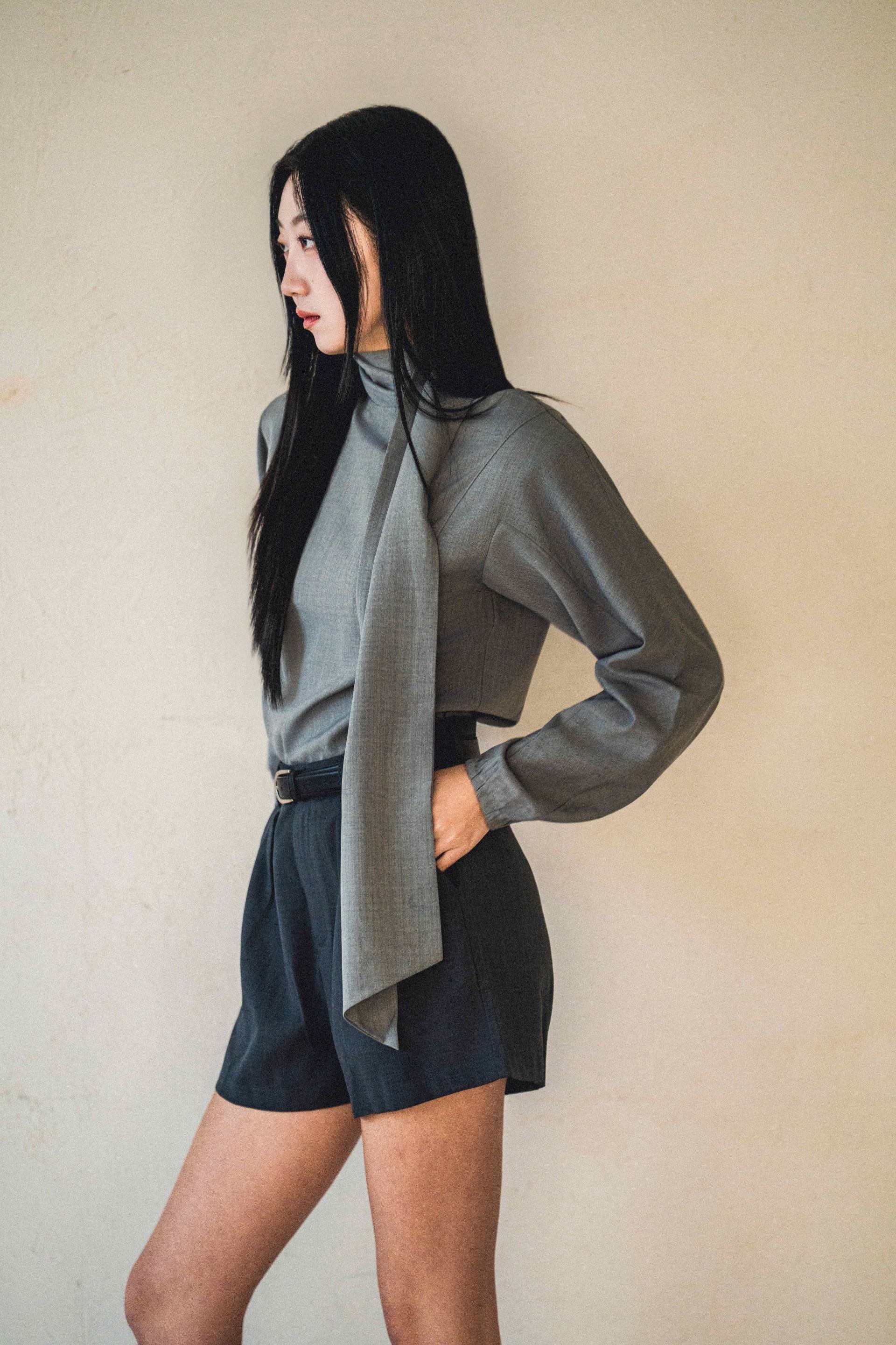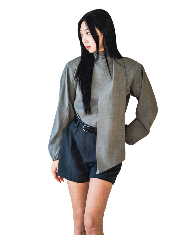 • 셔츠는 미니멀한 하이넥 라인과 언밸런스한 스카프 장식이 조화를 이루며, 단정하면서도 유연한 포인트를 줍니다.