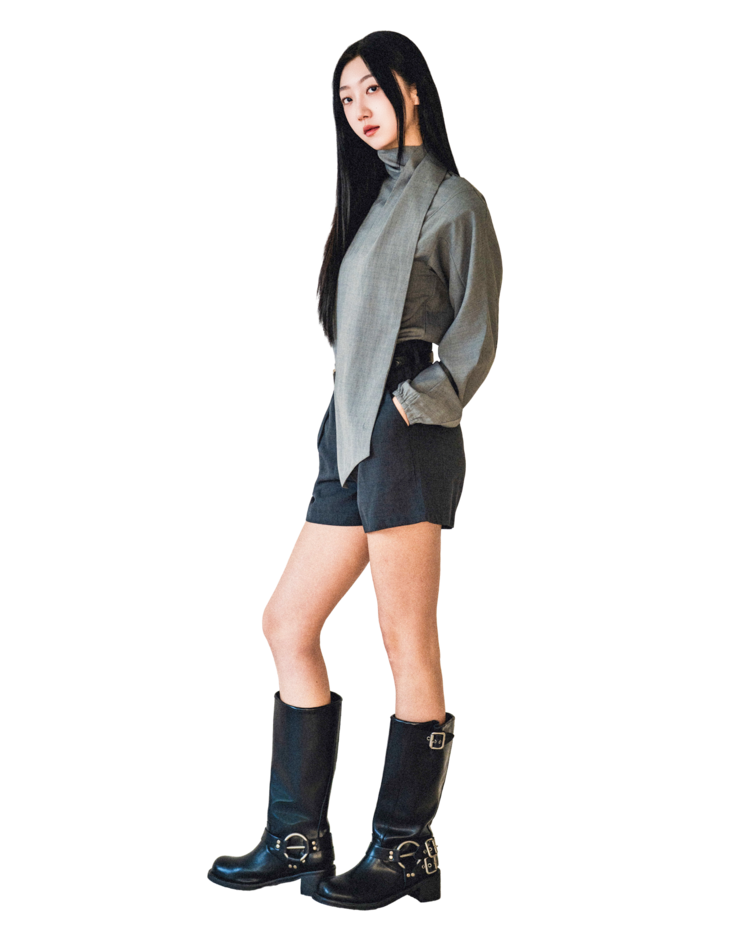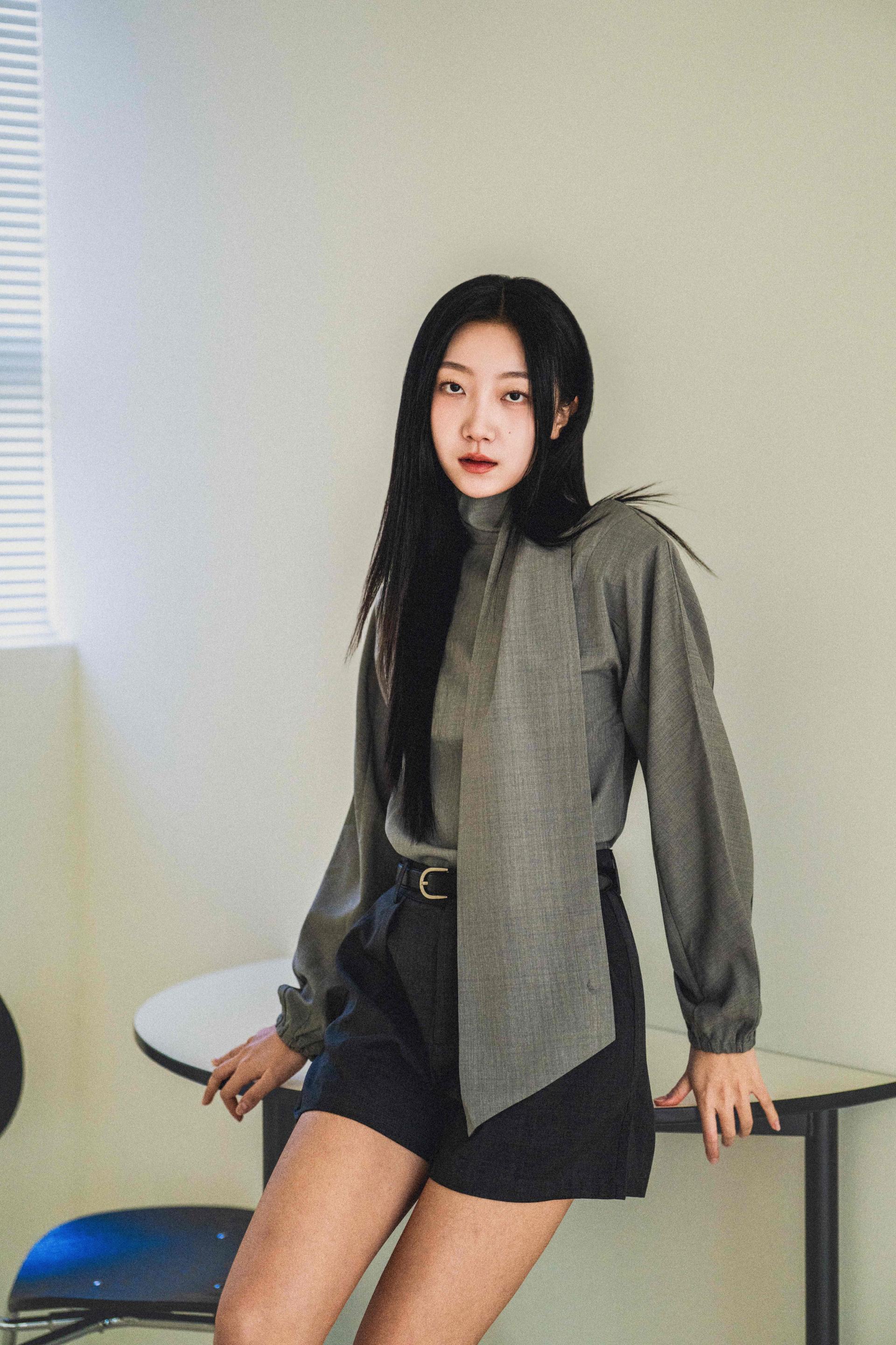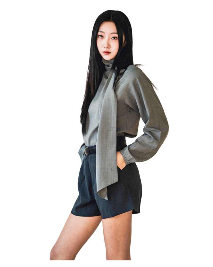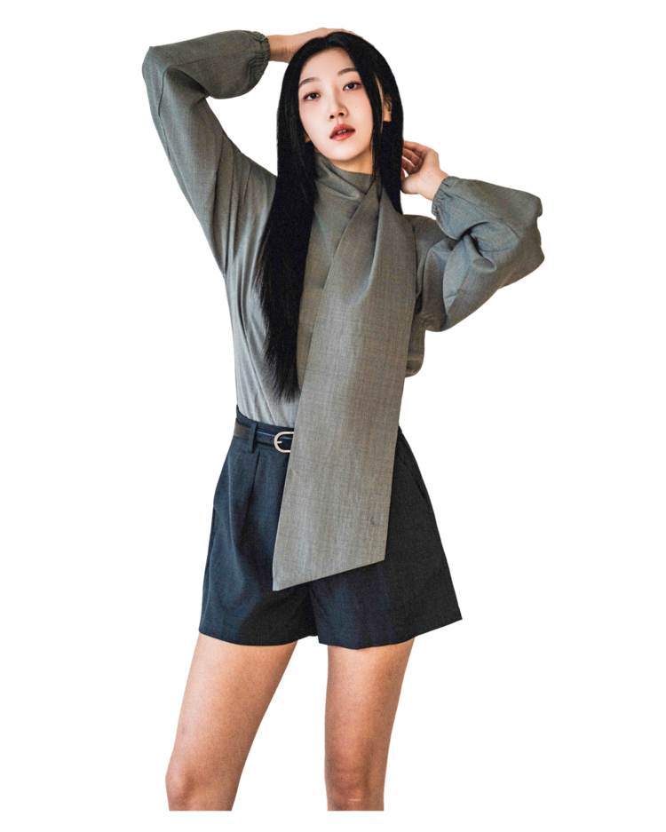 • 셔츠는 미니멀한 하이넥 라인과 언밸런스한 스카프 장식이 조화를 이루며, 단정하면서도 유연한 포인트를 줍니다.