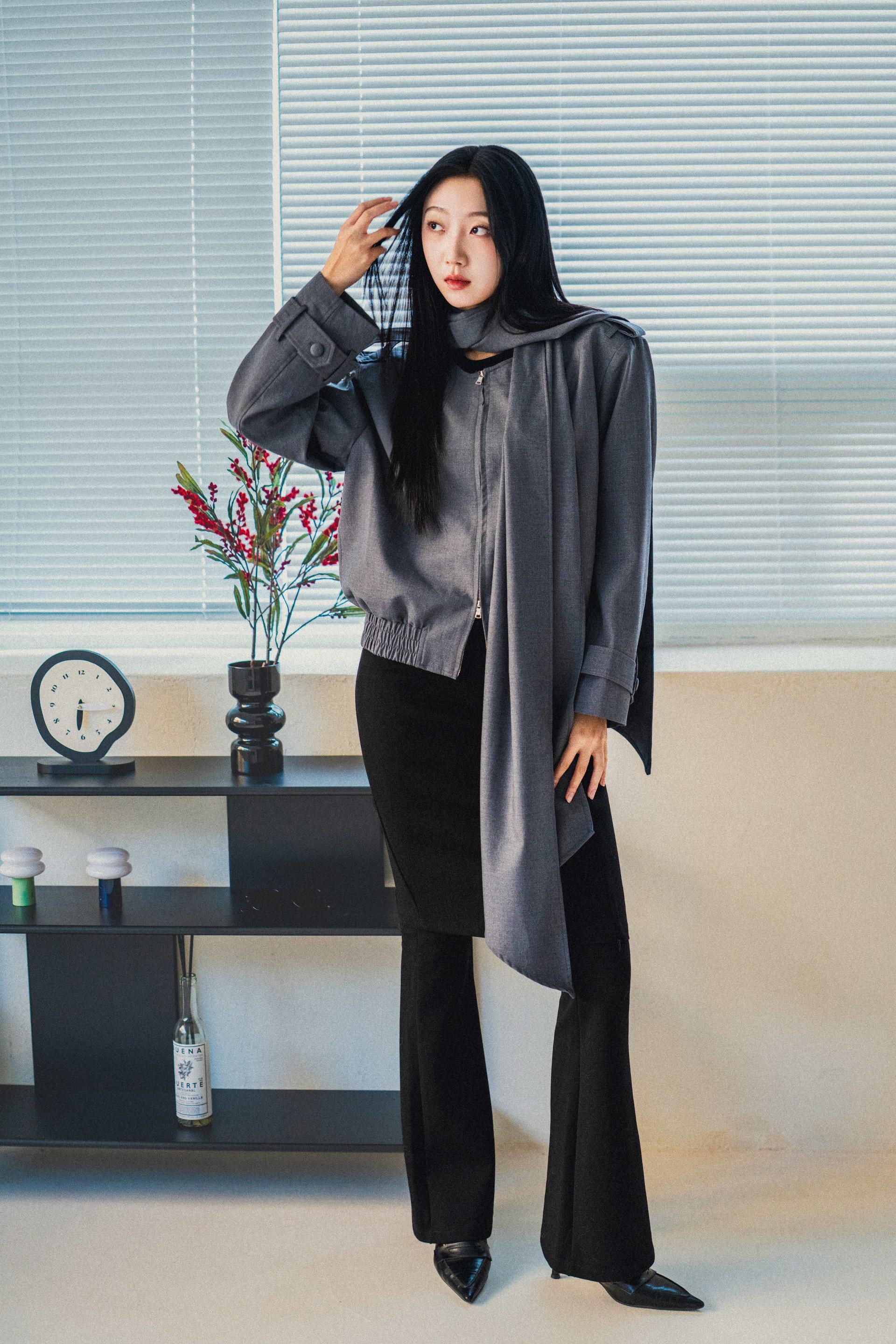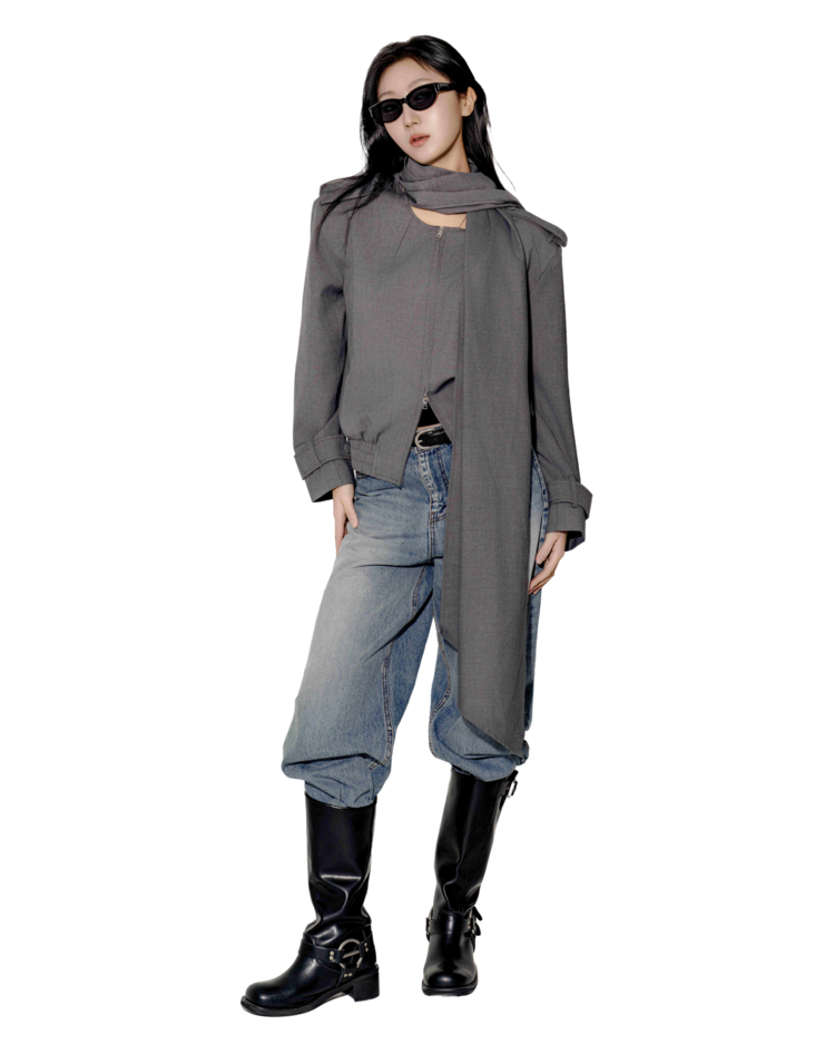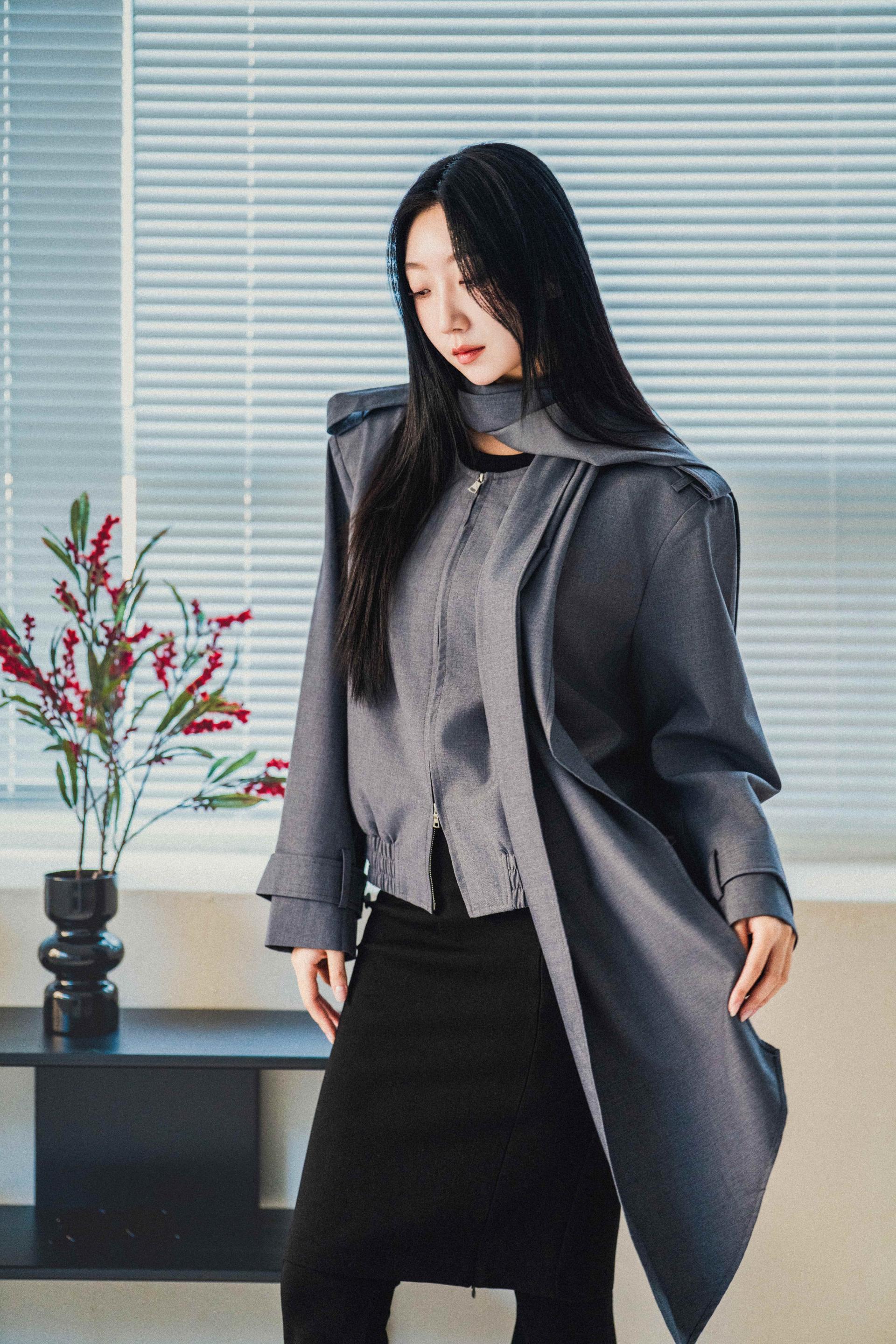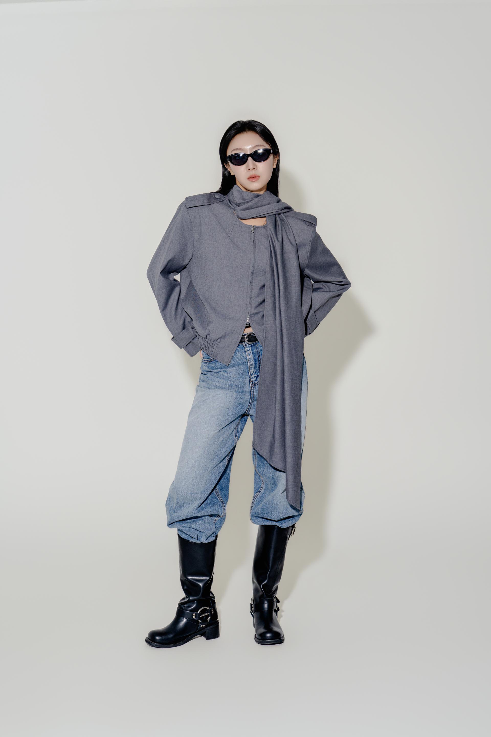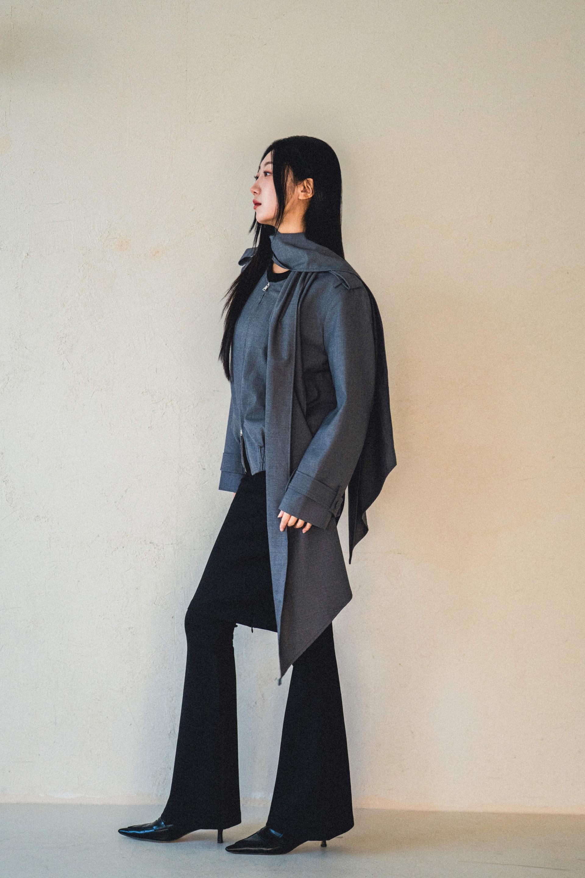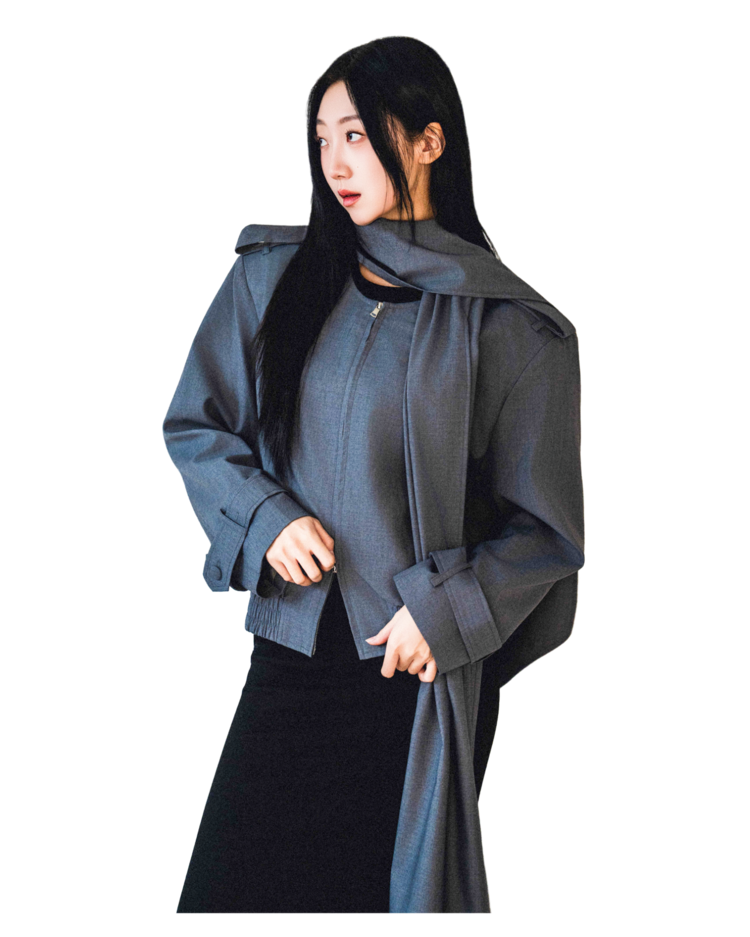 "롱 스카프 디테일 덕분에 자켓 하나만 걸쳐도 완성도 있는 느낌이에요. 어깨선이나 소매 끝 디테일도 단단하게 잡혀서 전체적인 실루엣이 무너지지 않아요."