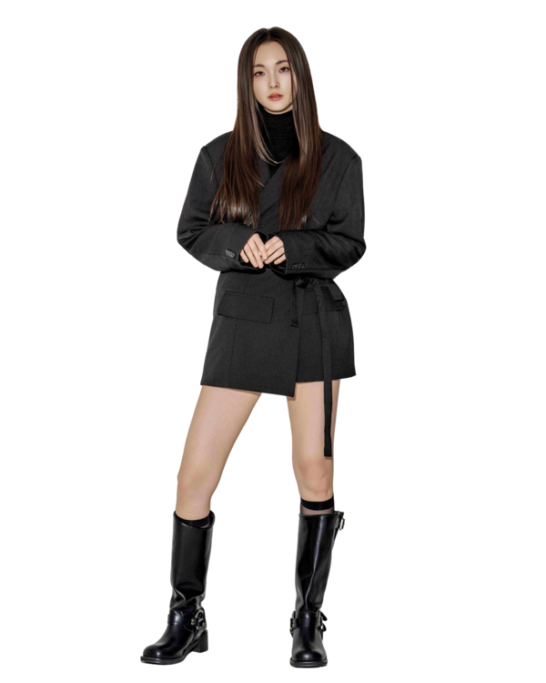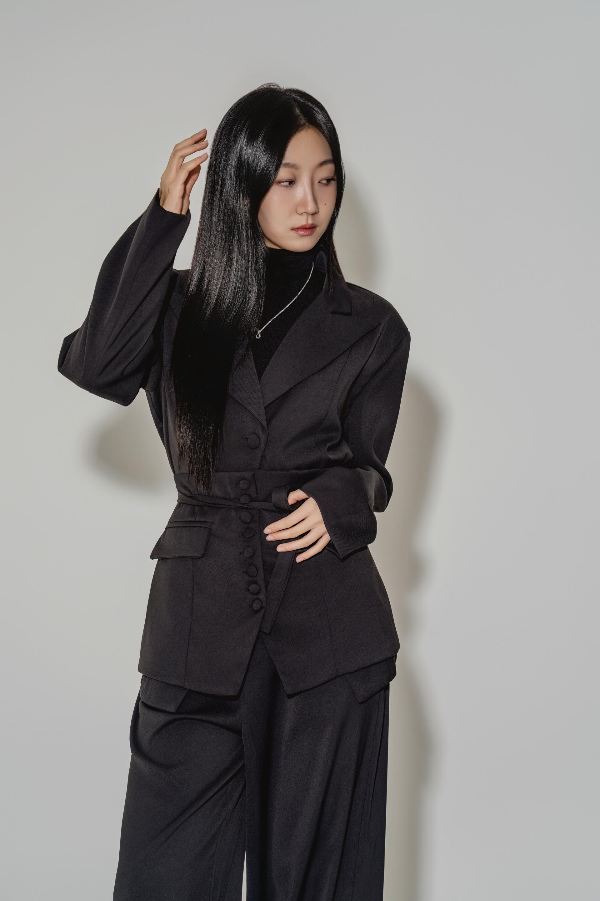 • 재킷은 테일러드 카라와 한쪽으로 겹쳐지는 여밈이 포인트. 단추 라인과 겹침이 실루엣을 단단하게 잡아줍니다.