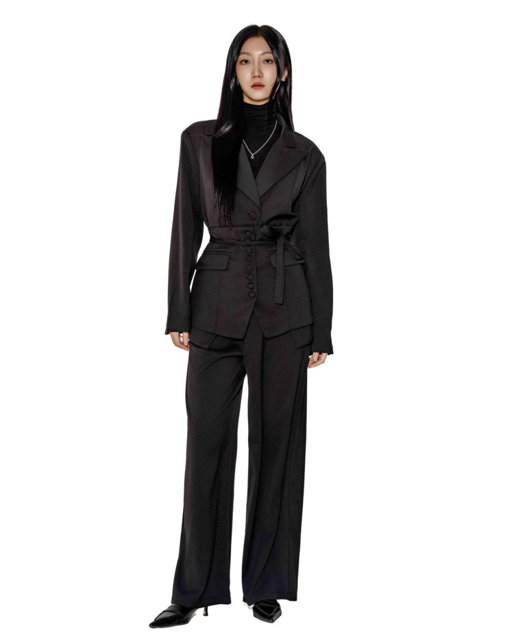 • 프론트 버튼 디테일이 이어지는 구조라 상체 중심이 흐트러지지 않고, 셋업 특유의 정돈감이 살아나요.
