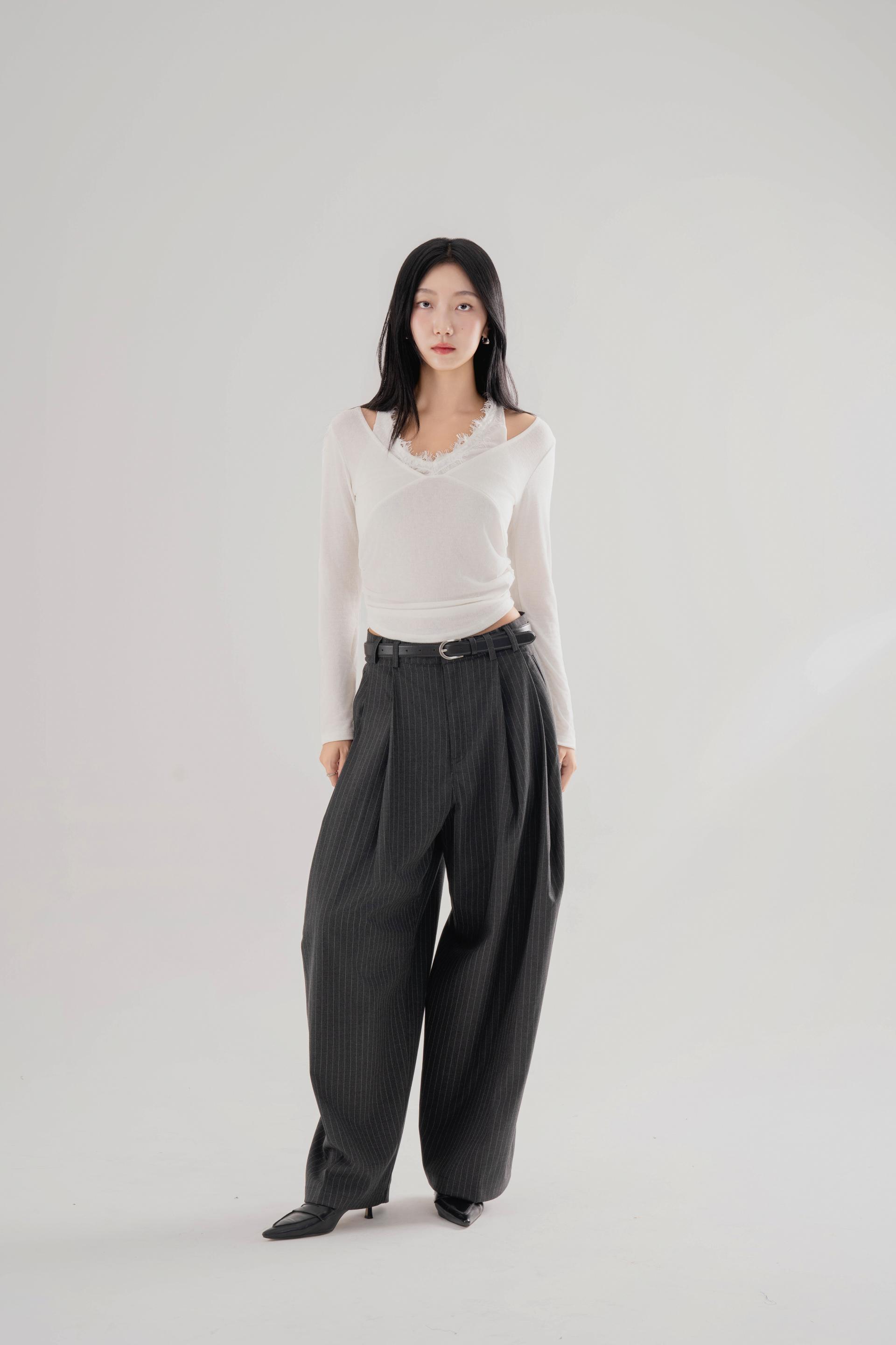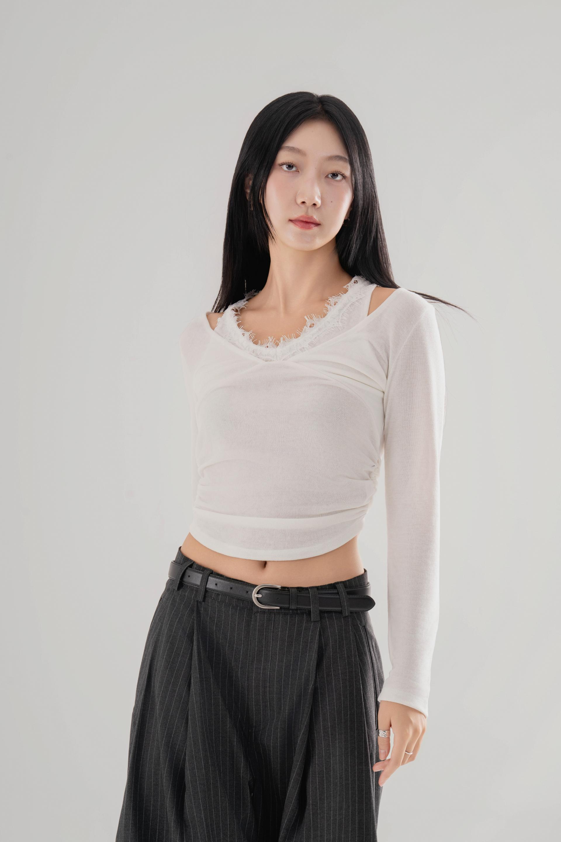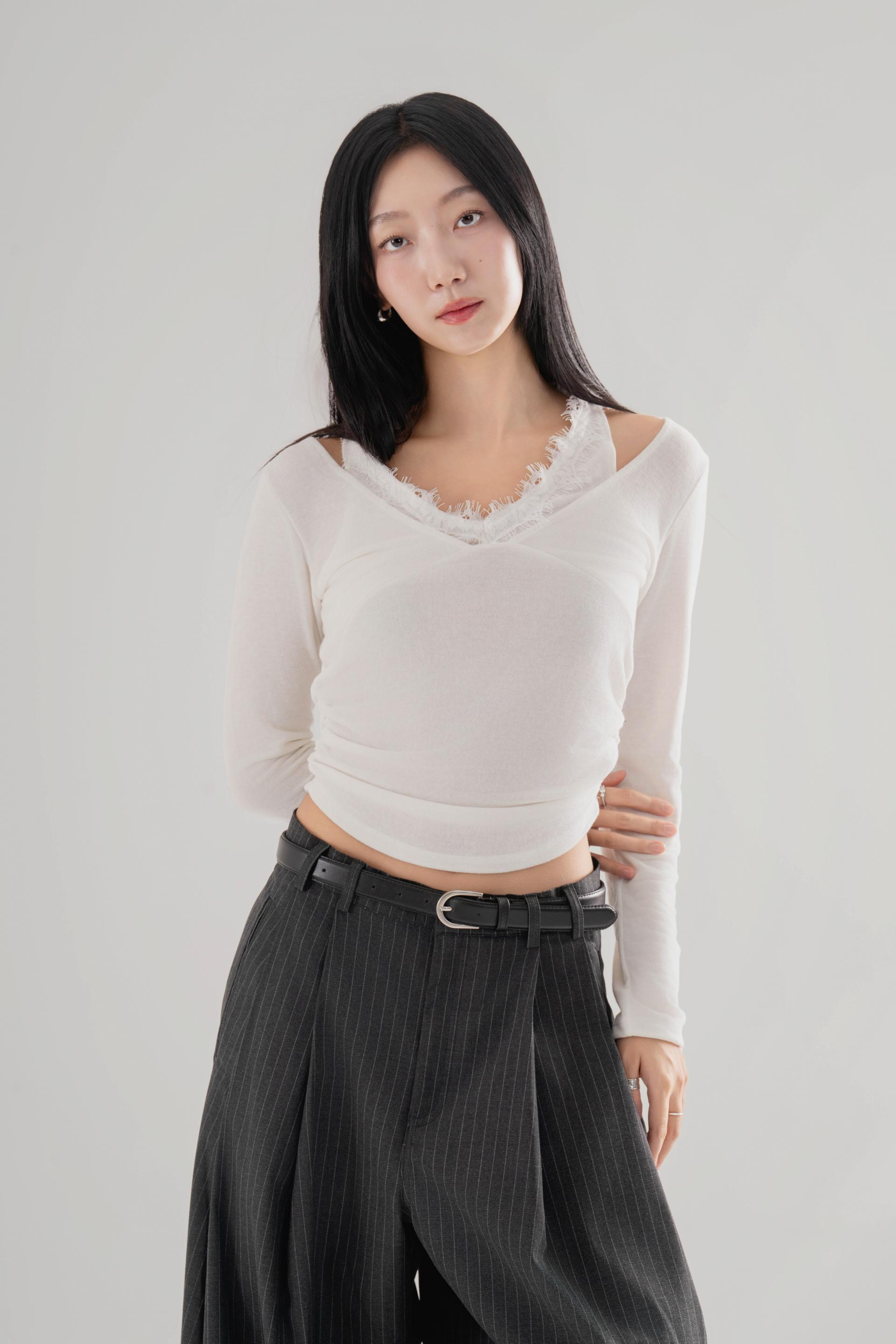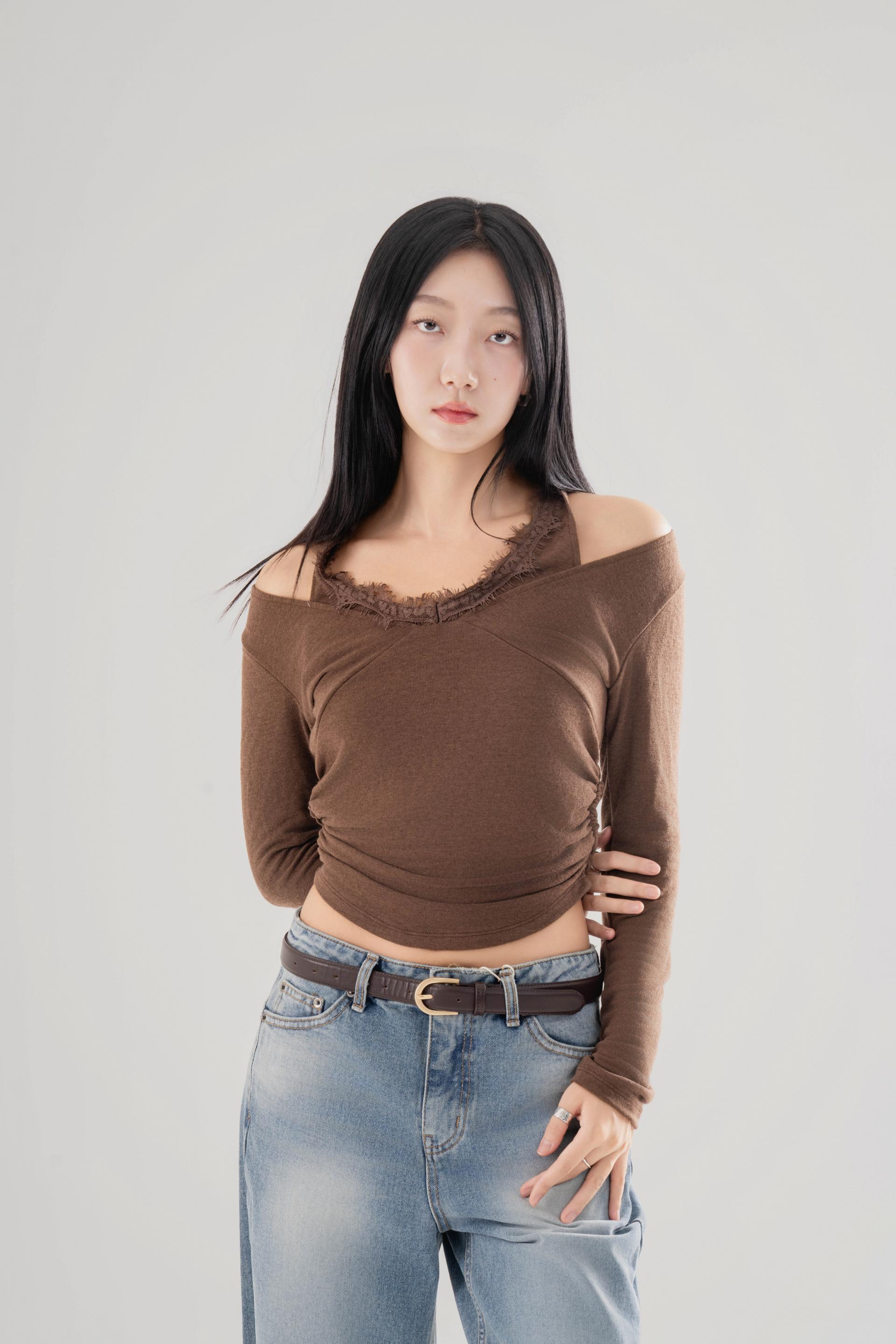 • 넥 라인 안쪽에 레이스 트리밍 이너가 레이어드된 디자인입니다.