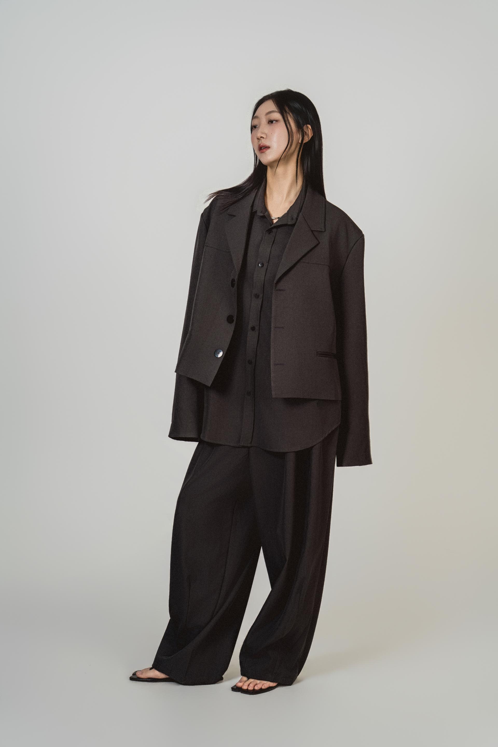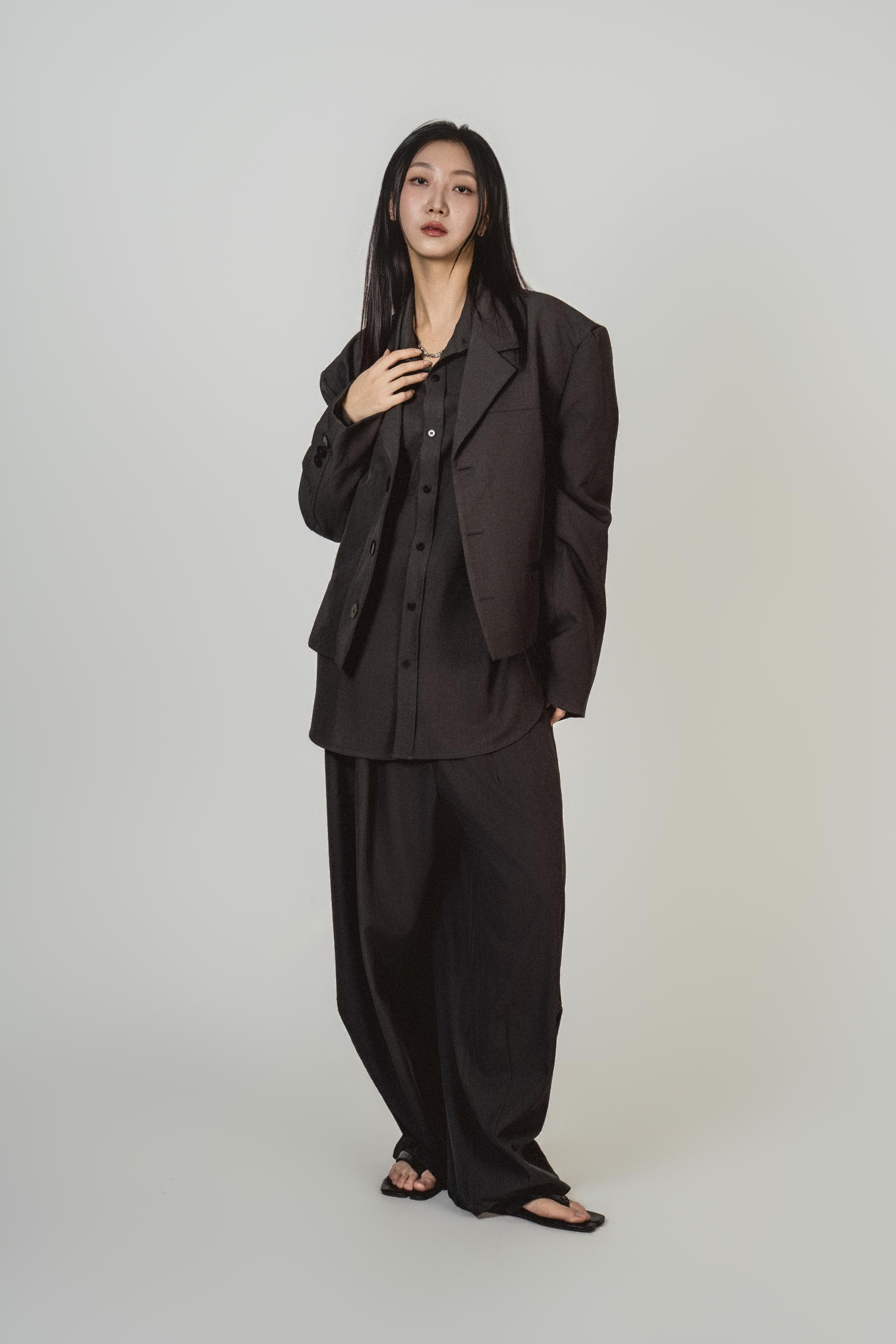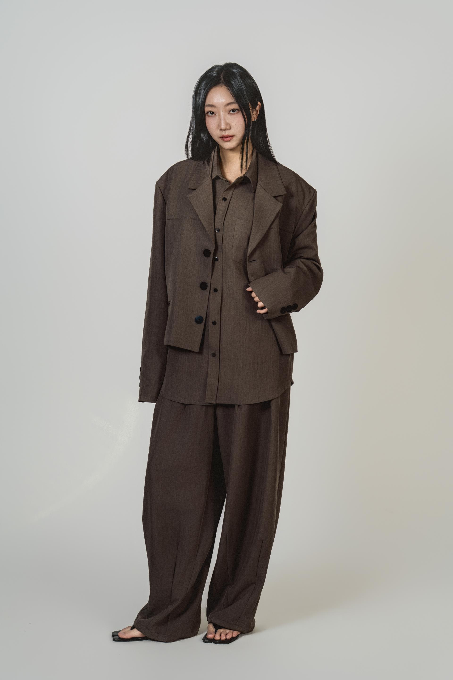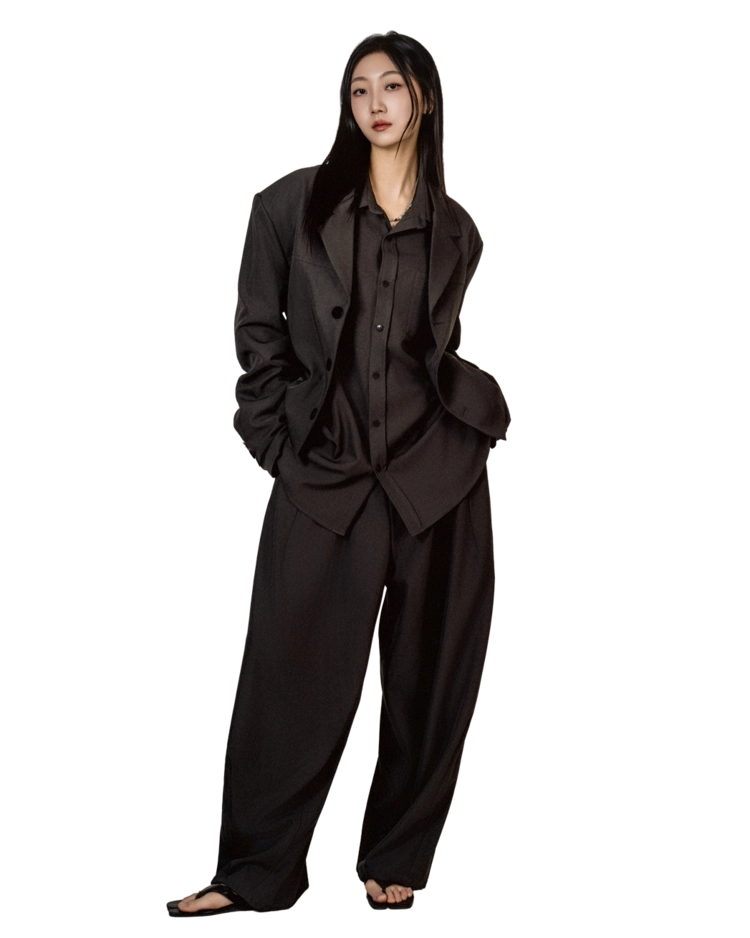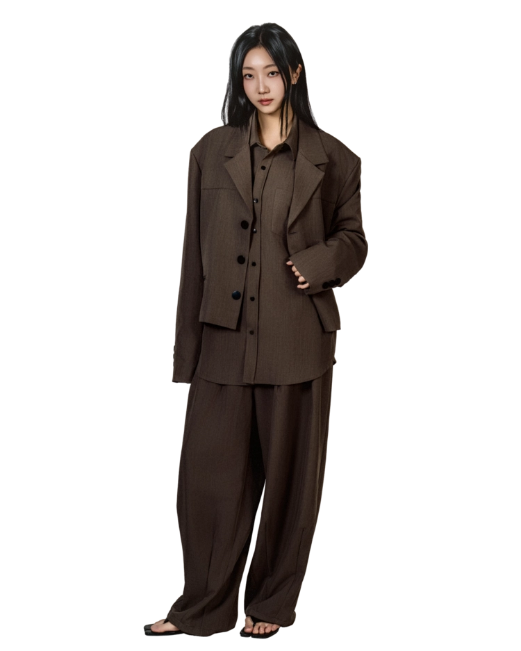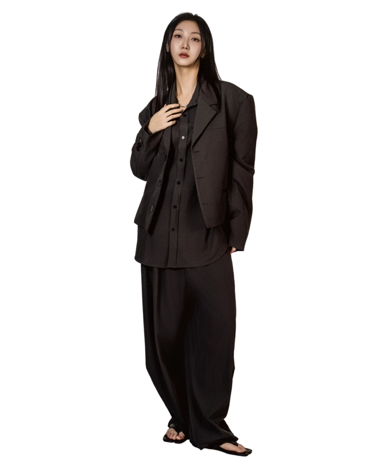 • 자켓+셔츠+와이드 팬츠가 한 번에 완성되는 쓰리피스 구성으로, 레이어드의 깊이를 살린 셋업입니다.