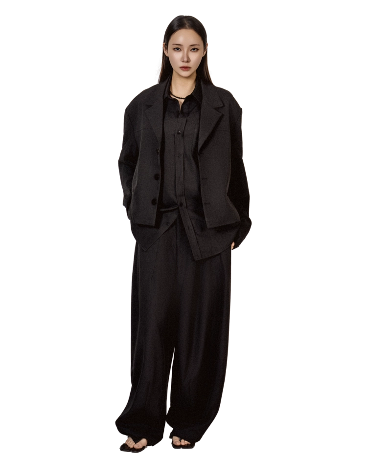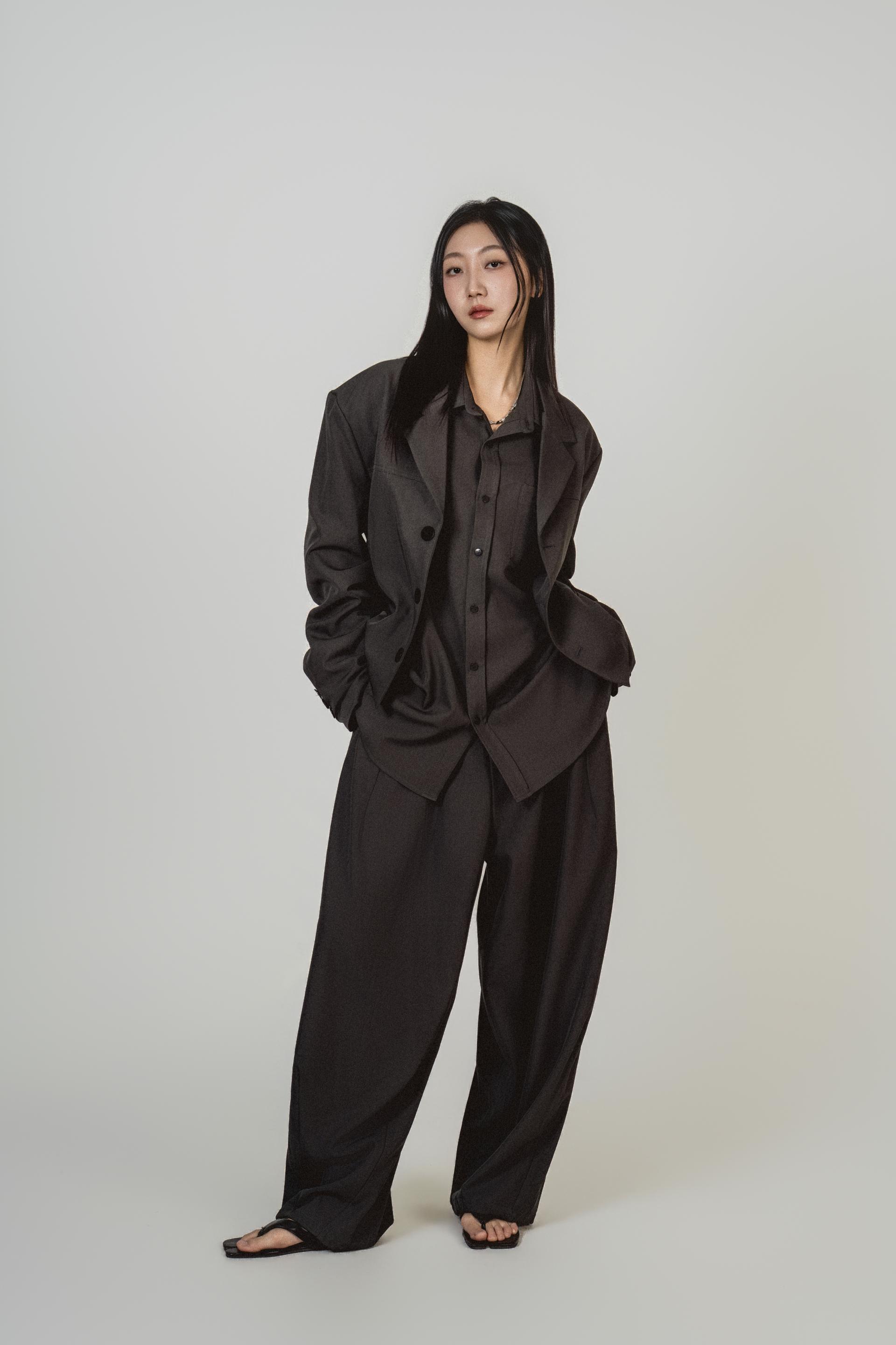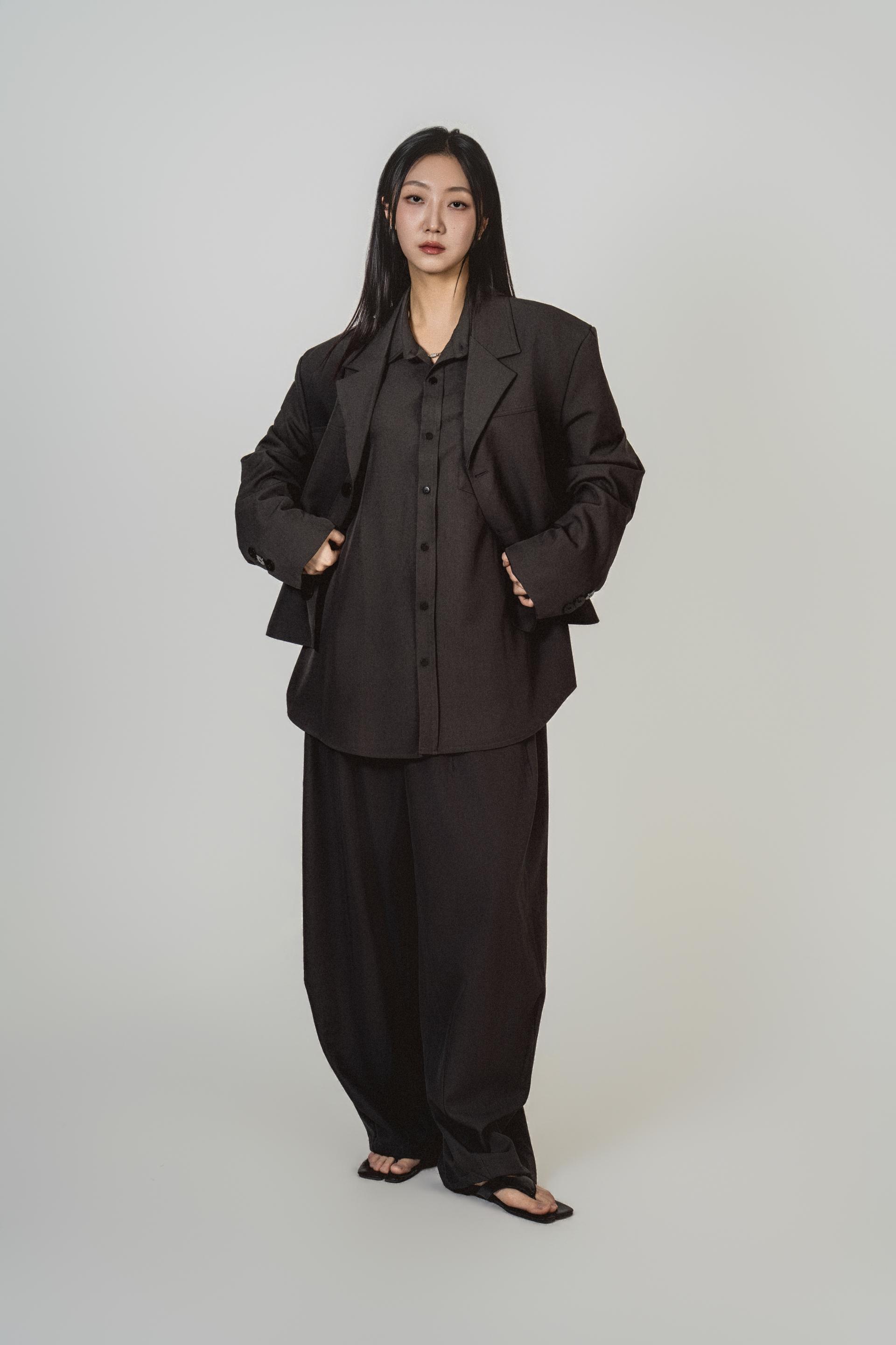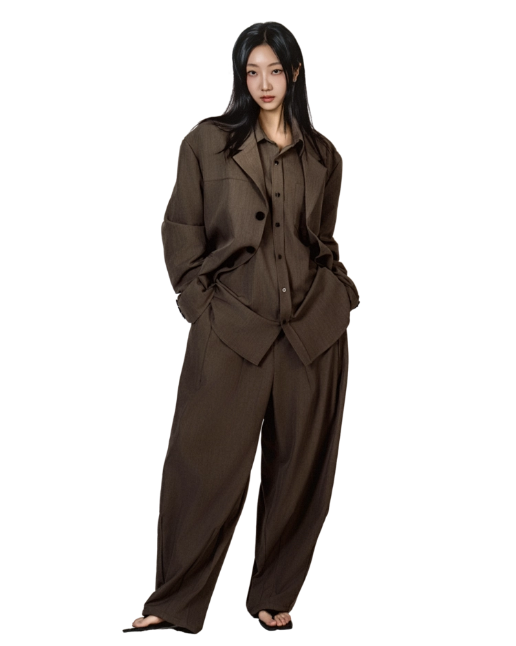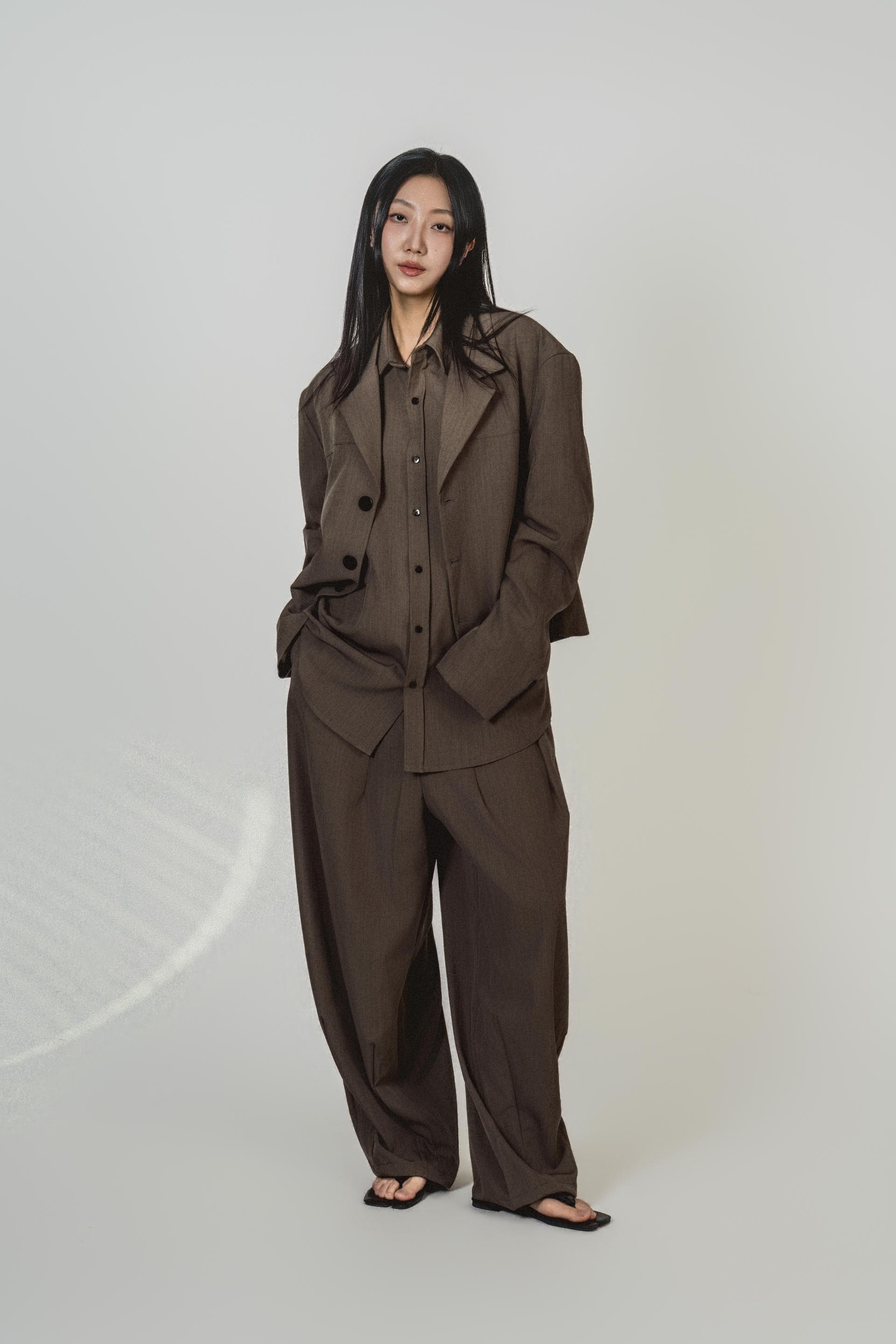 • 자켓+셔츠+와이드 팬츠가 한 번에 완성되는 쓰리피스 구성으로, 레이어드의 깊이를 살린 셋업입니다.