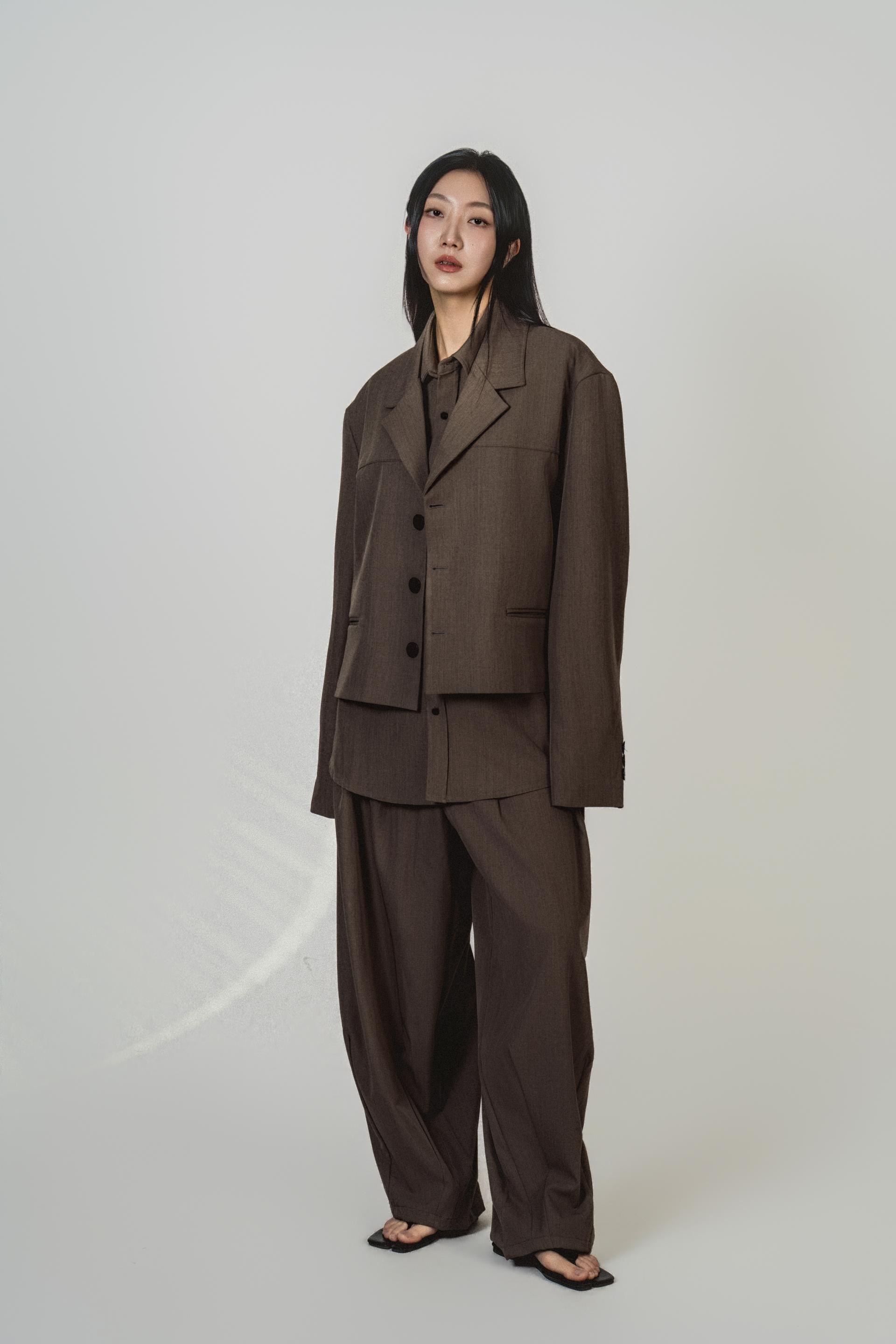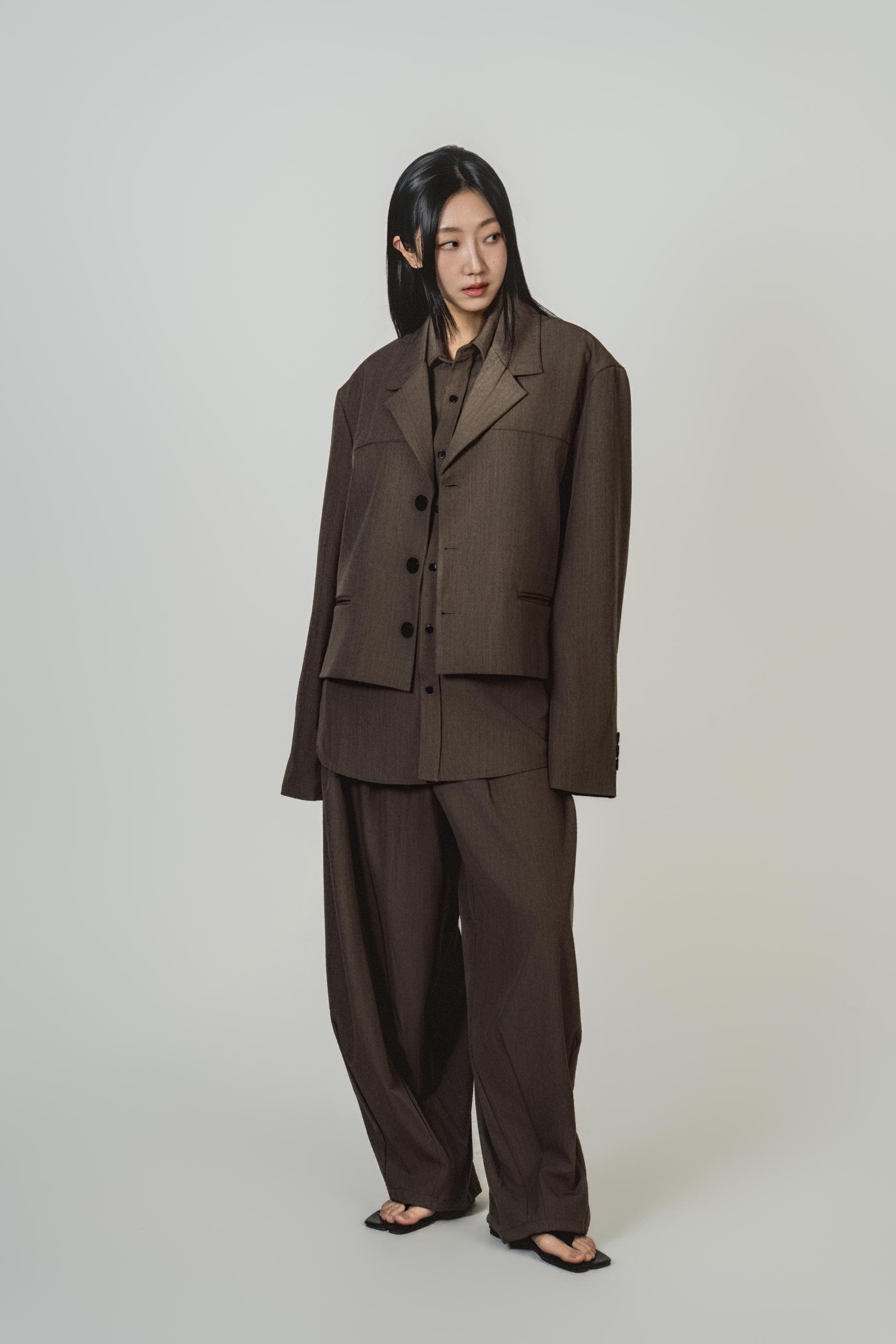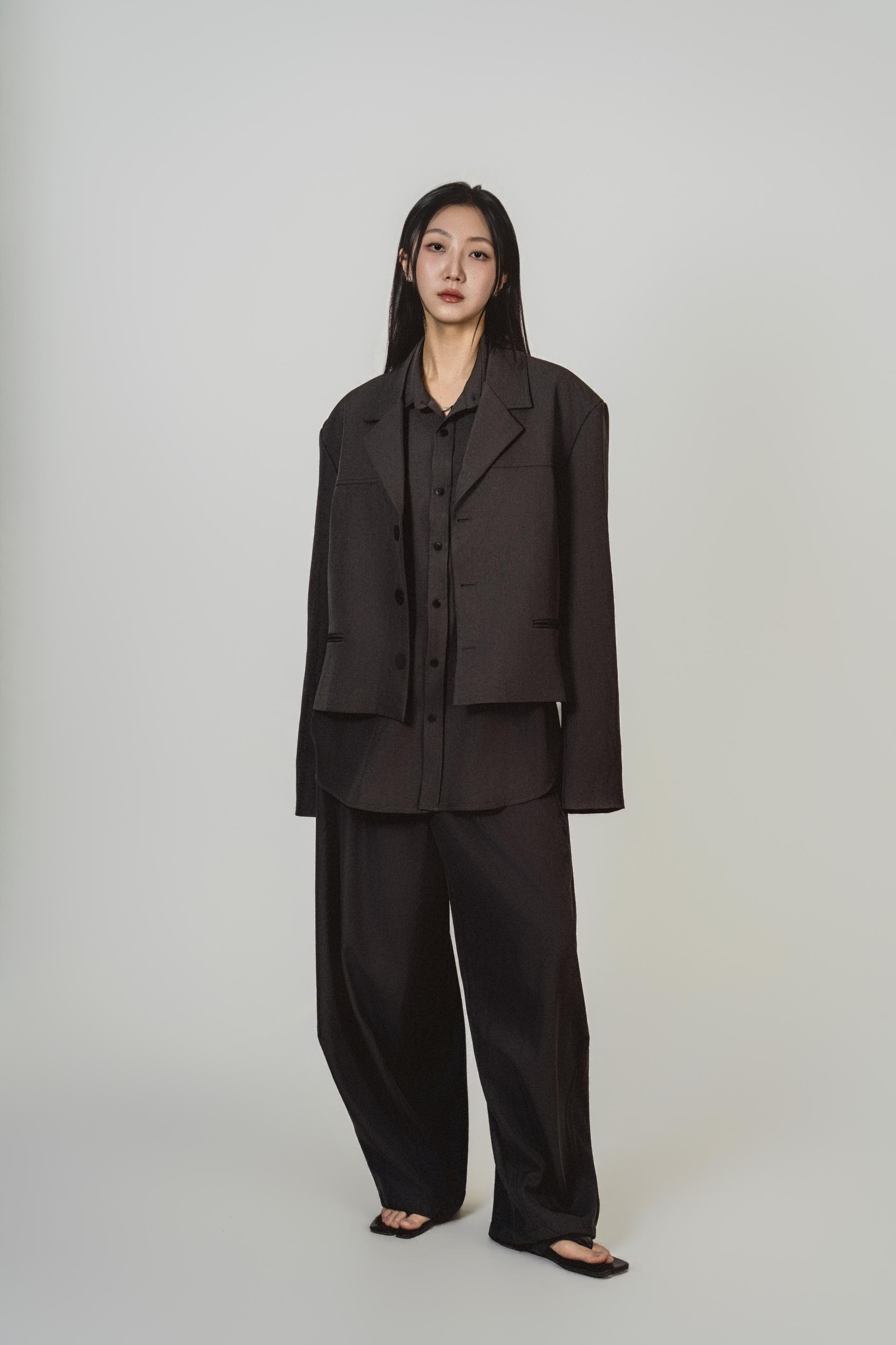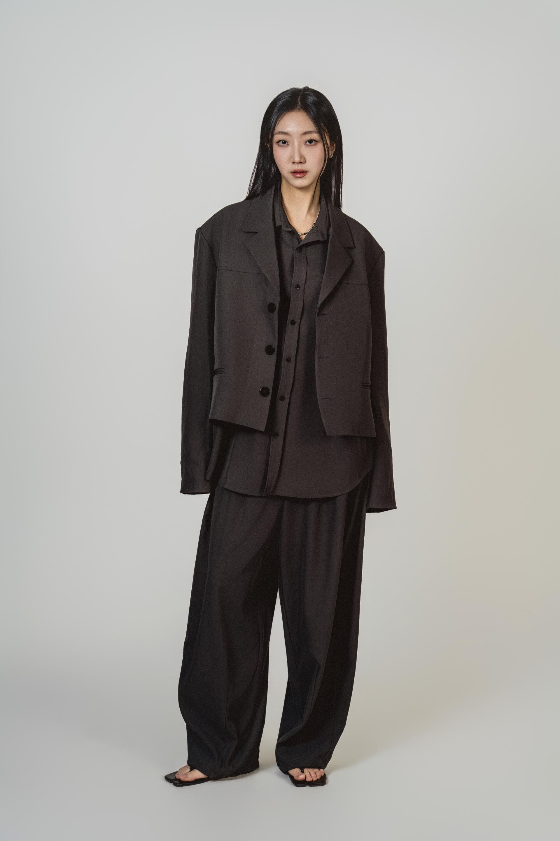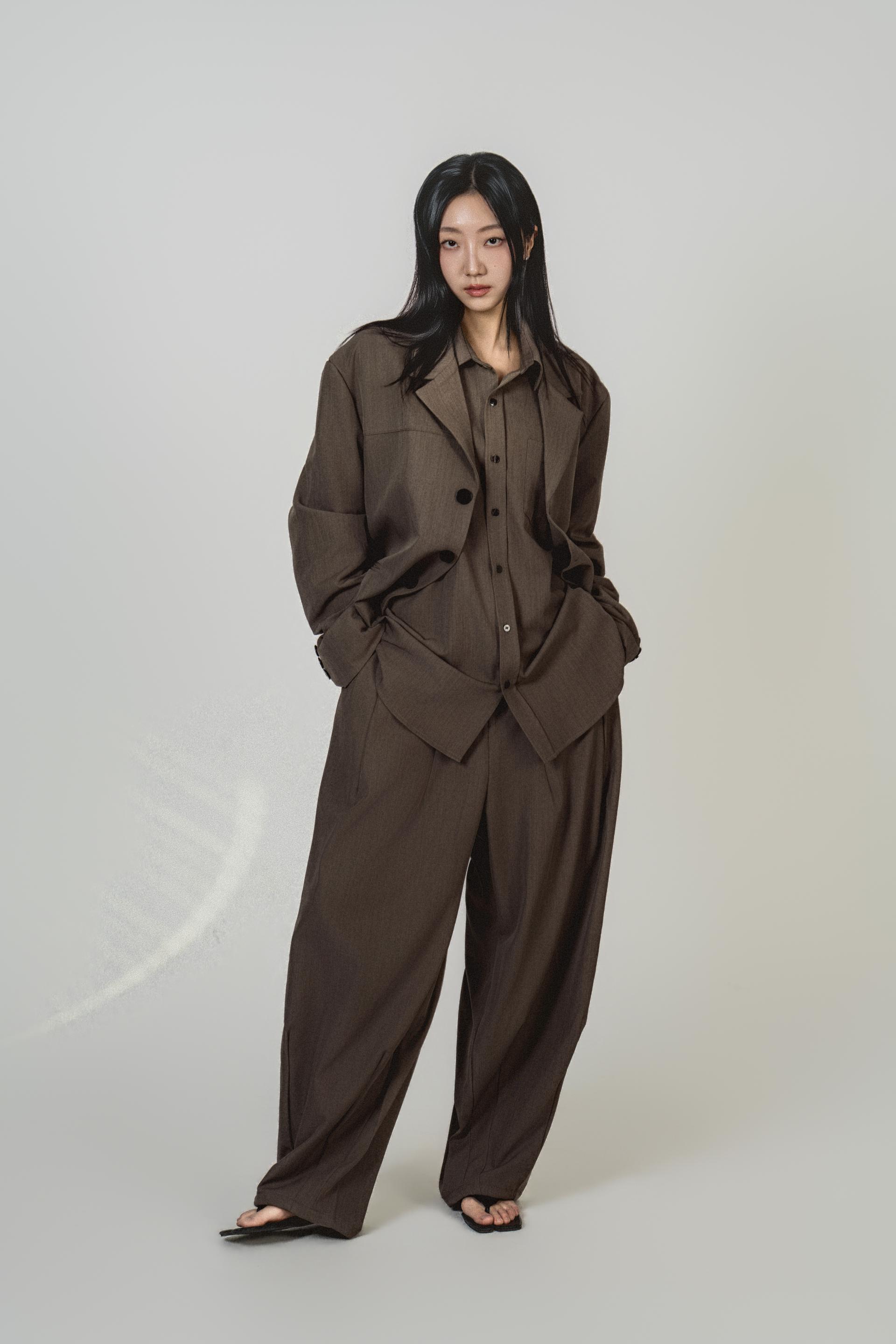• 자켓+셔츠+와이드 팬츠가 한 번에 완성되는 쓰리피스 구성으로, 레이어드의 깊이를 살린 셋업입니다.