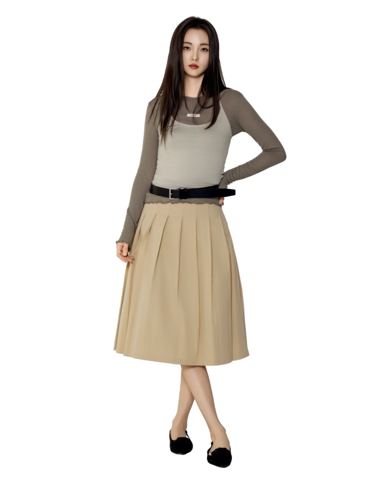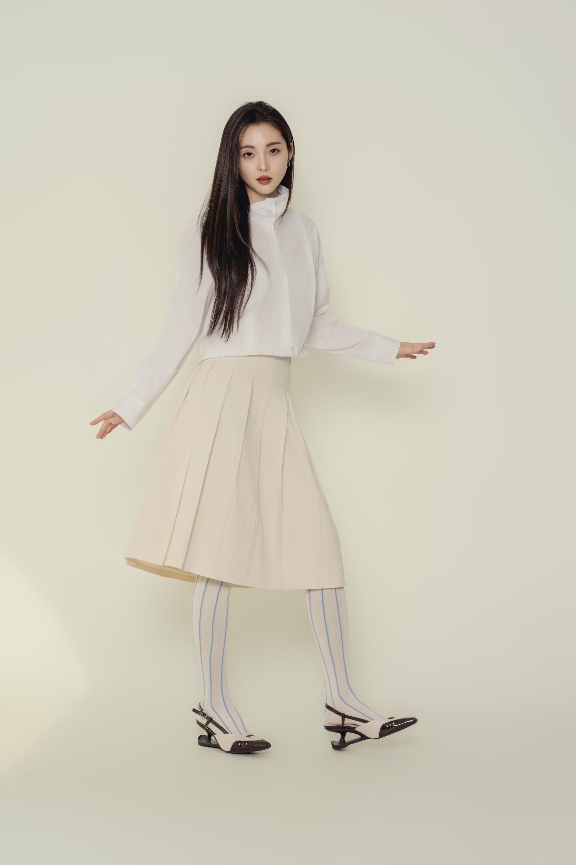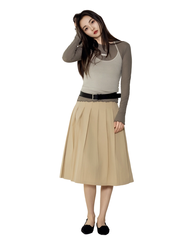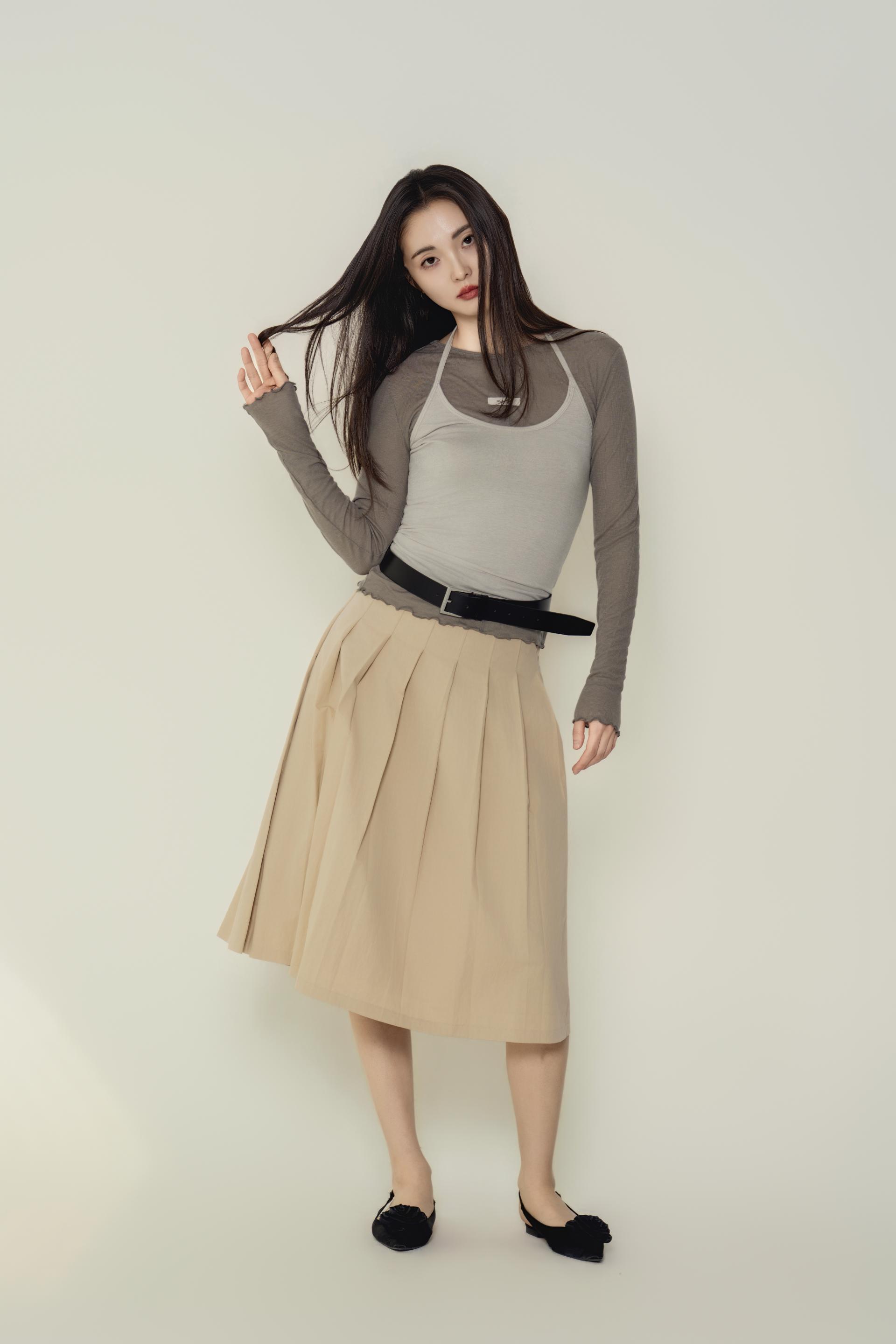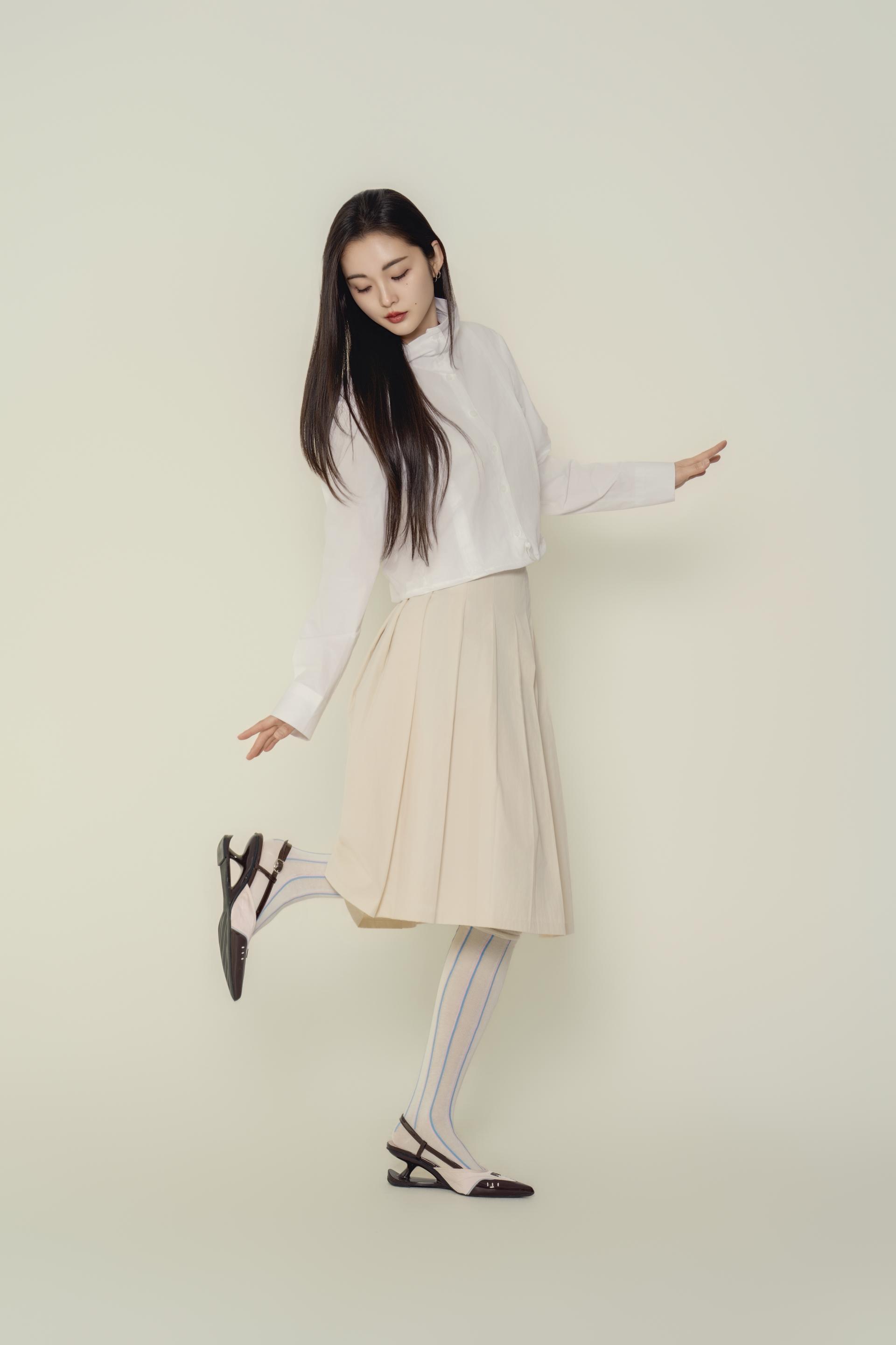 • 움직일 때 플리츠가 자연스럽게 벌어졌다가 다시 모이며, A라인 실루엣이 과하지 않게 볼륨을 만들어줍니다.
