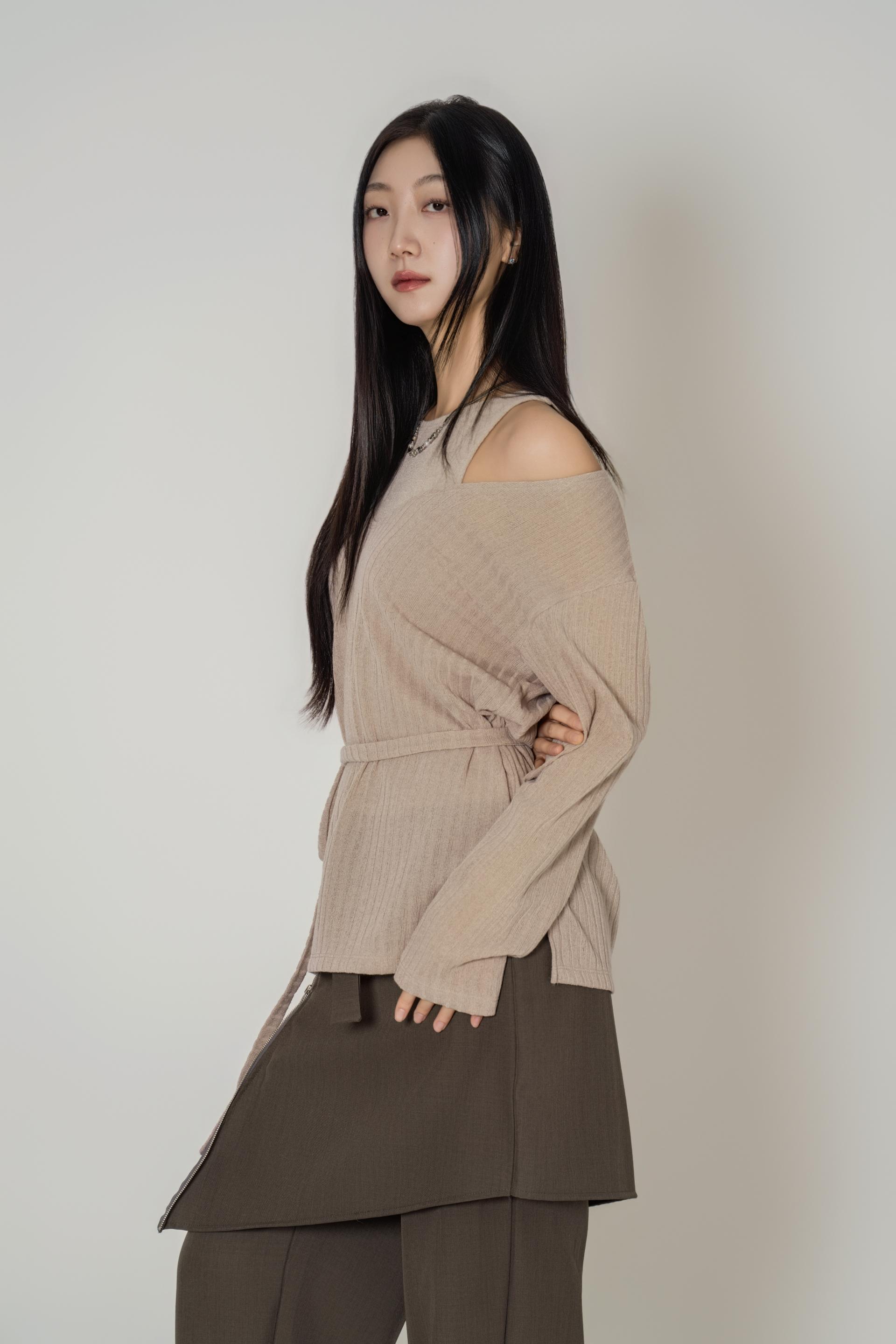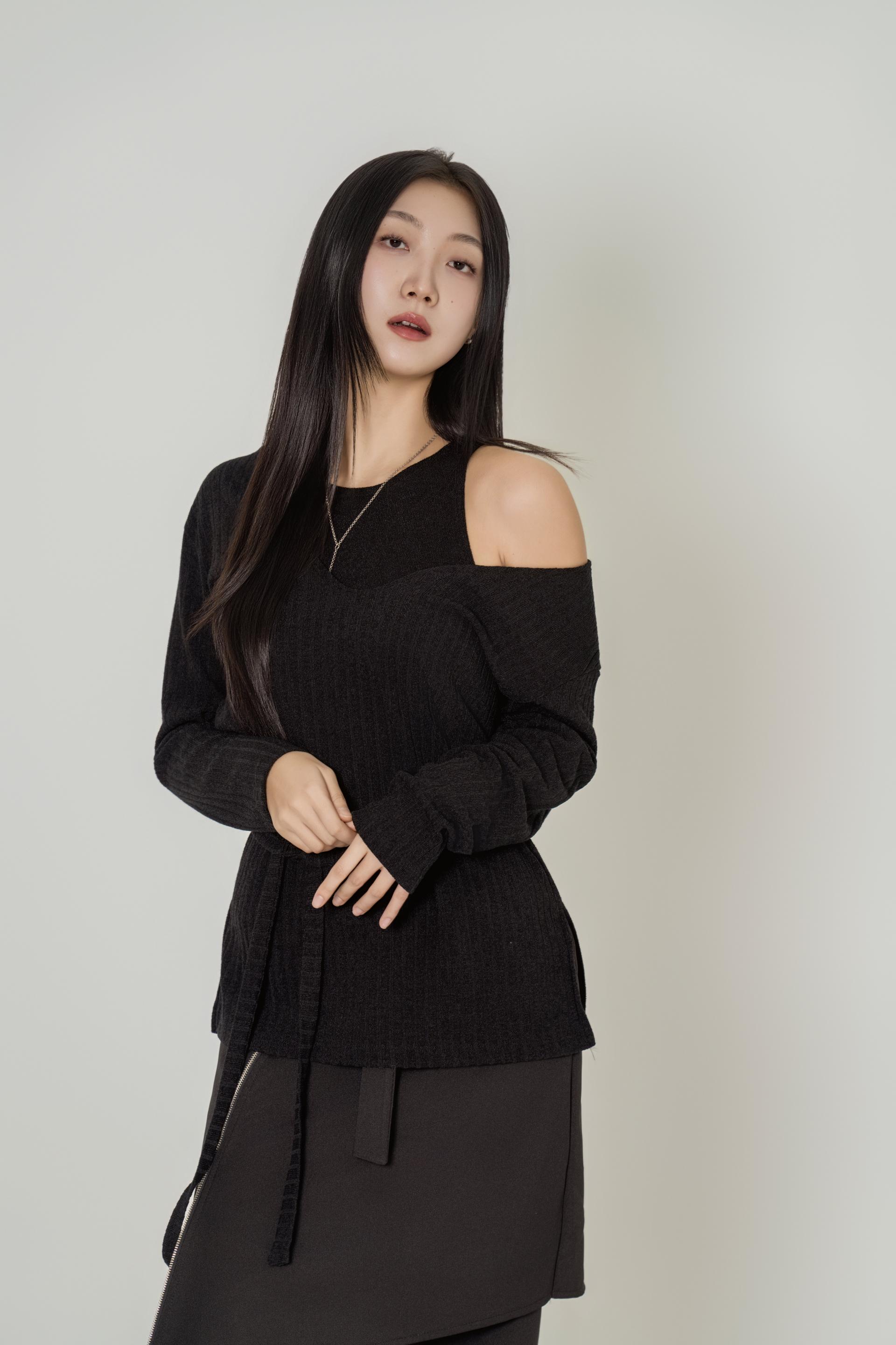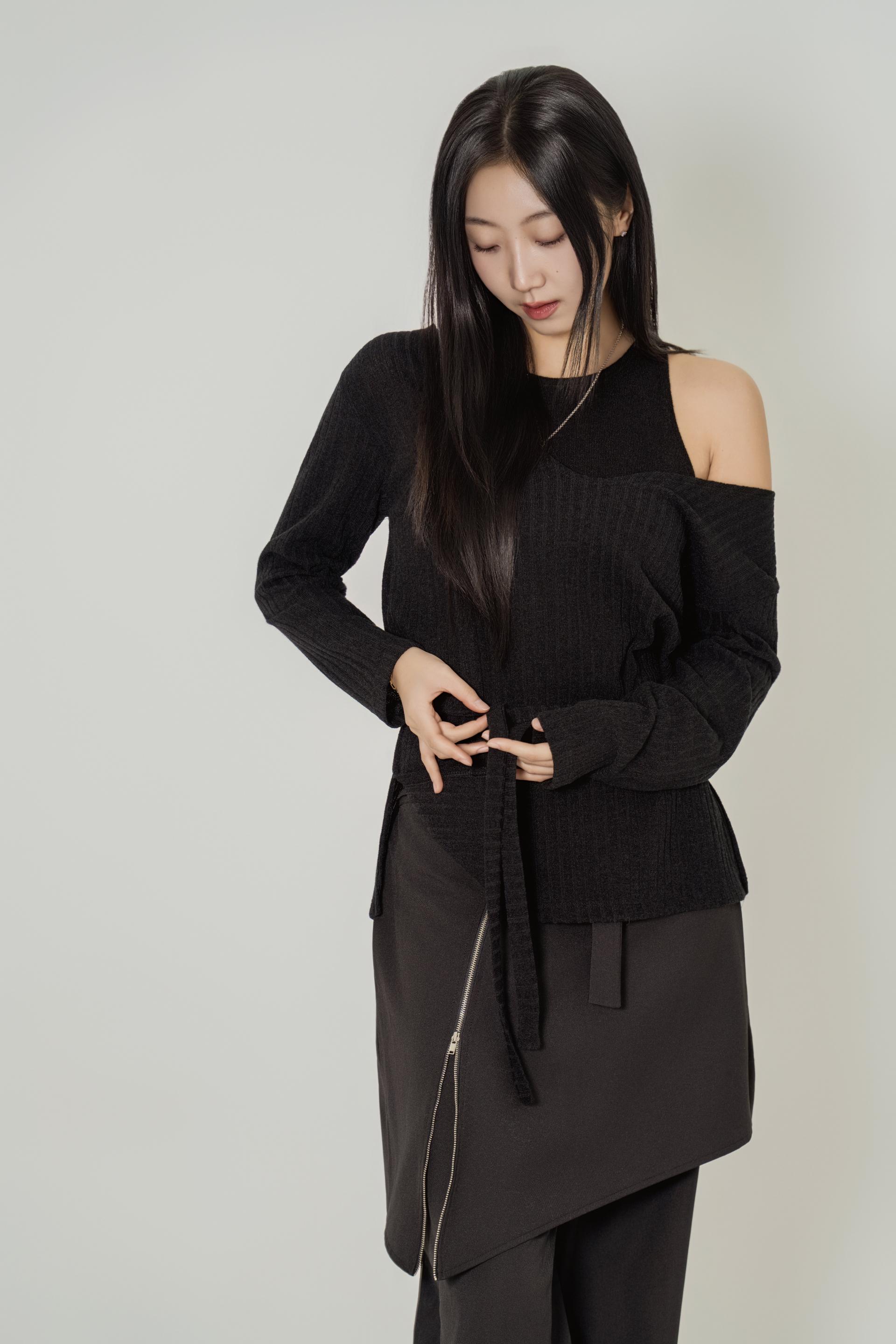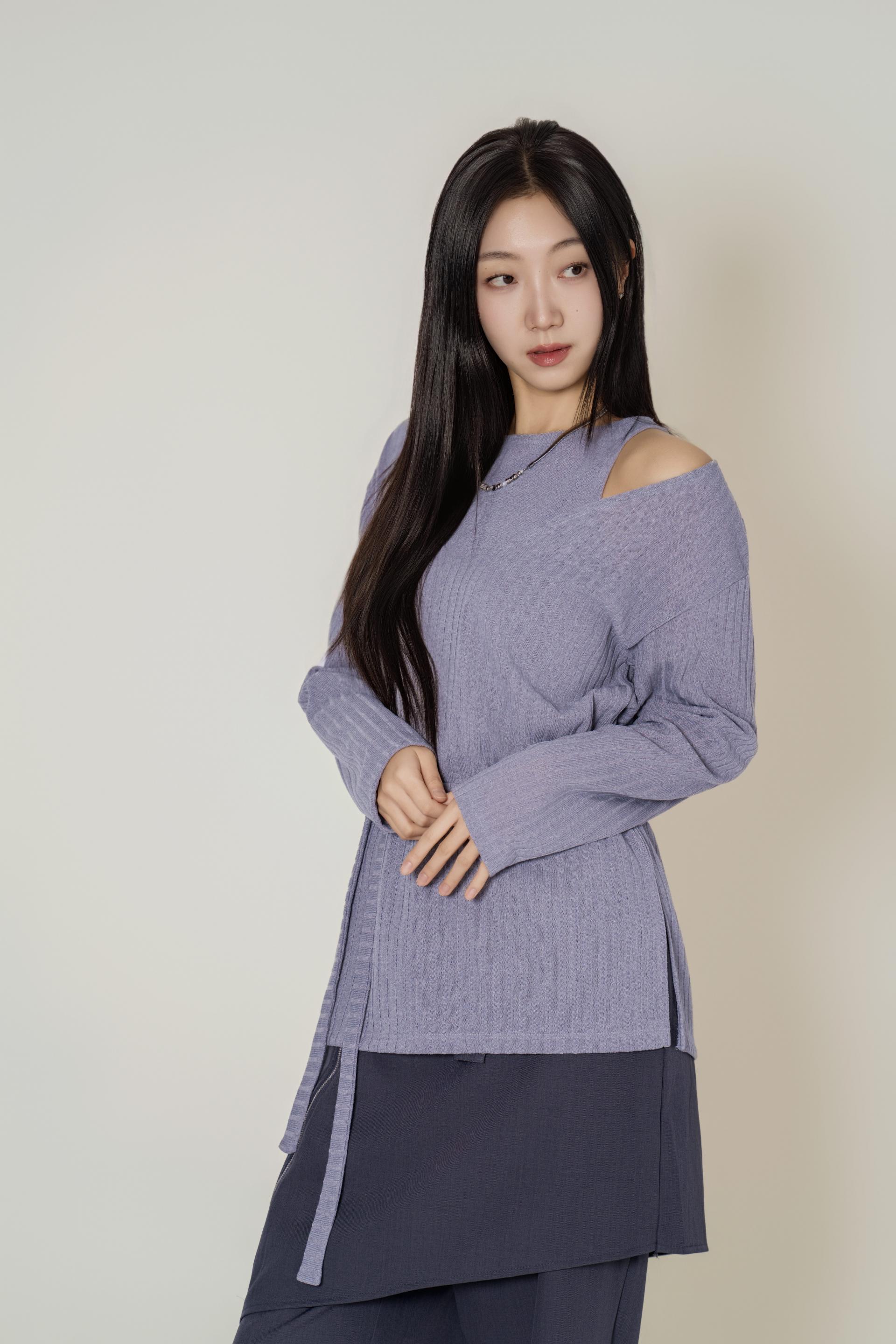 • 숄더를 자연스럽게 흐르는 넥 라인이 포인트인 골지 니트 탑이에요.