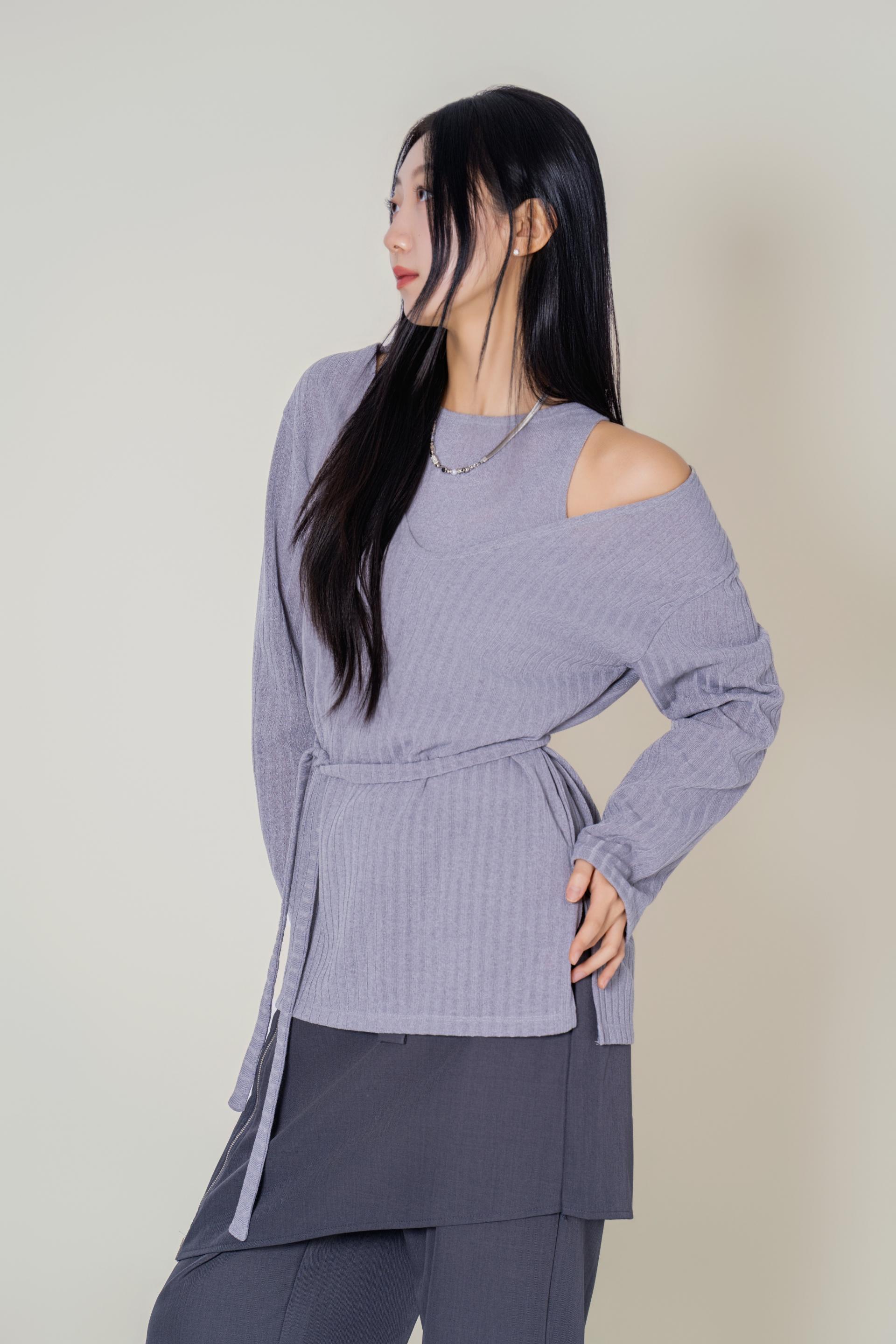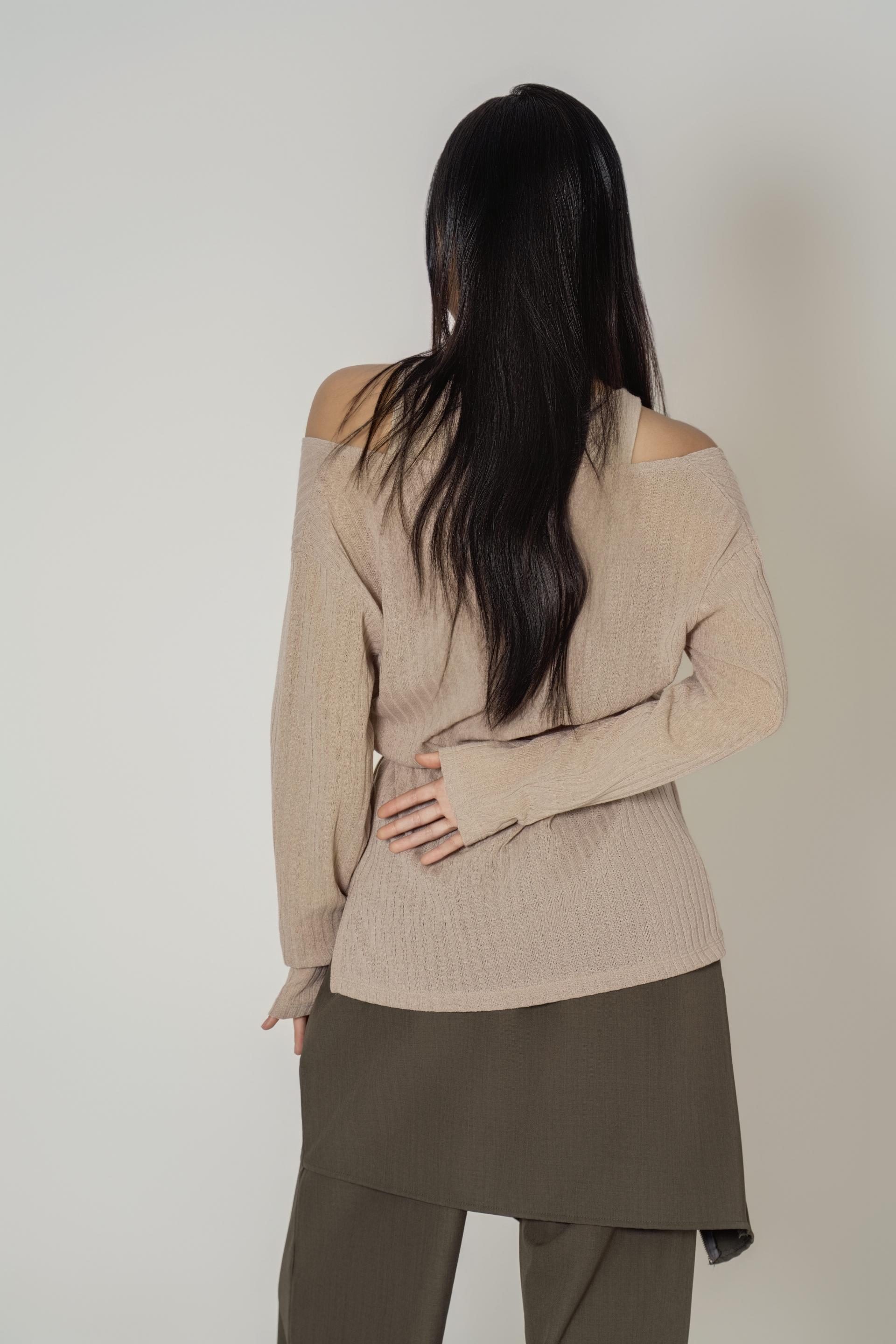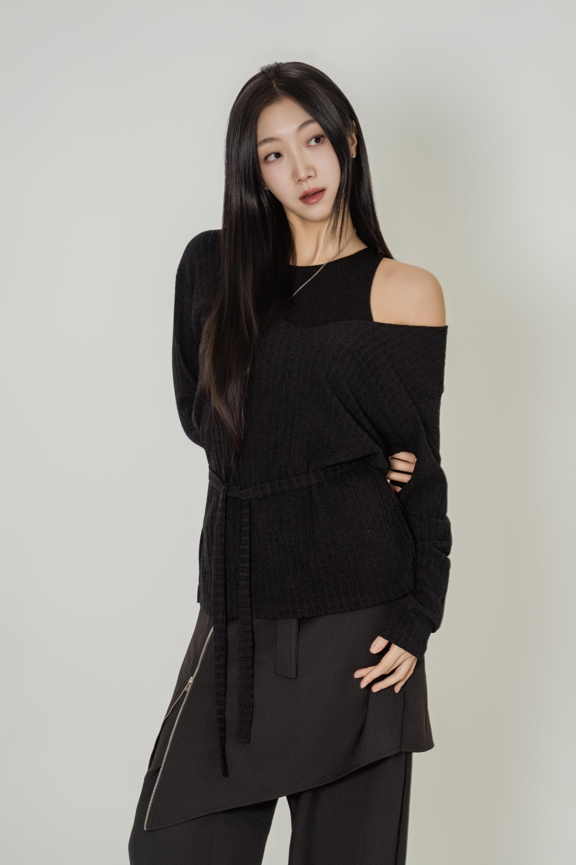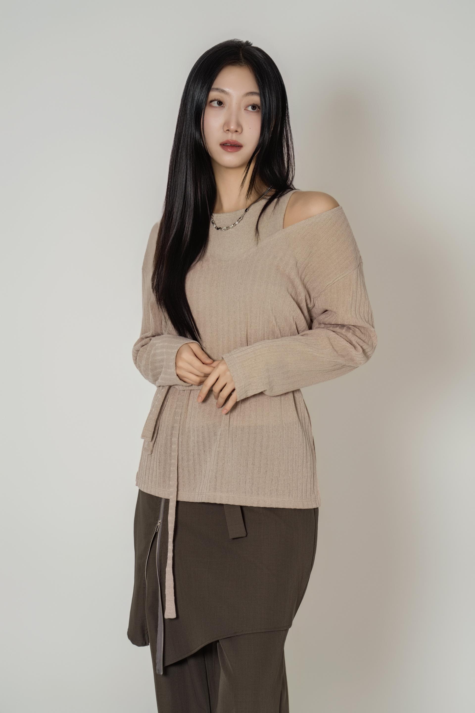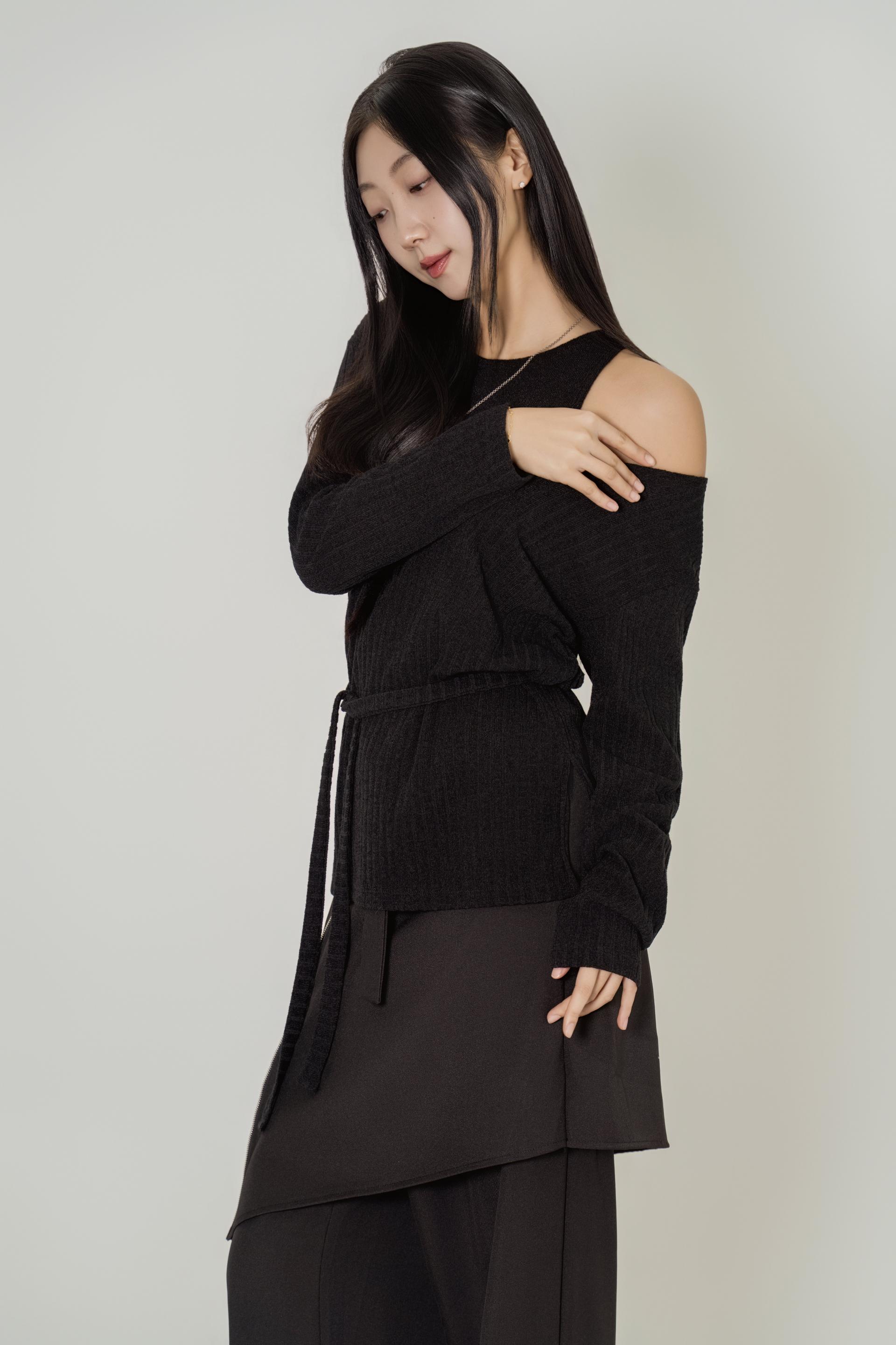 • 숄더를 자연스럽게 흐르는 넥 라인이 포인트인 골지 니트 탑이에요.