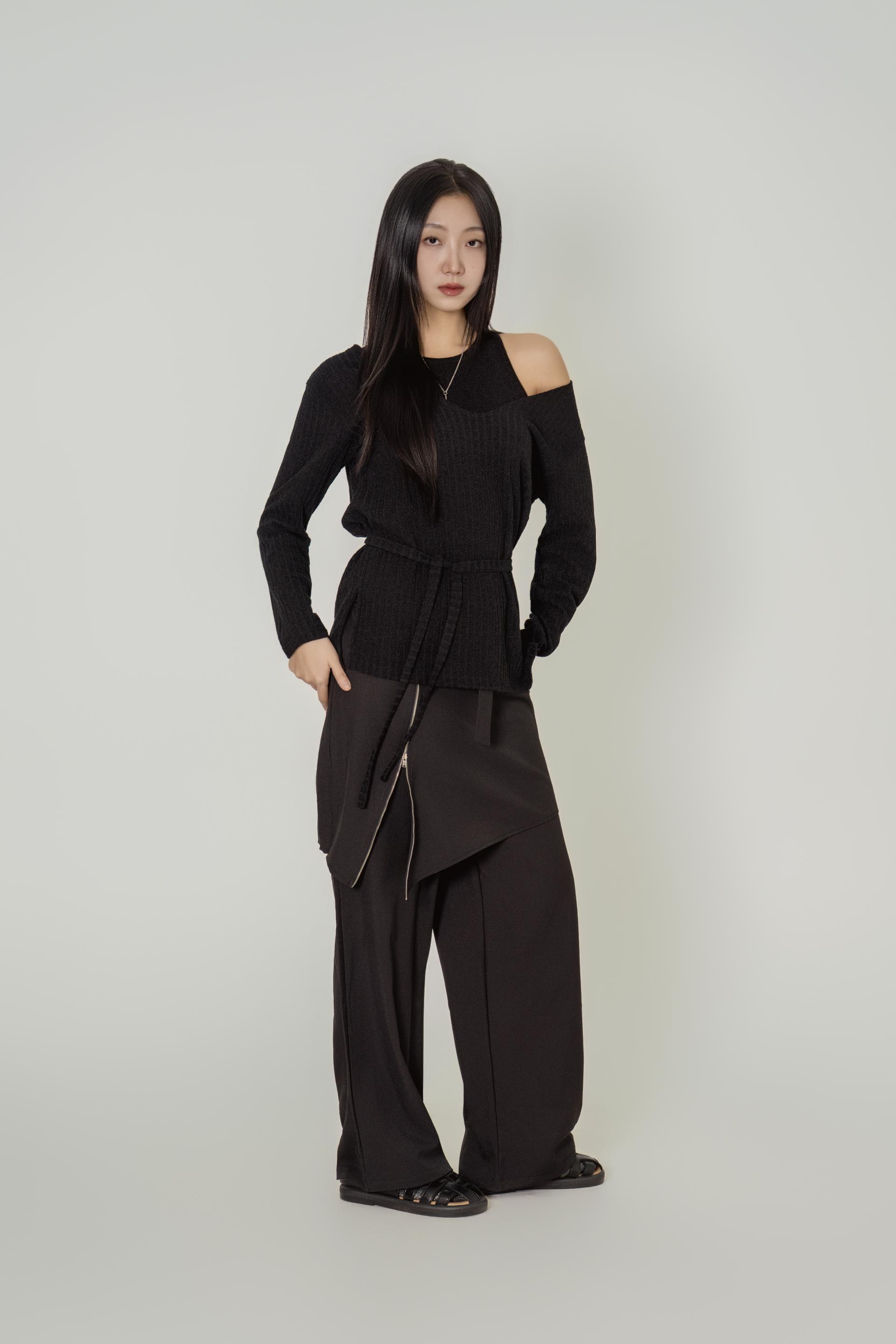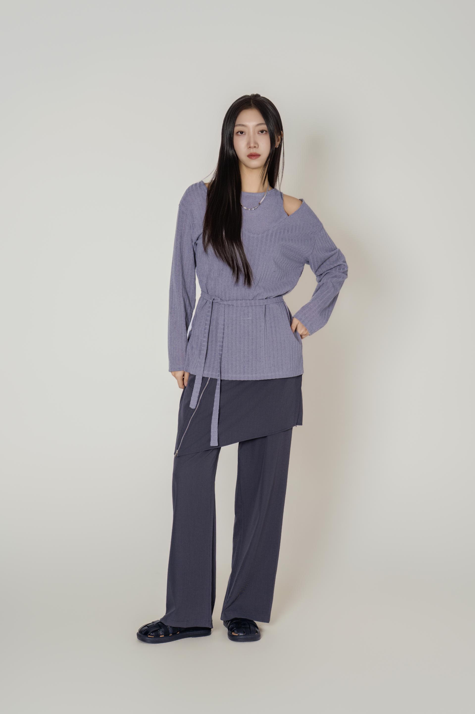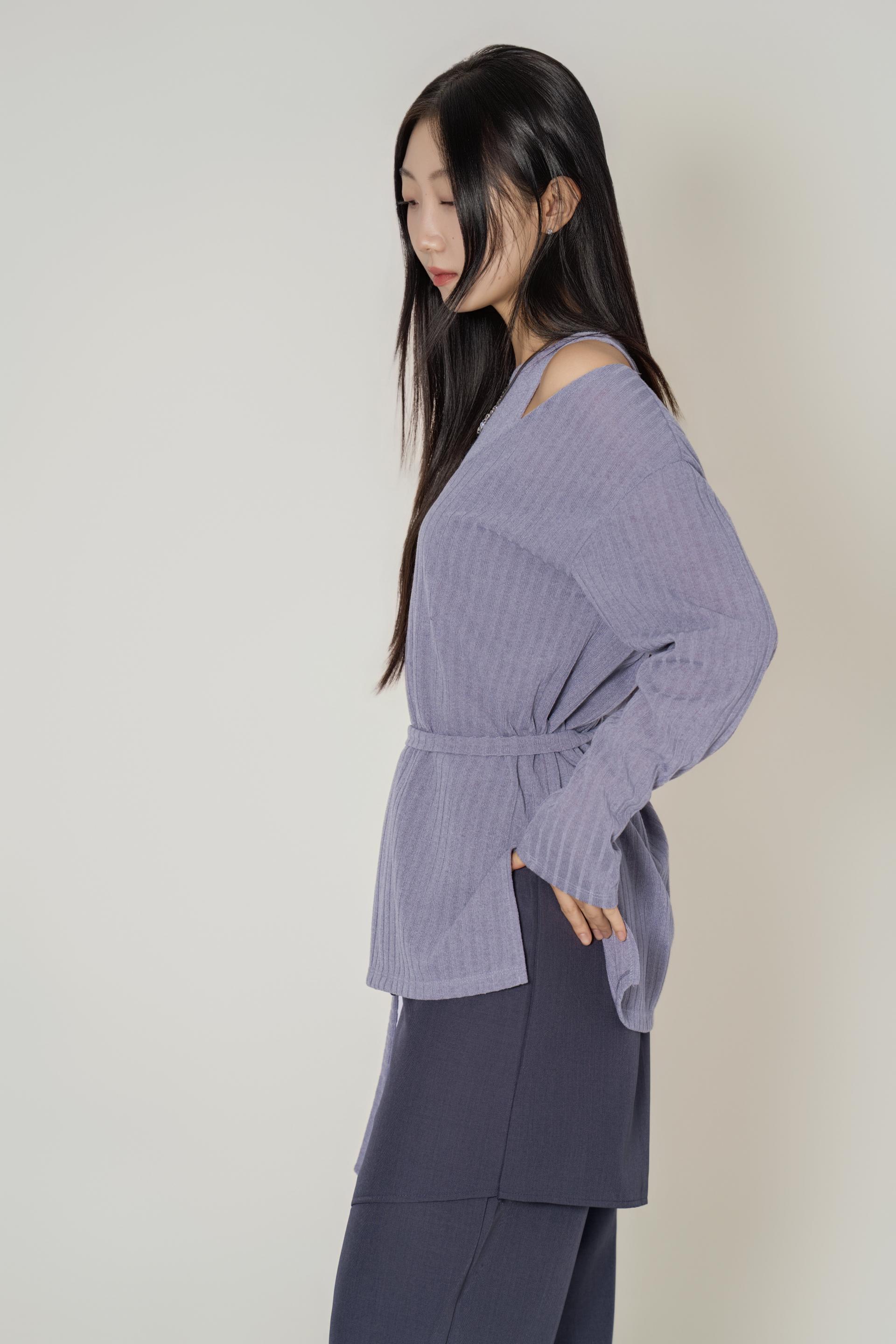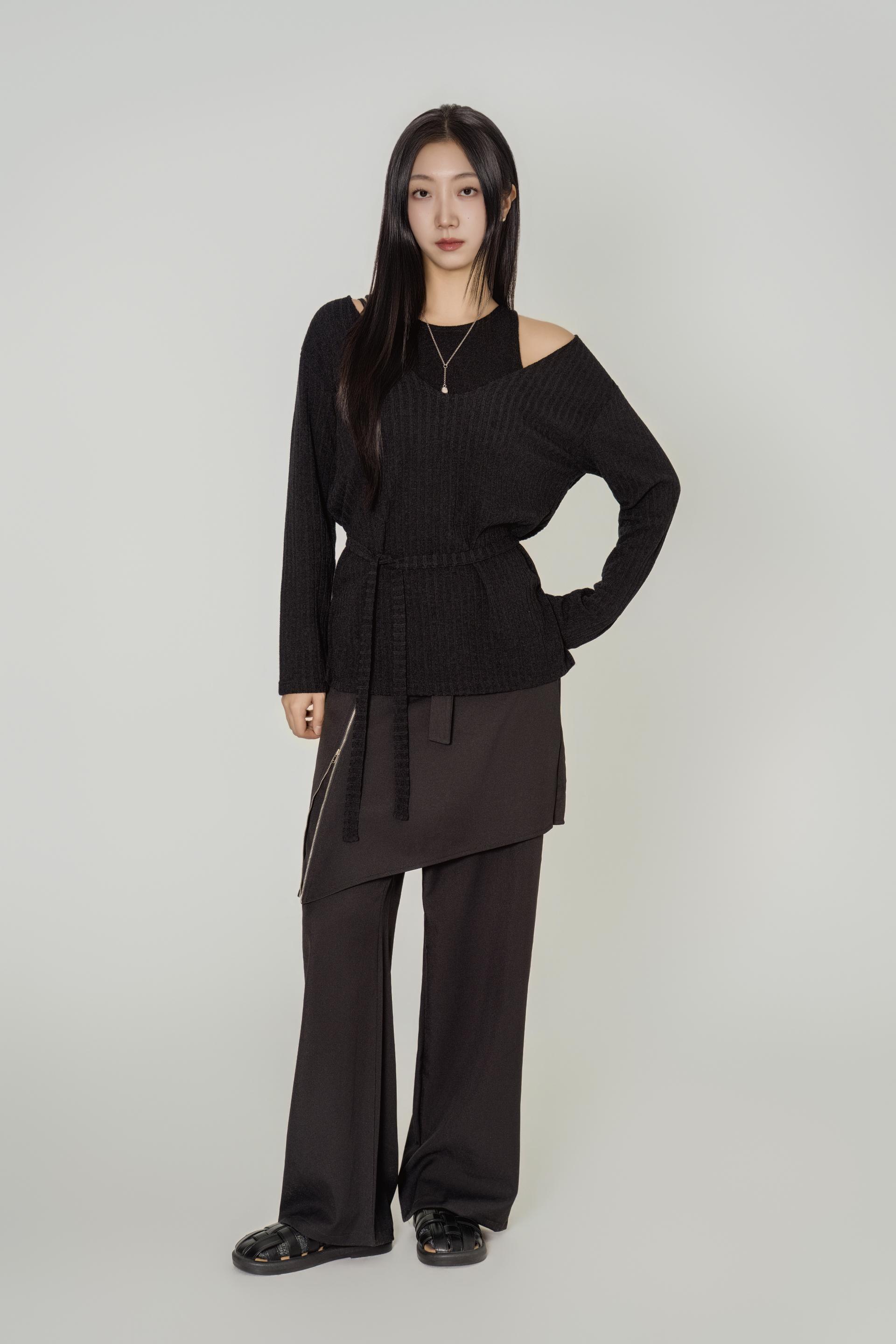 • 숄더를 자연스럽게 흐르는 넥 라인이 포인트인 골지 니트 탑이에요.
